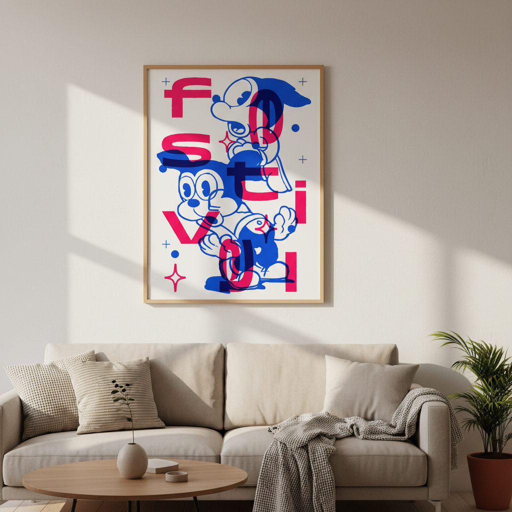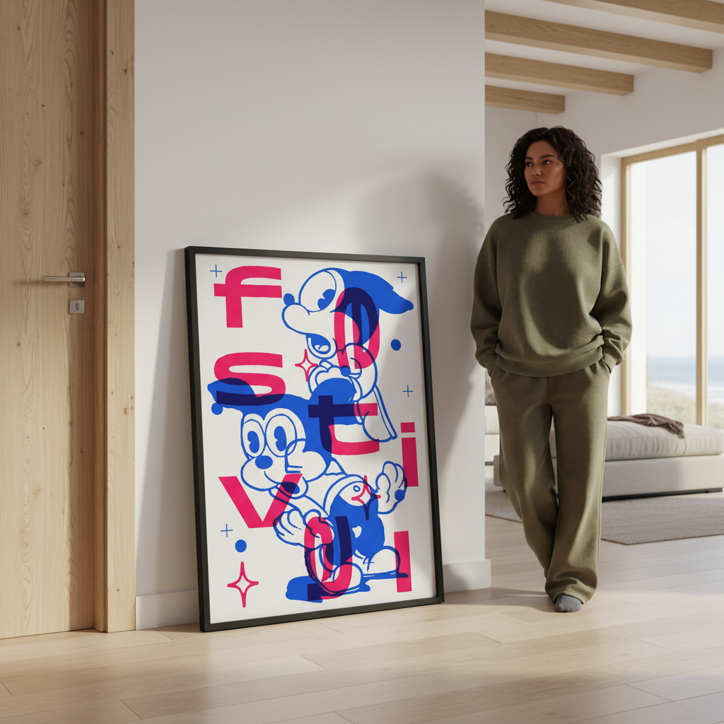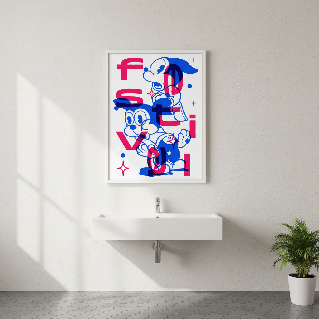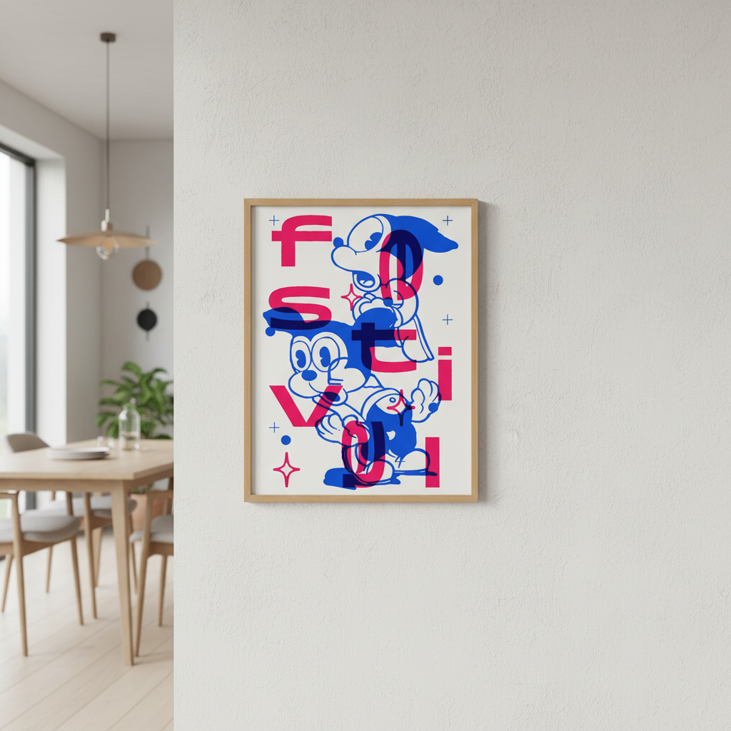 Bring joy to your walls with this vibrant artwork featuring whimsical cartoon characters dancing across a crisp white canvas. Bold, colorful text and playful graphics create an energetic focal point that sparks conversation and smiles. Perfect for adding personality to bedrooms, playrooms, or creative spaces, this piece by Jérôme Bizien captures the spirit of celebration and fun. A delightful choice for anyone who loves colour, character, and a touch of artistic whimsy.