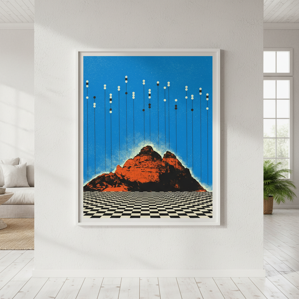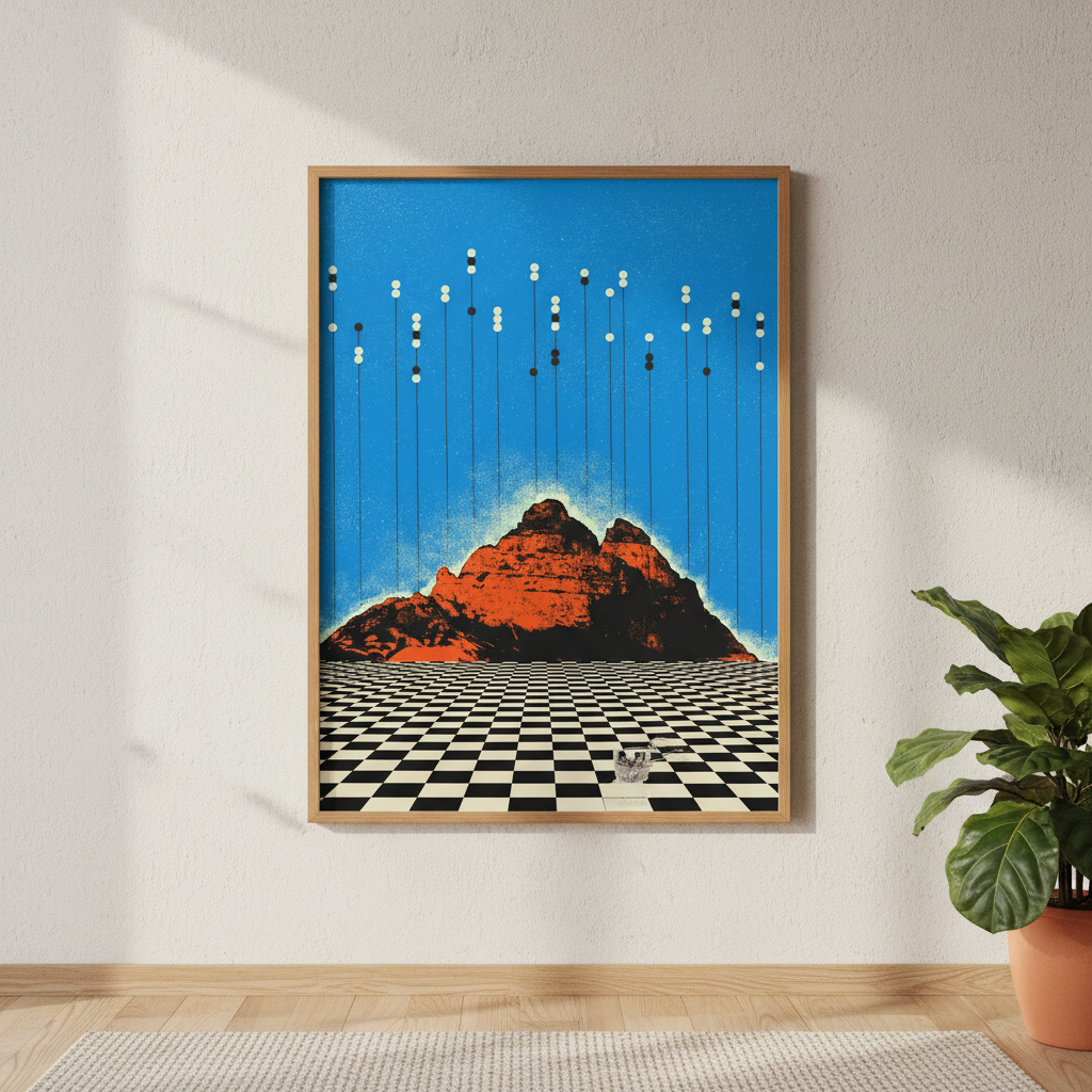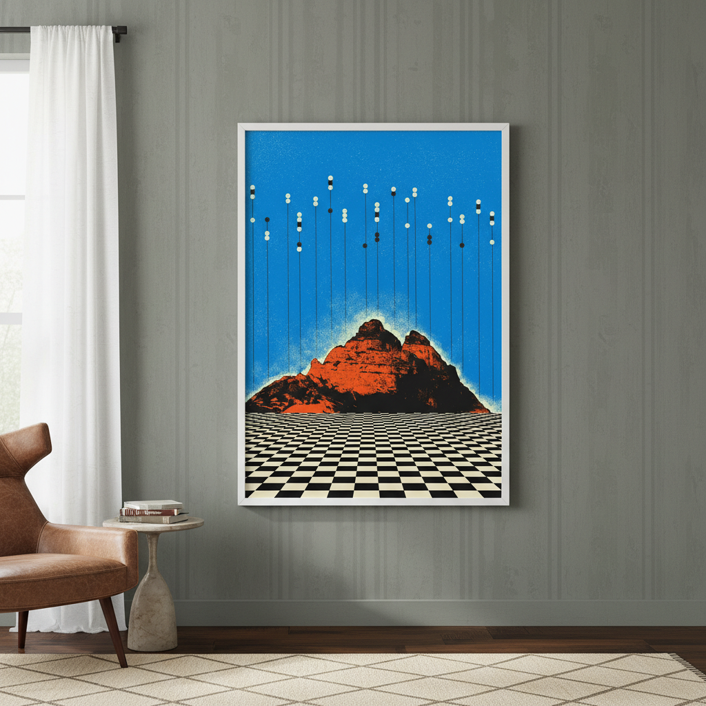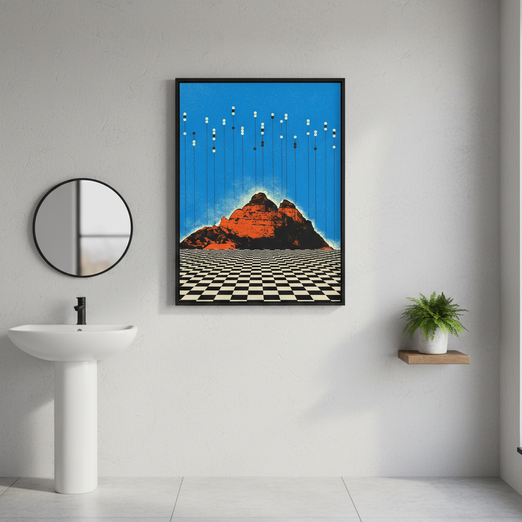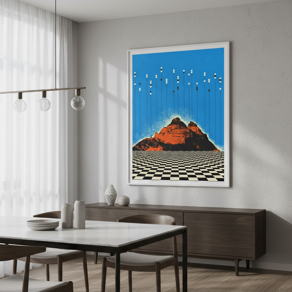 Misurina by Dusan Lilic captures a dreamlike alpine landscape where a majestic mountain rises beneath a luminous blue sky. Floating orbs of light dance across the composition, creating an ethereal quality that draws the viewer into a surreal realm. The checkered floor grounds the piece in geometric precision, contrasting beautifully with the organic mountain form above. This striking artwork merges landscape photography with contemporary digital artistry, offering a sophisticated statement piece for collectors who appreciate bold, imaginative interpretations of natural scenery. Perfect for modern interiors seeking visual intrigue and artistic depth.