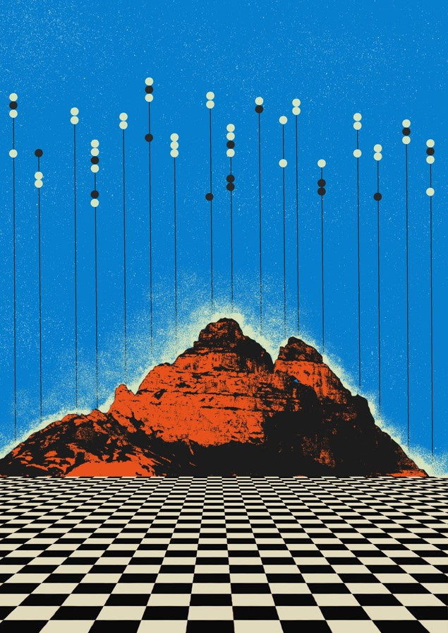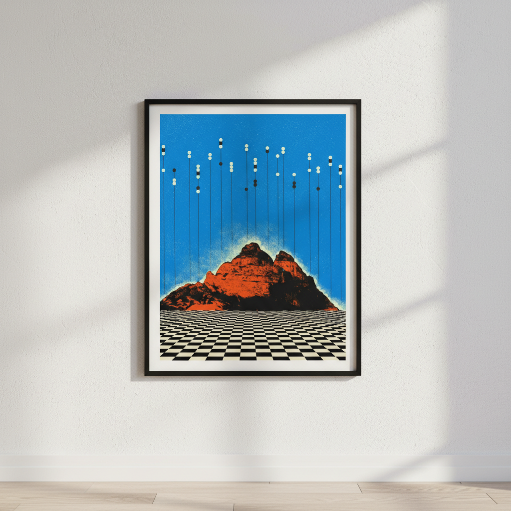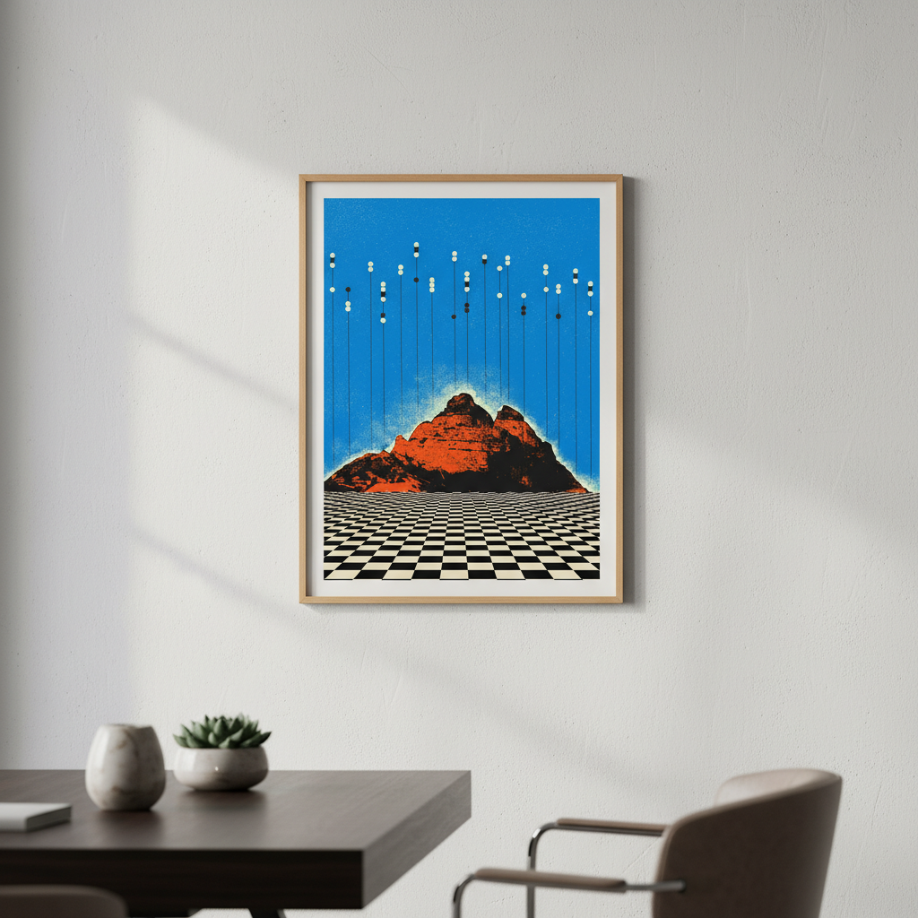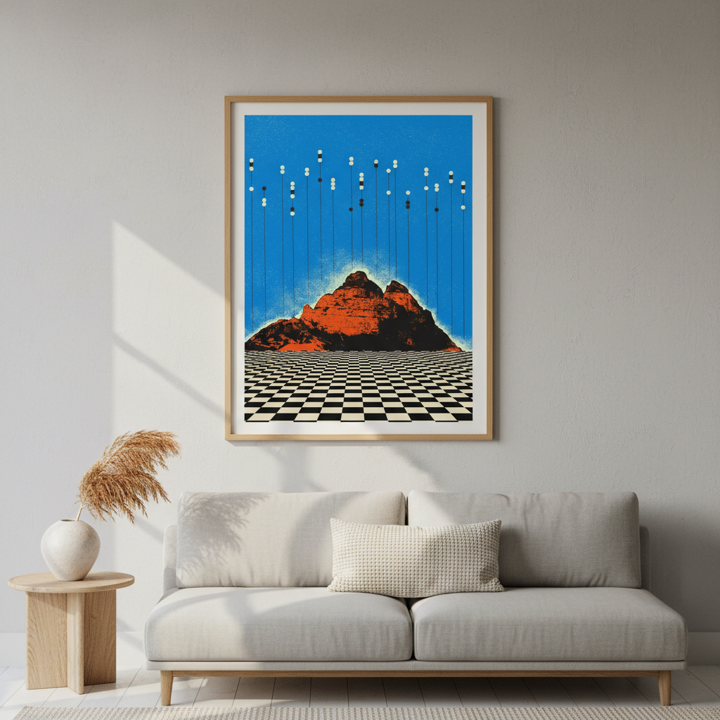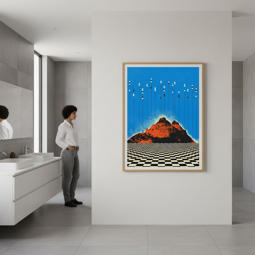 Misurina by Dusan Lilic captures a dreamlike alpine landscape where a majestic mountain rises beneath a luminous blue sky. Floating orbs of light dance across the composition, creating an ethereal quality that draws the viewer into a surreal realm. The checkered floor grounds the piece in geometric precision, contrasting beautifully with the organic mountain form above. This striking artwork merges landscape photography with contemporary digital artistry, offering a sophisticated statement piece for collectors who appreciate bold, imaginative interpretations of natural scenery. Perfect for modern interiors seeking visual intrigue and artistic depth.