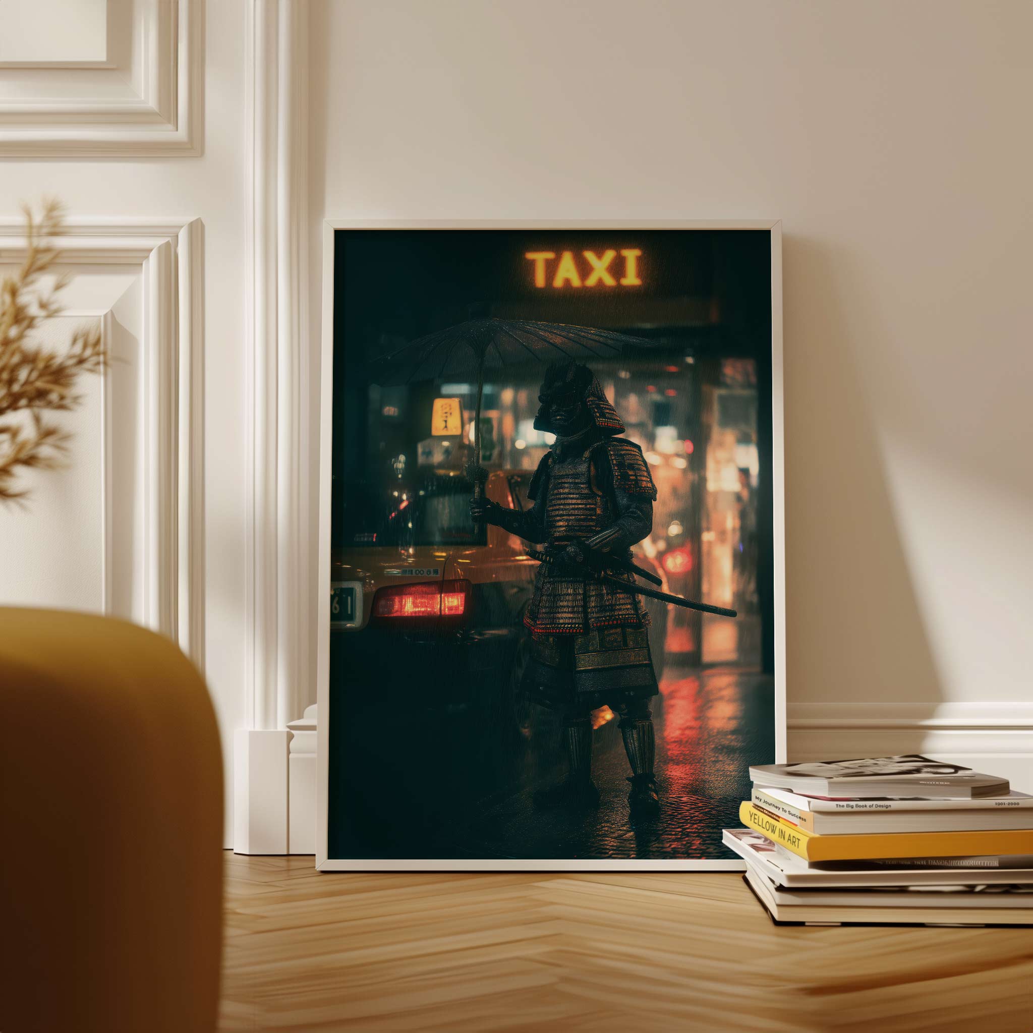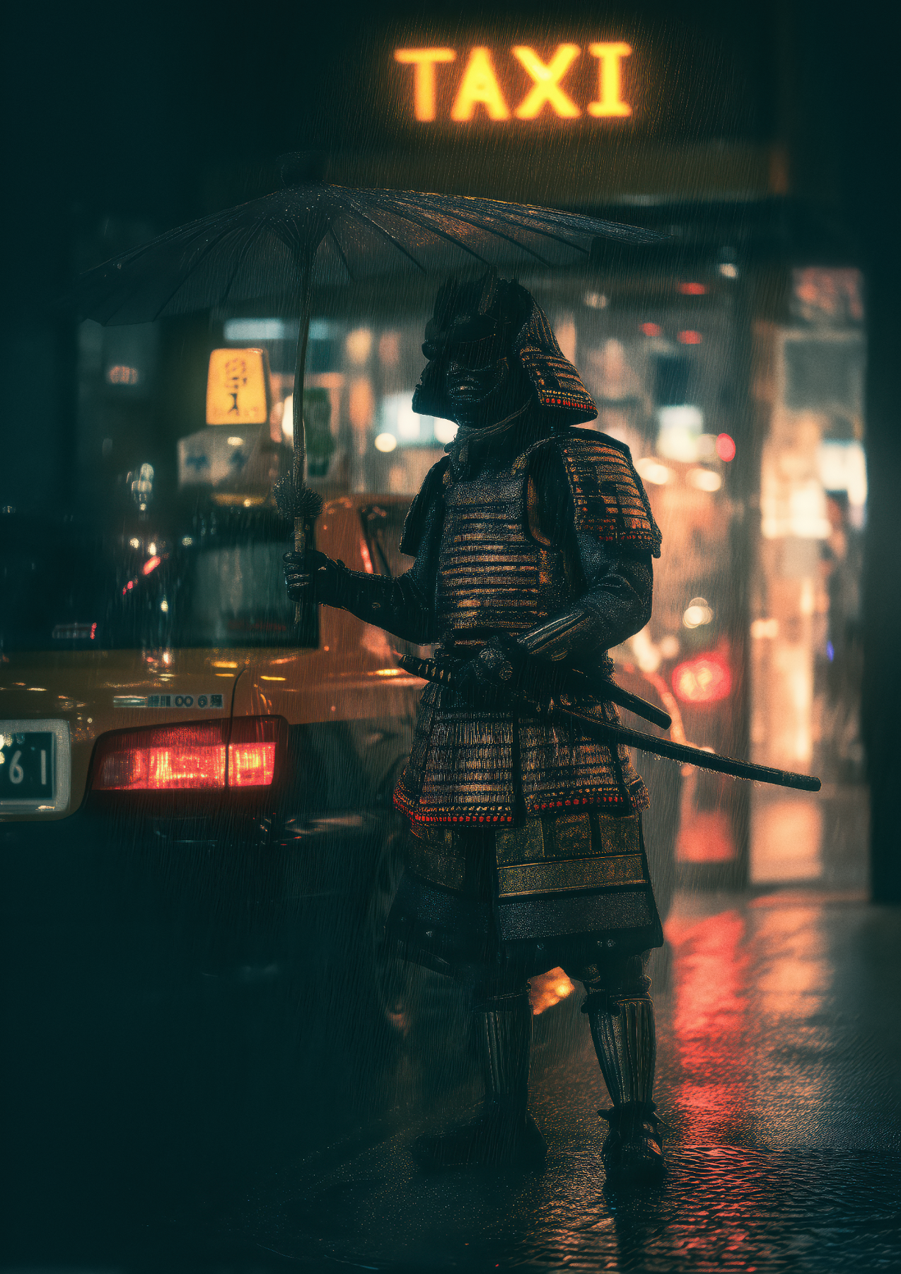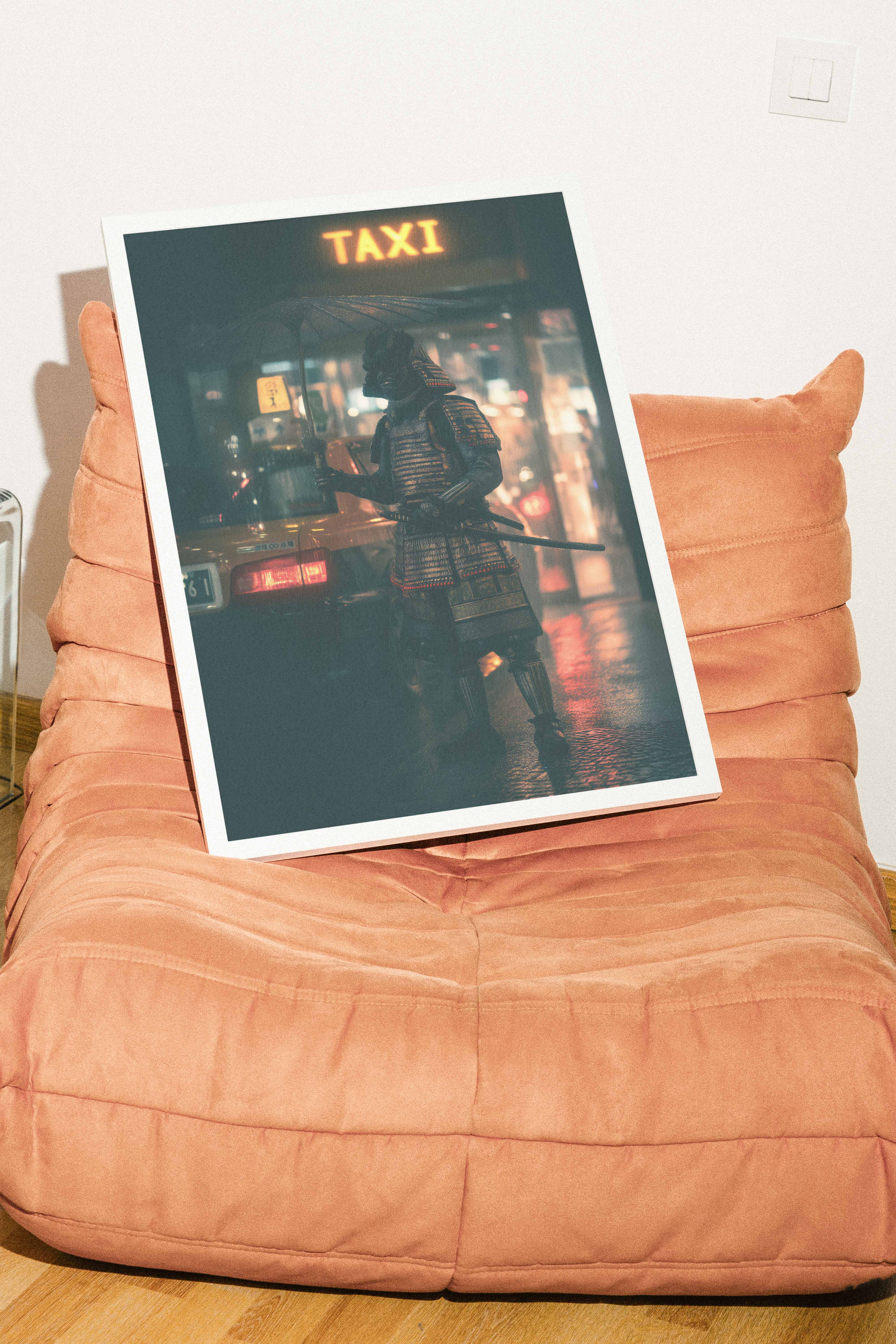 Samurai City Rush Wall Art captures a striking fusion of feudal tradition and urban modernity. This captivating piece depicts a warrior in authentic armor positioned beside a neon-lit taxi, creating a thought-provoking contrast between ancient honour and contemporary city life. The vibrant neon signage cuts through the night atmosphere, while meticulous detail brings both the samurai's regalia and the urban setting to vivid life. Perfect for those seeking statement art that challenges conventional aesthetics and sparks conversation about cultural intersections and timeless versus transient worlds.