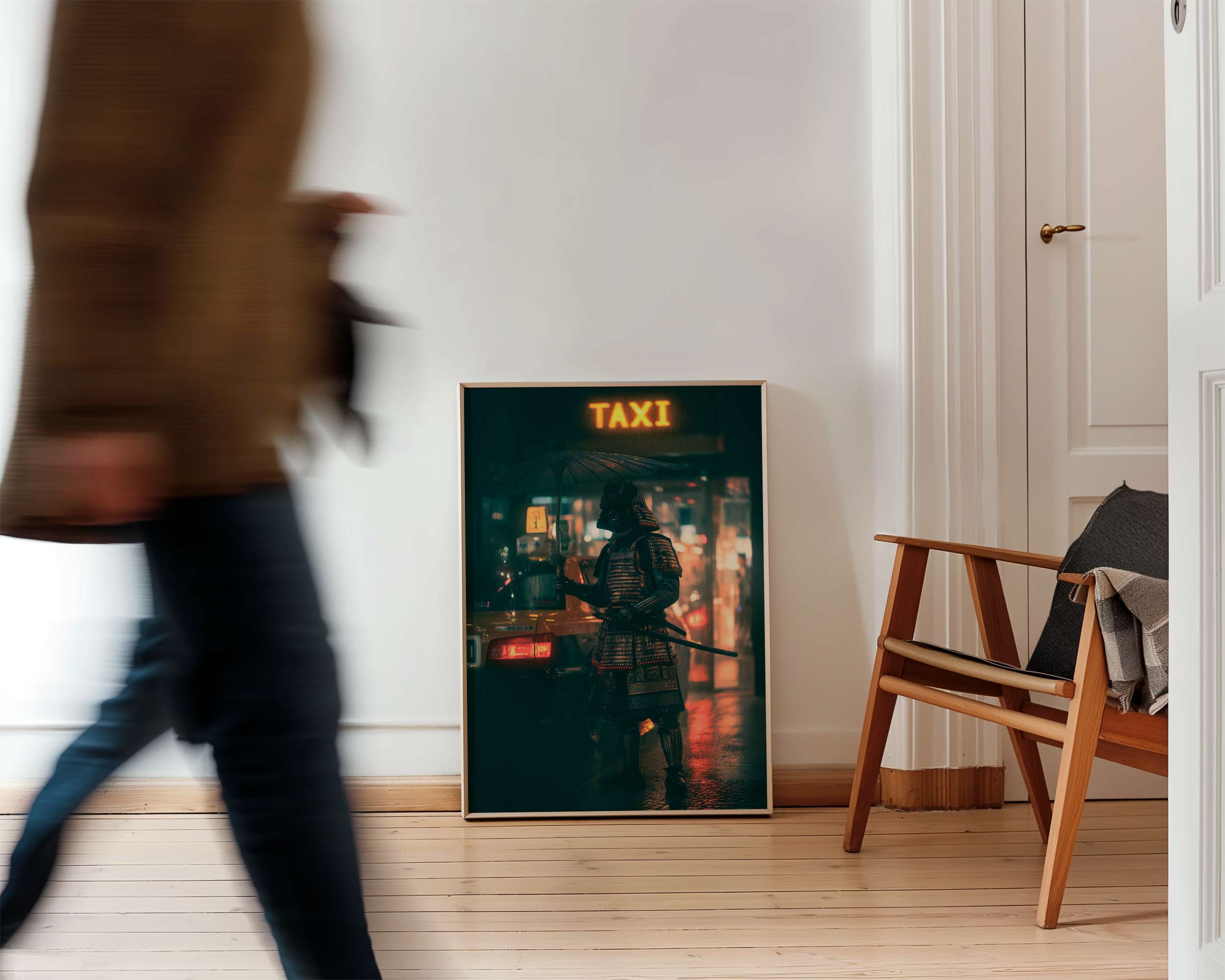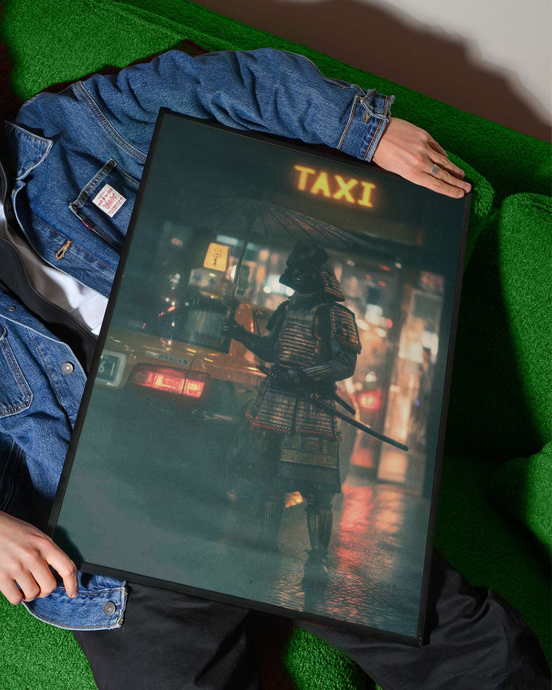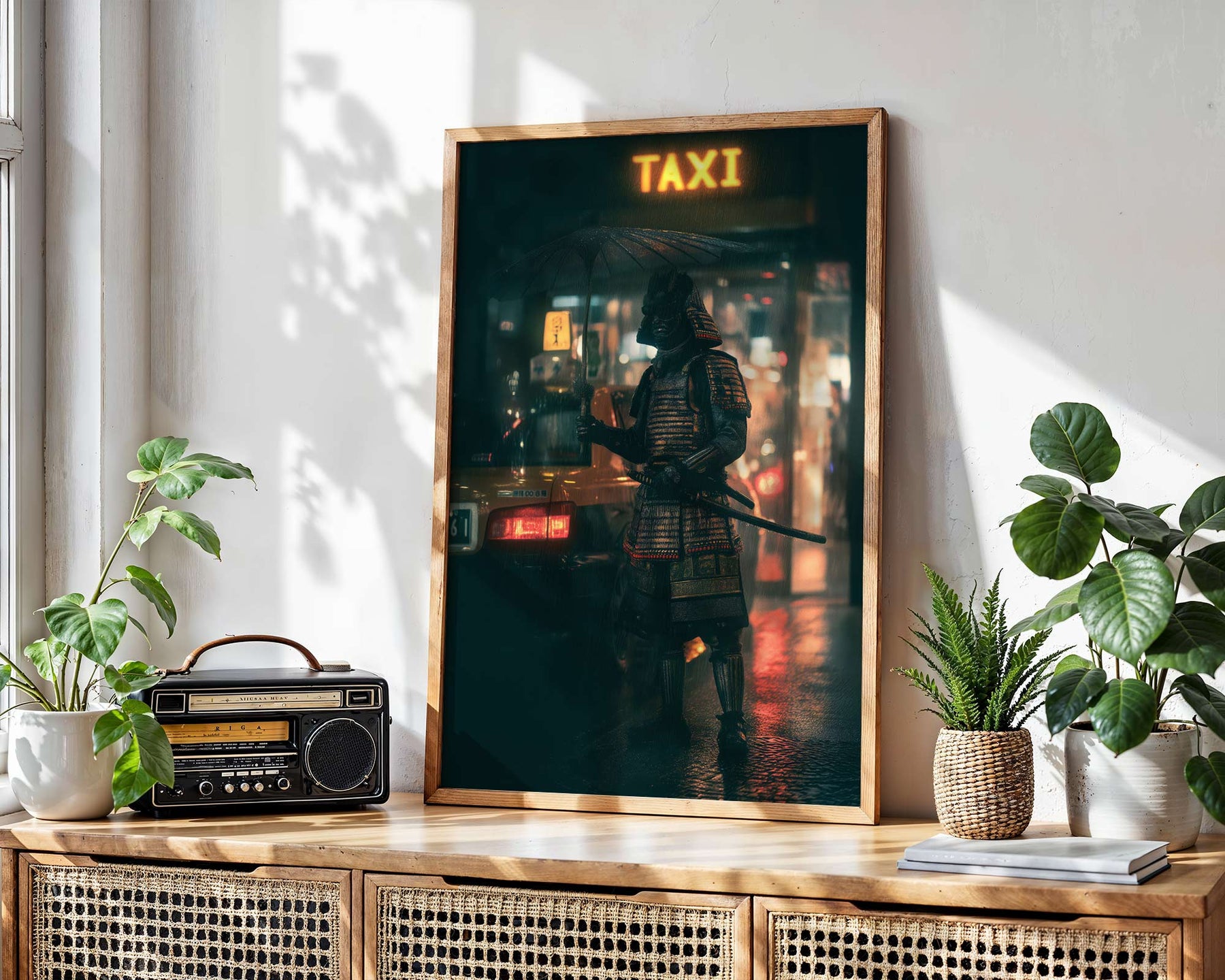 Samurai City Rush Wall Art captures a striking fusion of feudal tradition and urban modernity. This captivating piece depicts a warrior in authentic armor positioned beside a neon-lit taxi, creating a thought-provoking contrast between ancient honour and contemporary city life. The vibrant neon signage cuts through the night atmosphere, while meticulous detail brings both the samurai's regalia and the urban setting to vivid life. Perfect for those seeking statement art that challenges conventional aesthetics and sparks conversation about cultural intersections and timeless versus transient worlds.