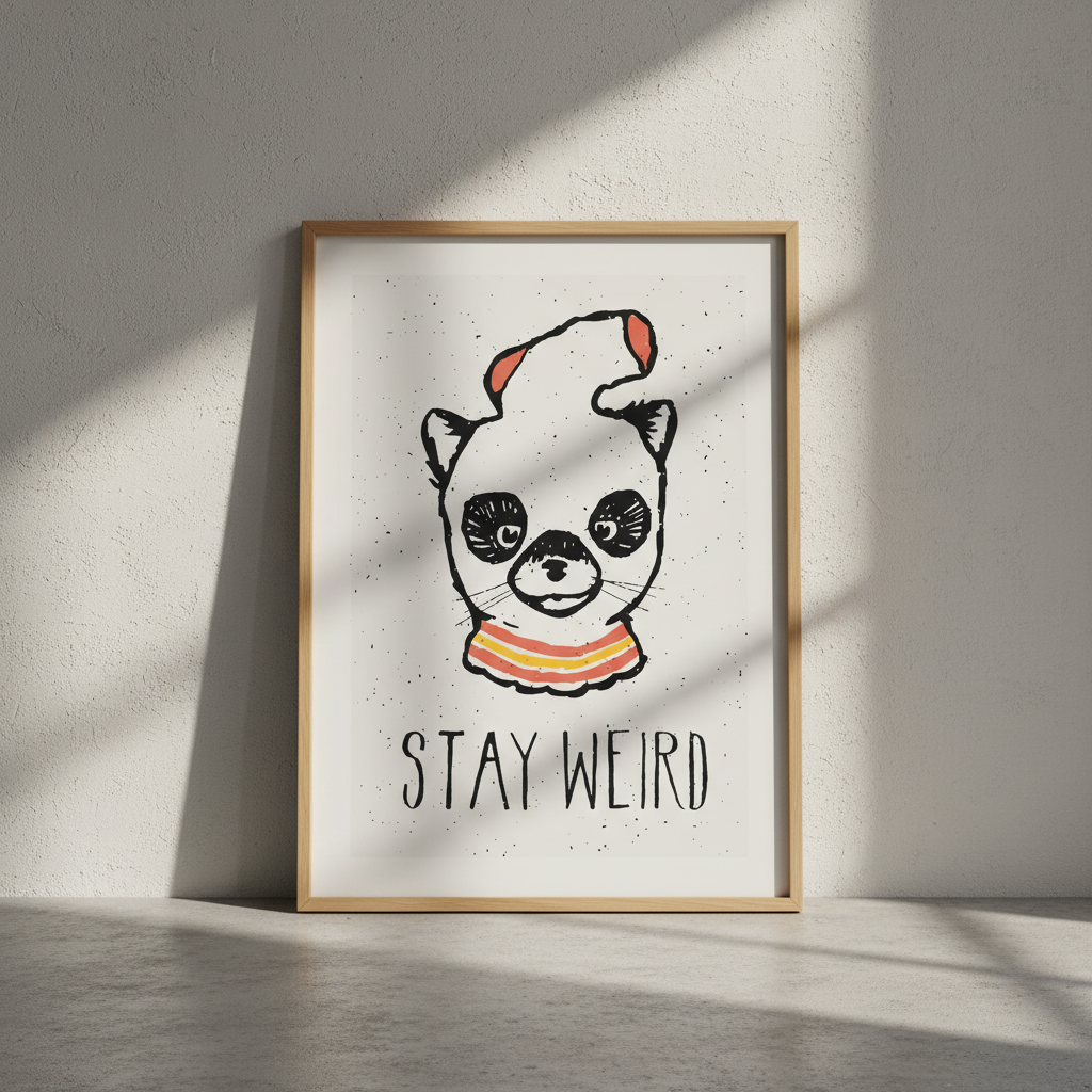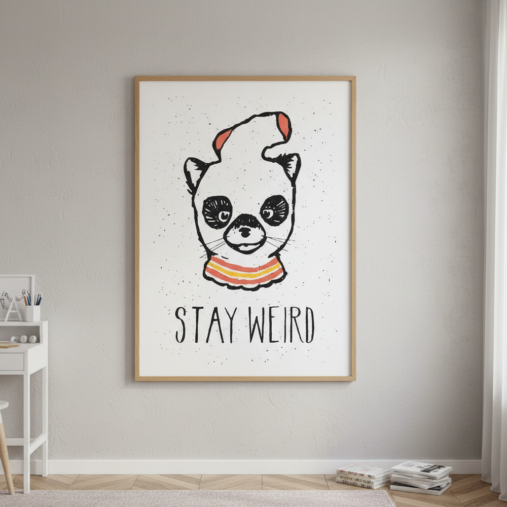 This striking illustration captures a whimsical panda adorned with a stylish hat, set against a richly textured background. The bold "Stay Weird" message celebrates individuality and creative self-expression, making it an ideal choice for those who embrace their unique perspective. Created by renowned artist Florent Bodart, this piece combines playful character design with sophisticated artistic technique. Perfect for adding personality to any space, whether in a bedroom, creative studio, or contemporary living area, this artwork serves as a daily reminder to embrace authenticity and reject conformity.