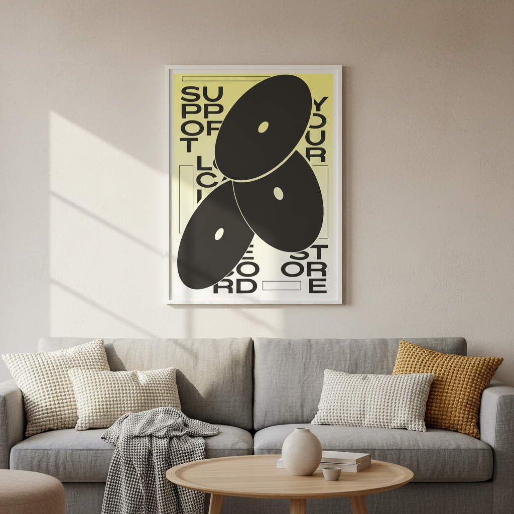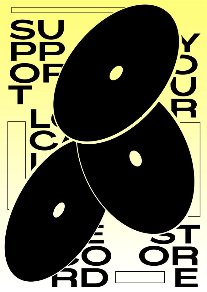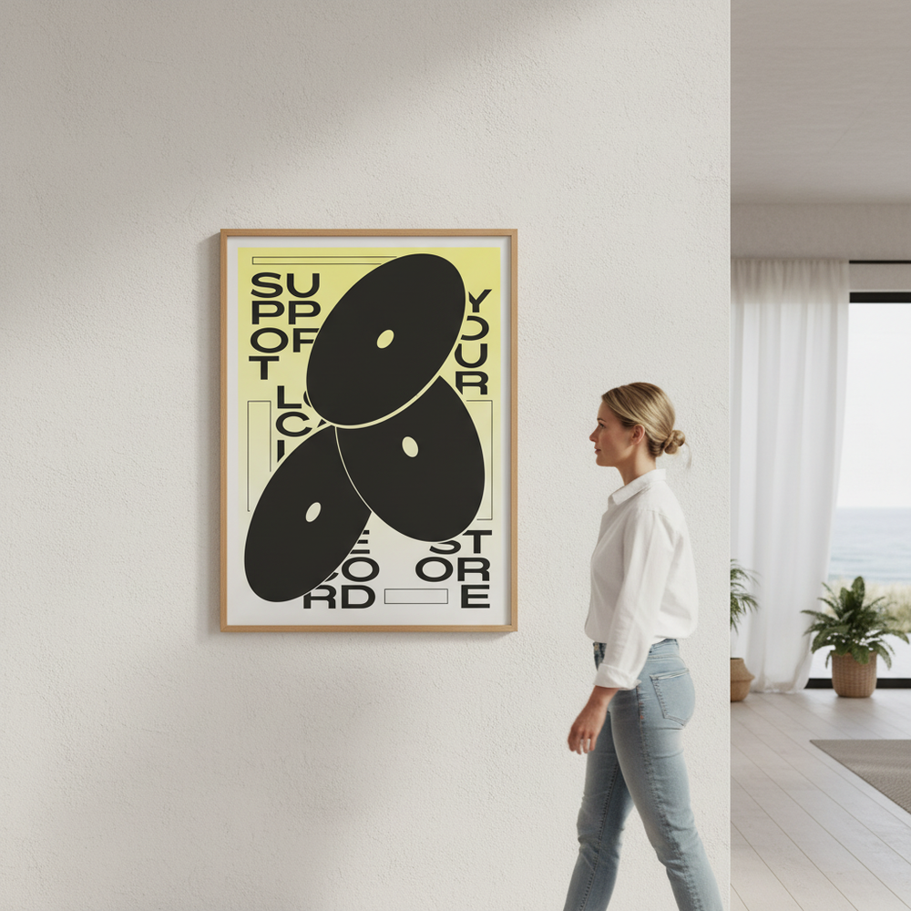 Support your favourite vinyl haven with this vibrant art print that celebrates the magic of record stores. Featuring bold black abstract shapes dancing across a sunny yellow background, it's topped with cheeky text that speaks to every music lover's heart. Perfect for bedroom walls, music studios, or anywhere that needs a dose of indie spirit and colour. A fun tribute to the places where musical discoveries happen.