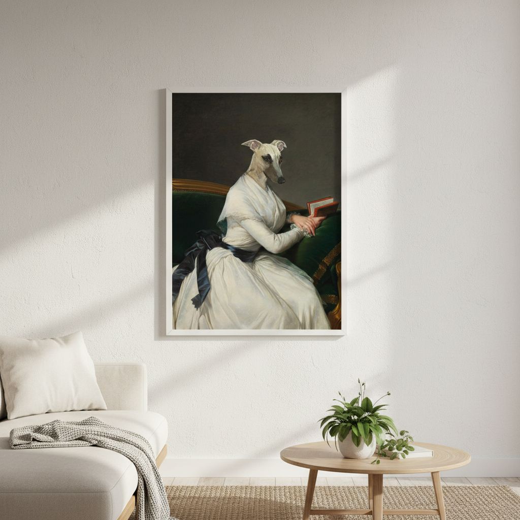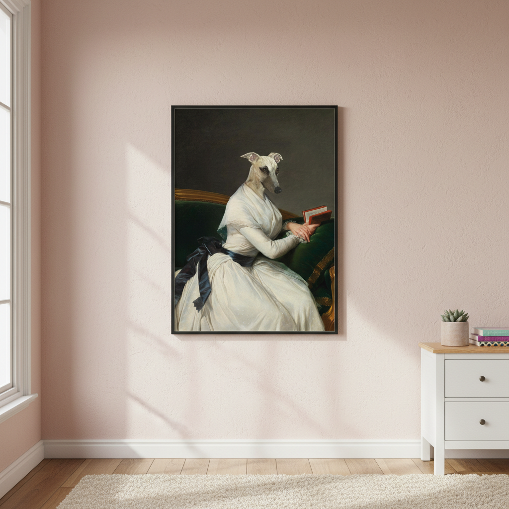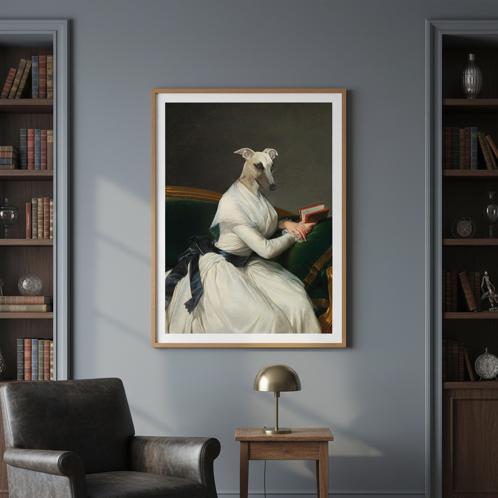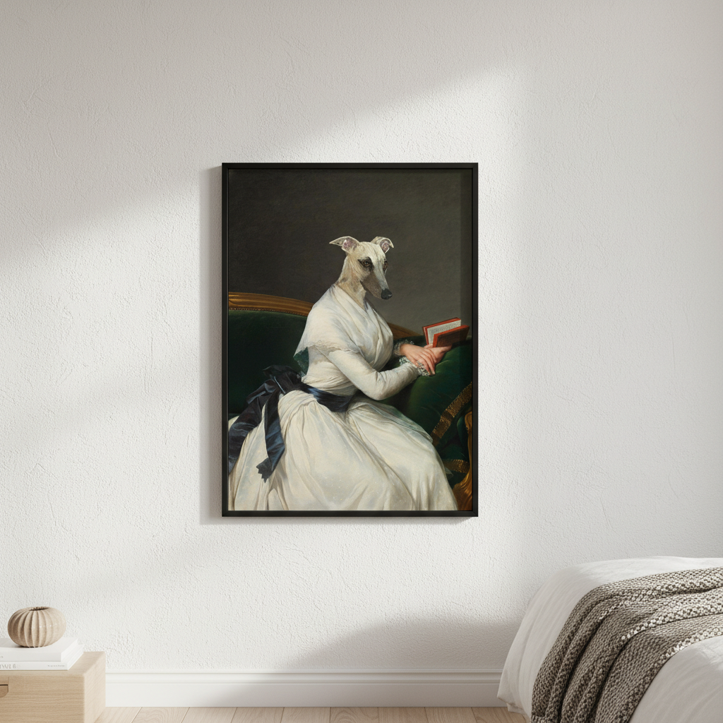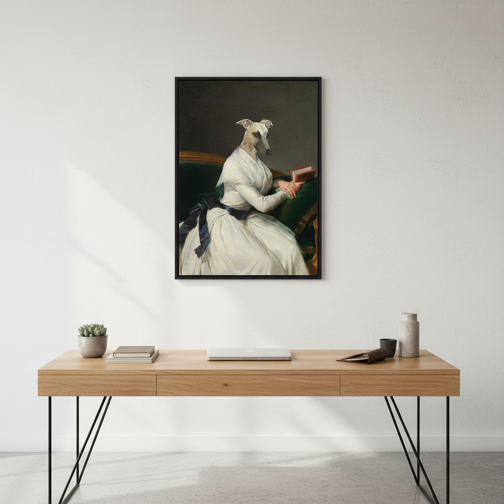 Telma by Florent Bodart captures a whimsical yet sophisticated moment—a distinguished canine in formal attire, poised thoughtfully on a plush couch with book in paw. The dark, moody backdrop creates dramatic contrast, elevating this piece beyond typical pet portraiture into gallery-worthy art. Bodart's signature style brings personality and narrative depth to the composition, making it an ideal statement piece for those who appreciate contemporary art with character and wit.