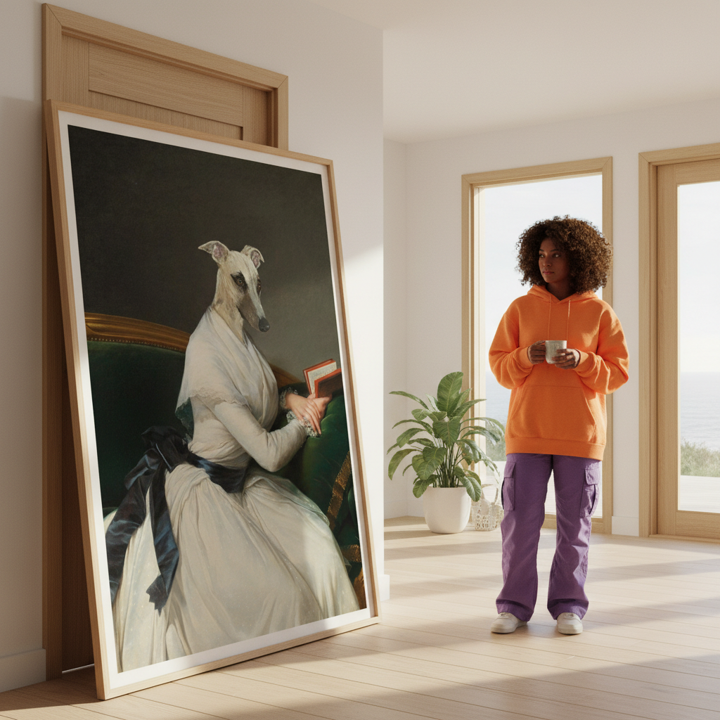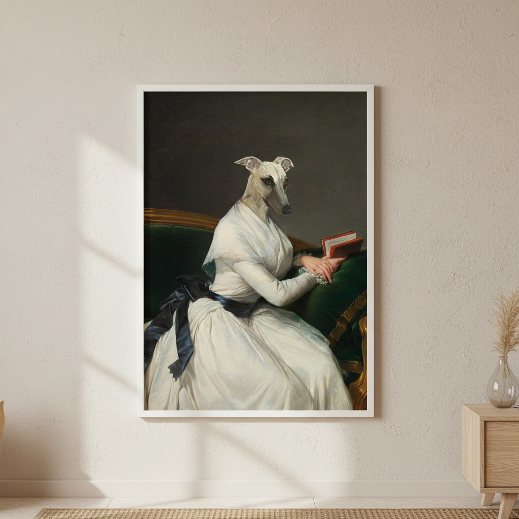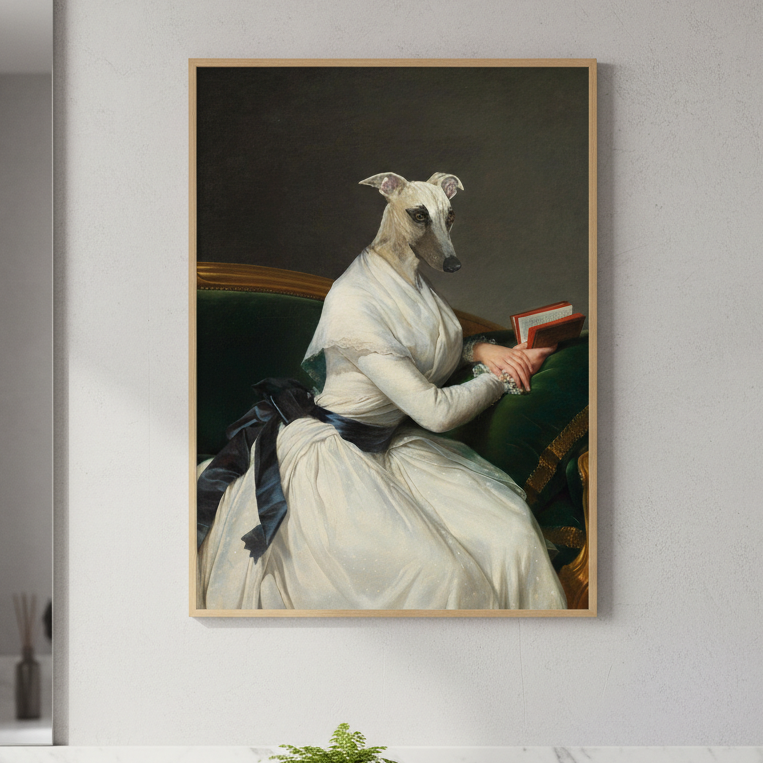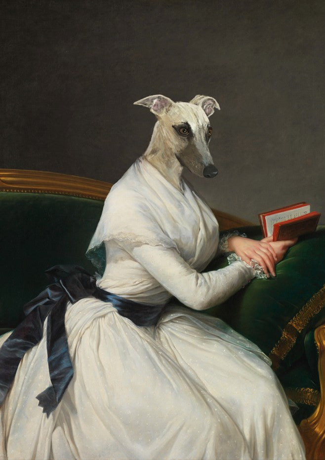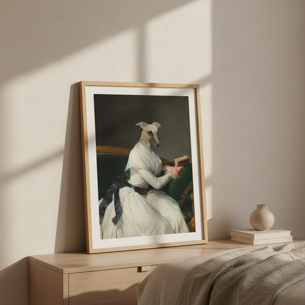 Telma by Florent Bodart captures a whimsical yet sophisticated moment—a distinguished canine in formal attire, poised thoughtfully on a plush couch with book in paw. The dark, moody backdrop creates dramatic contrast, elevating this piece beyond typical pet portraiture into gallery-worthy art. Bodart's signature style brings personality and narrative depth to the composition, making it an ideal statement piece for those who appreciate contemporary art with character and wit.