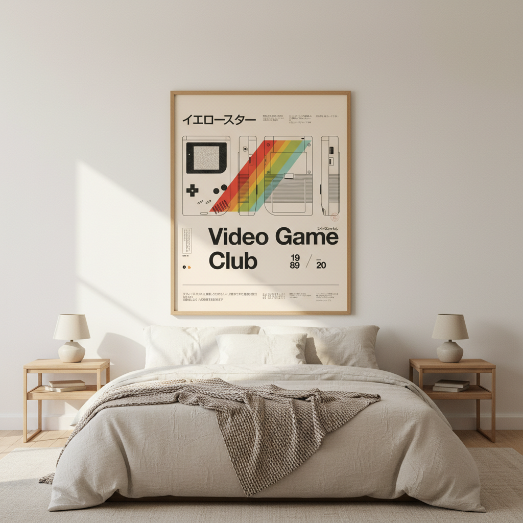 Celebrate gaming nostalgia with this striking artwork by Florent Bodart. Featuring a vintage-style video game console rendered in bold, minimalist lines against a clean white canvas, the design is punctuated by a vibrant rainbow stripe that adds contemporary flair. Perfect for game enthusiasts and retro design lovers, this piece bridges classic arcade aesthetics with modern artistic sensibility. An ideal statement piece for bedrooms, gaming rooms, or creative spaces seeking character and visual interest.
