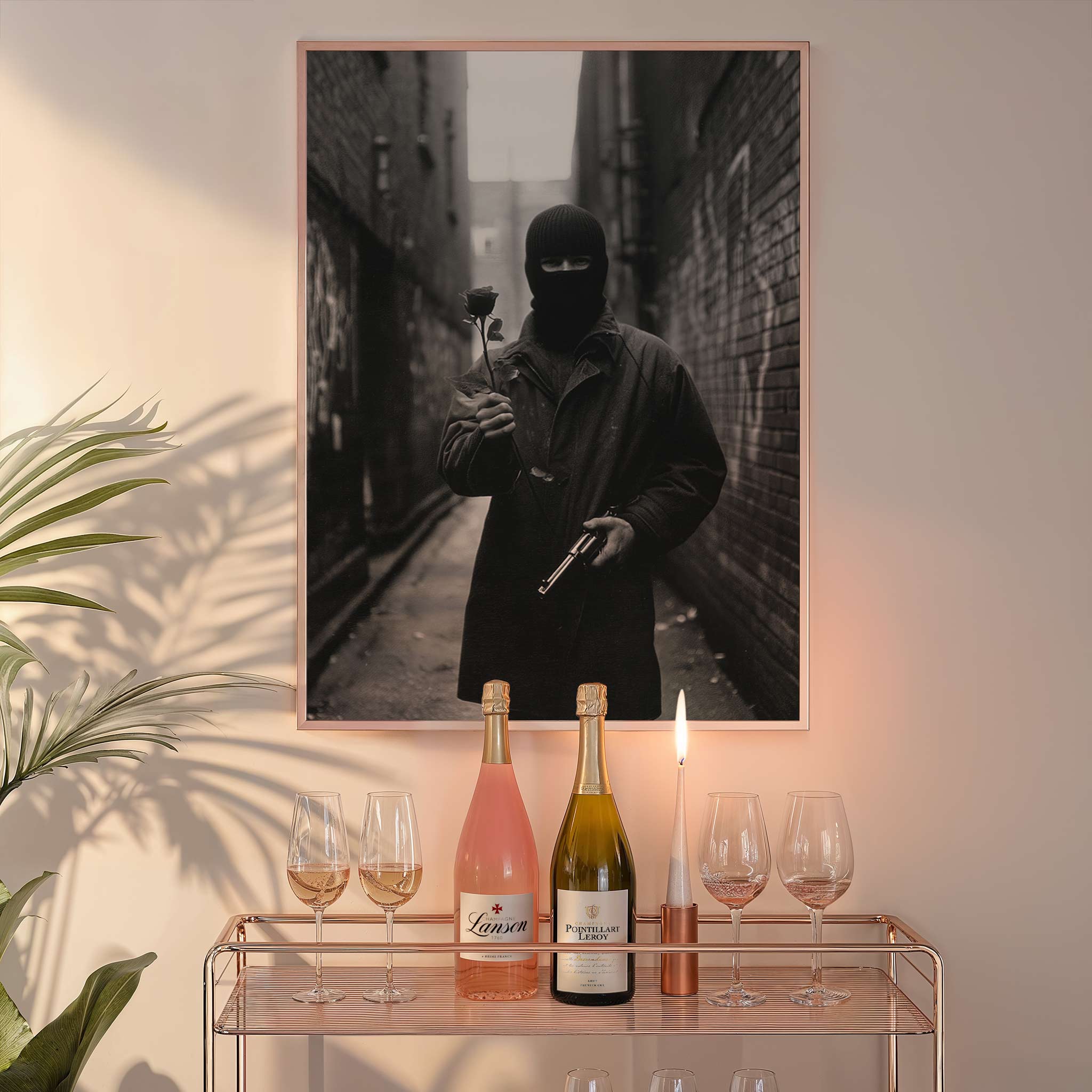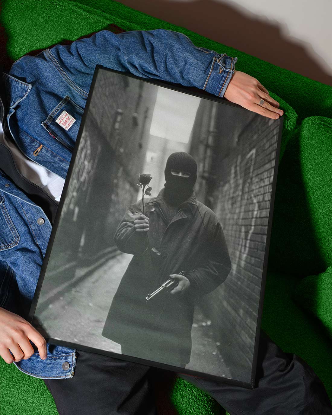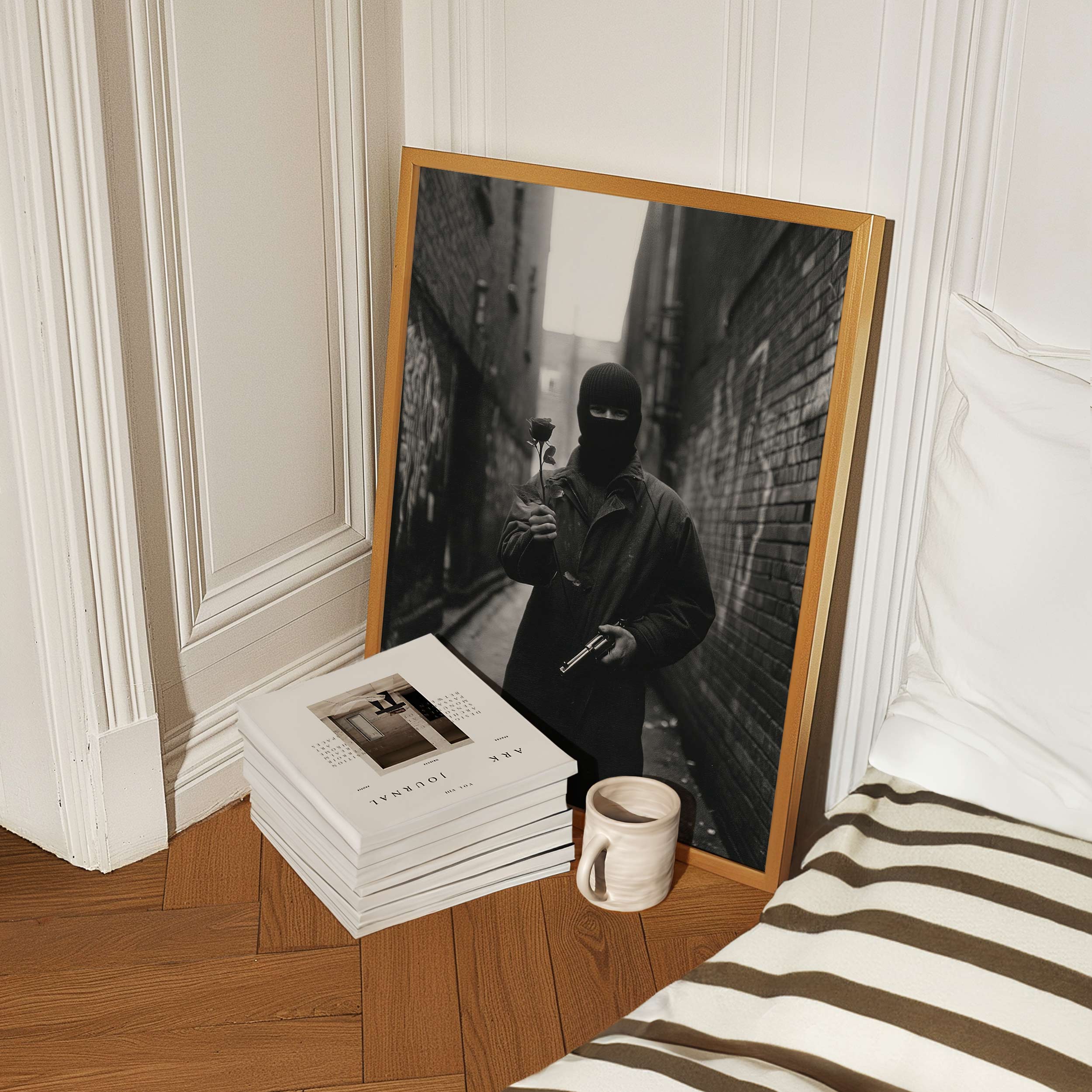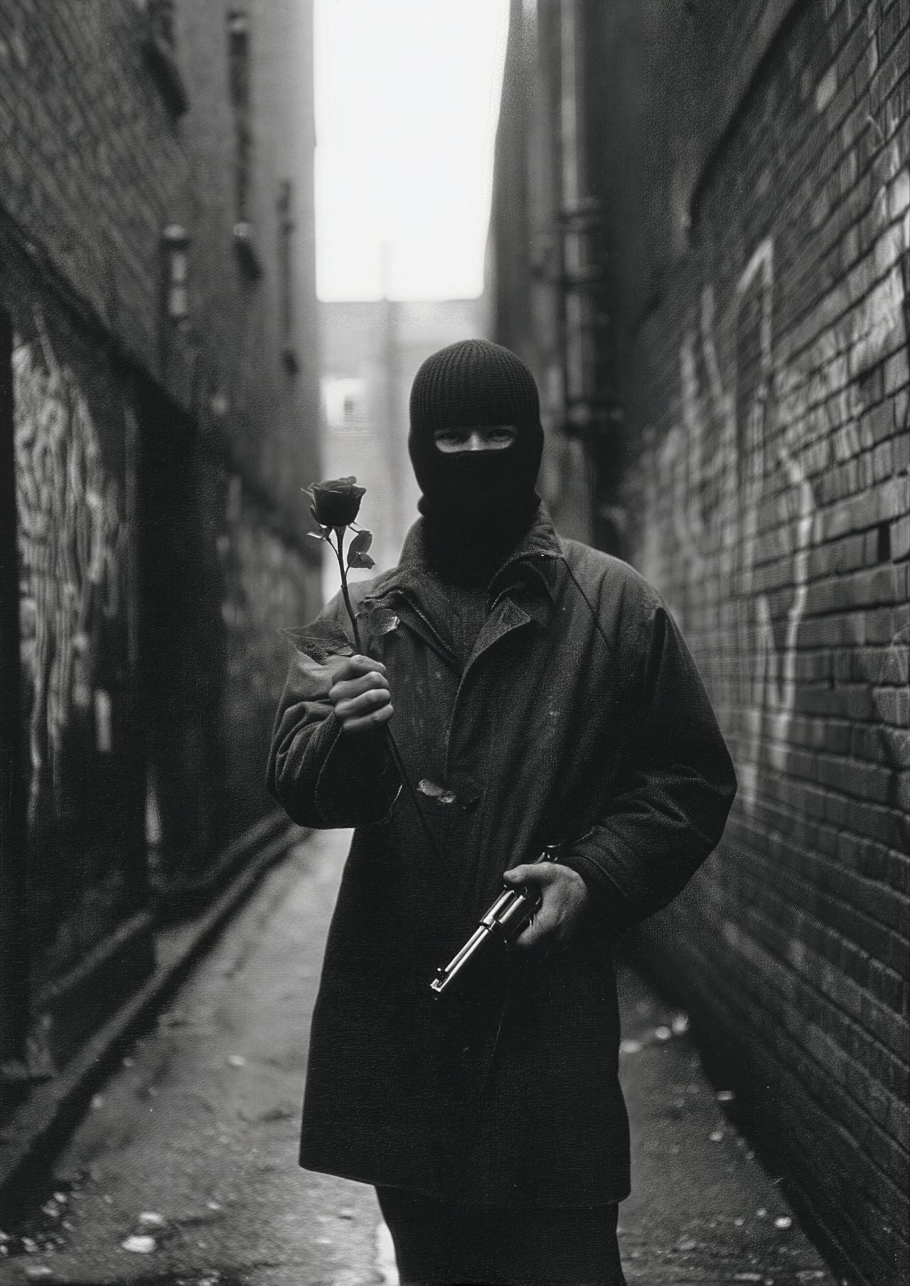 Moody, cinematic, and powerfully symbolic—this striking photographic print captures a lone figure in a dark coat and balaclava standing in a narrow alleyway, holding a delicate rose in one hand and a gun in the other. The image explores the tension between softness and strength, beauty and defiance, vulnerability and control. Set against the shadowy textures of an urban alley, the composition draws you in with its mystery and emotional depth. The rose becomes a quiet symbol of humanity and fragility, while the weapon introduces an element of danger and resistance—creating a visual narrative that invites interpretation.