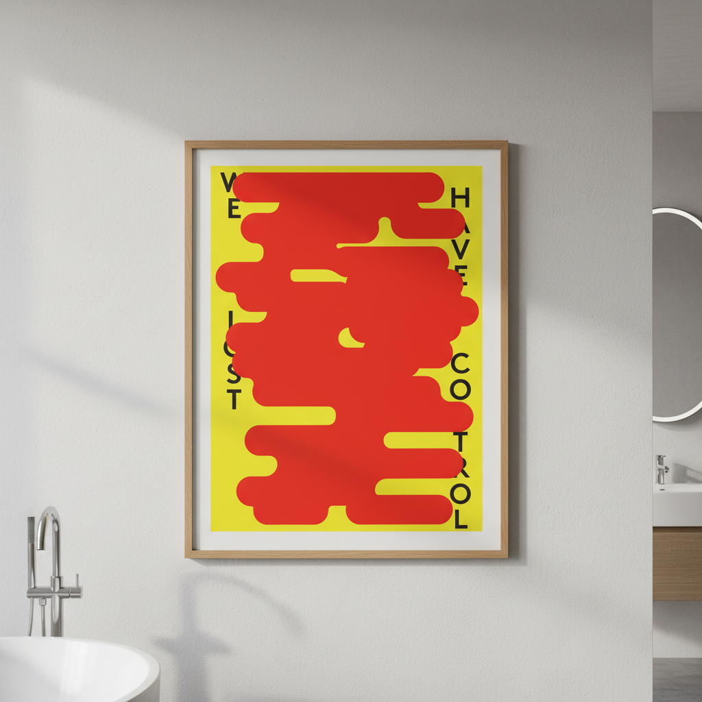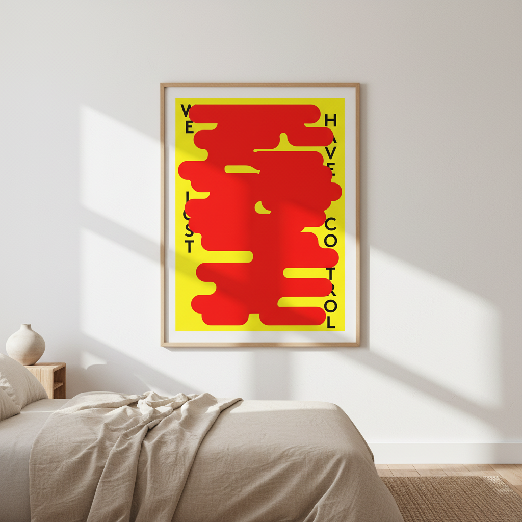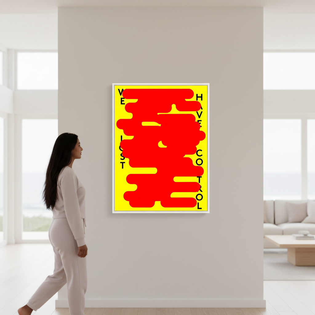 Make a bold statement with this eye-catching wall art by Jérôme Bizien. Vibrant yellow background meets fiery red lettering in a cheeky graphic that declares "We Have Lost Control" with unapologetic humour. Perfect for adding wit and personality to your space, whether it's a creative studio, dorm room, or anywhere that needs a laugh. This playful piece captures that universally relatable moment when things spiral—and you're totally okay with it. Transform your walls into a conversation starter.