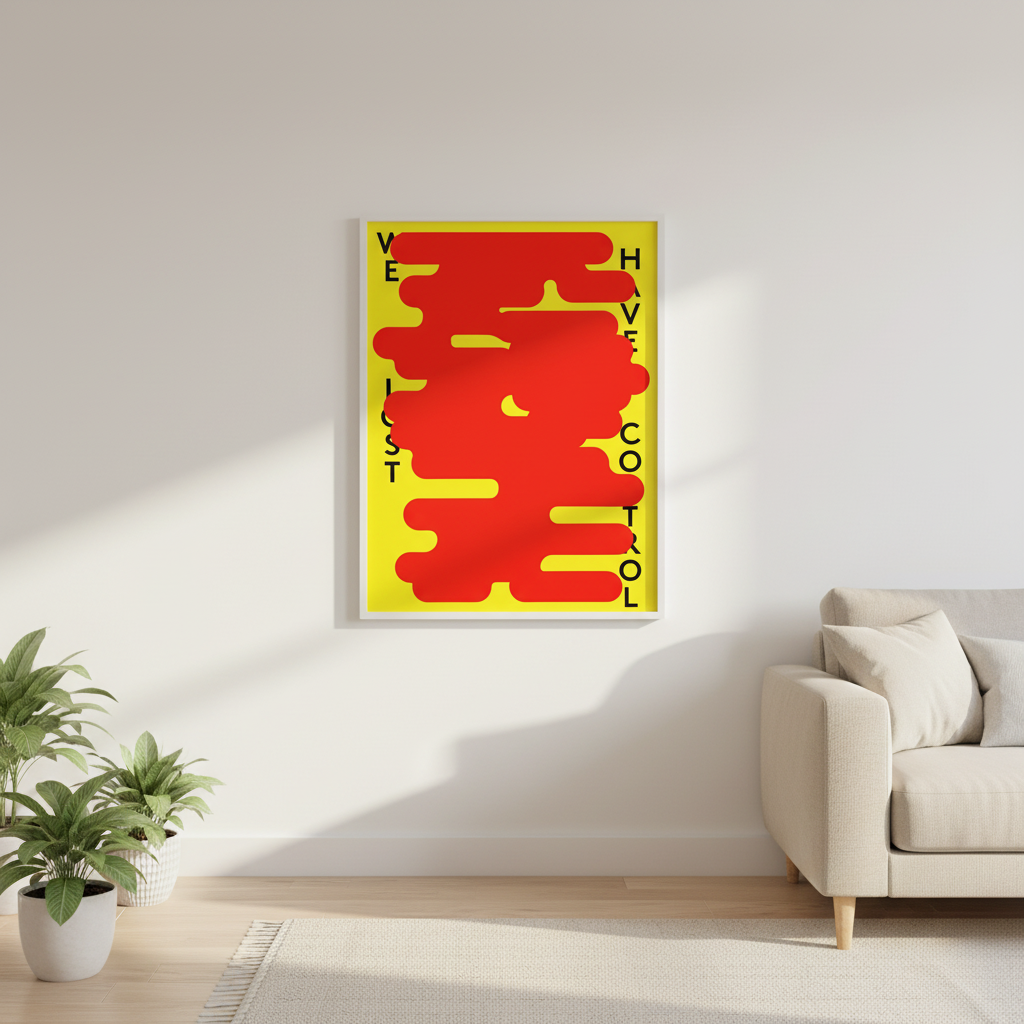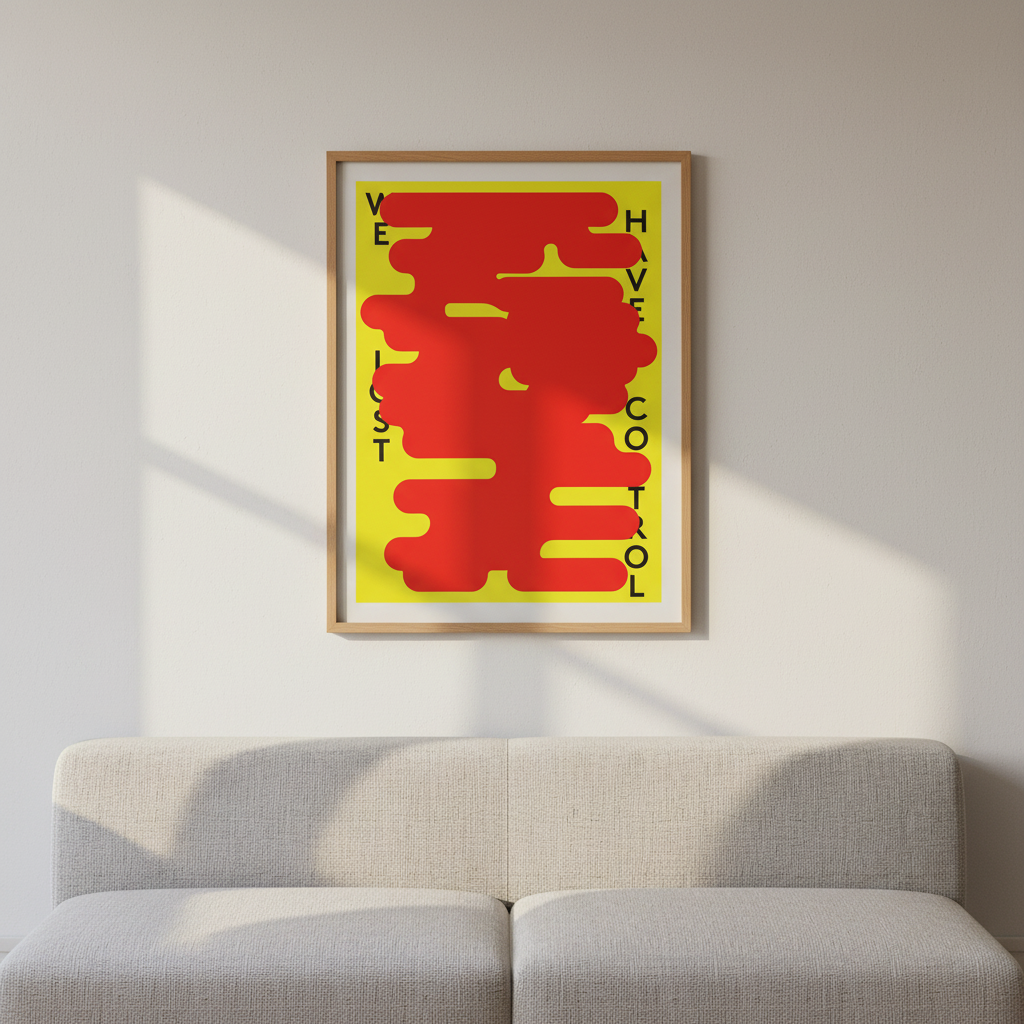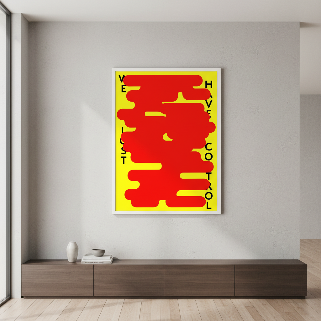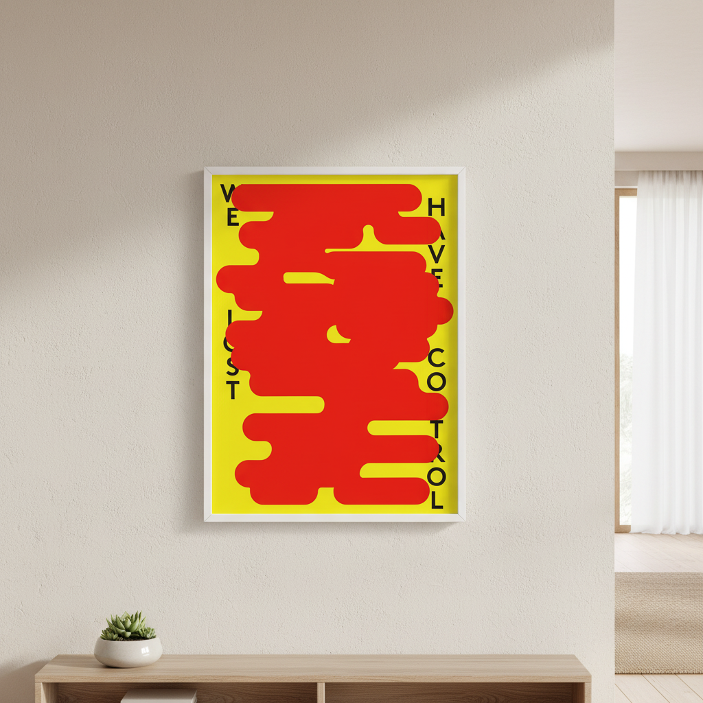 Make a bold statement with this eye-catching wall art by Jérôme Bizien. Vibrant yellow background meets fiery red lettering in a cheeky graphic that declares "We Have Lost Control" with unapologetic humour. Perfect for adding wit and personality to your space, whether it's a creative studio, dorm room, or anywhere that needs a laugh. This playful piece captures that universally relatable moment when things spiral—and you're totally okay with it. Transform your walls into a conversation starter.