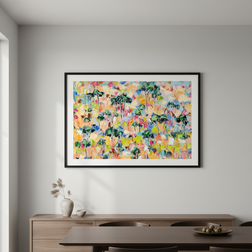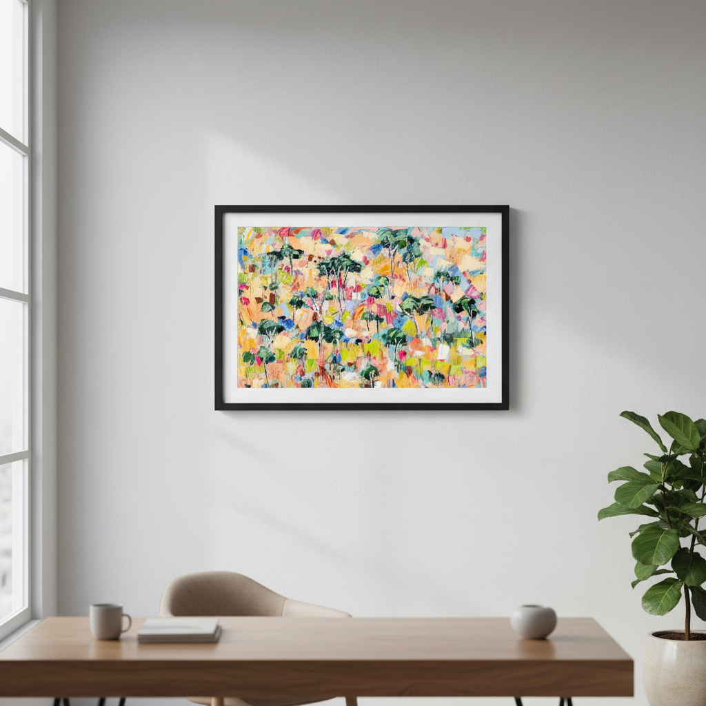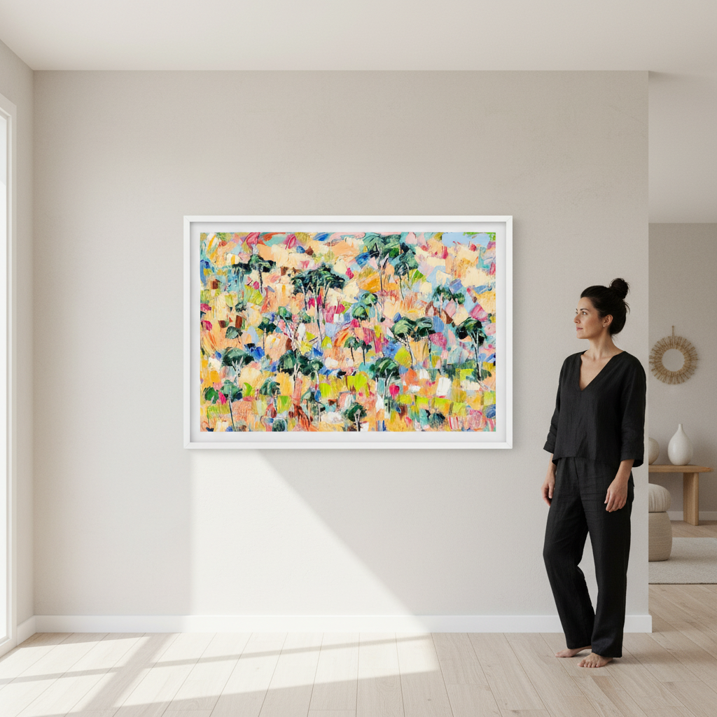 Canopy Dreams captures the essence of woodland landscapes through vibrant, expressive abstraction. Angela Hawkey's masterful use of colour transforms natural forms into a dynamic composition that celebrates the interplay of light and shadow beneath a forest canopy. This contemporary piece brings movement and energy to any space, inviting viewers to discover their own interpretation within the layered brushwork. Perfect for collectors seeking art that bridges the gap between representation and abstraction, offering both visual intrigue and emotional resonance.