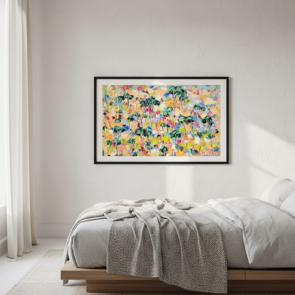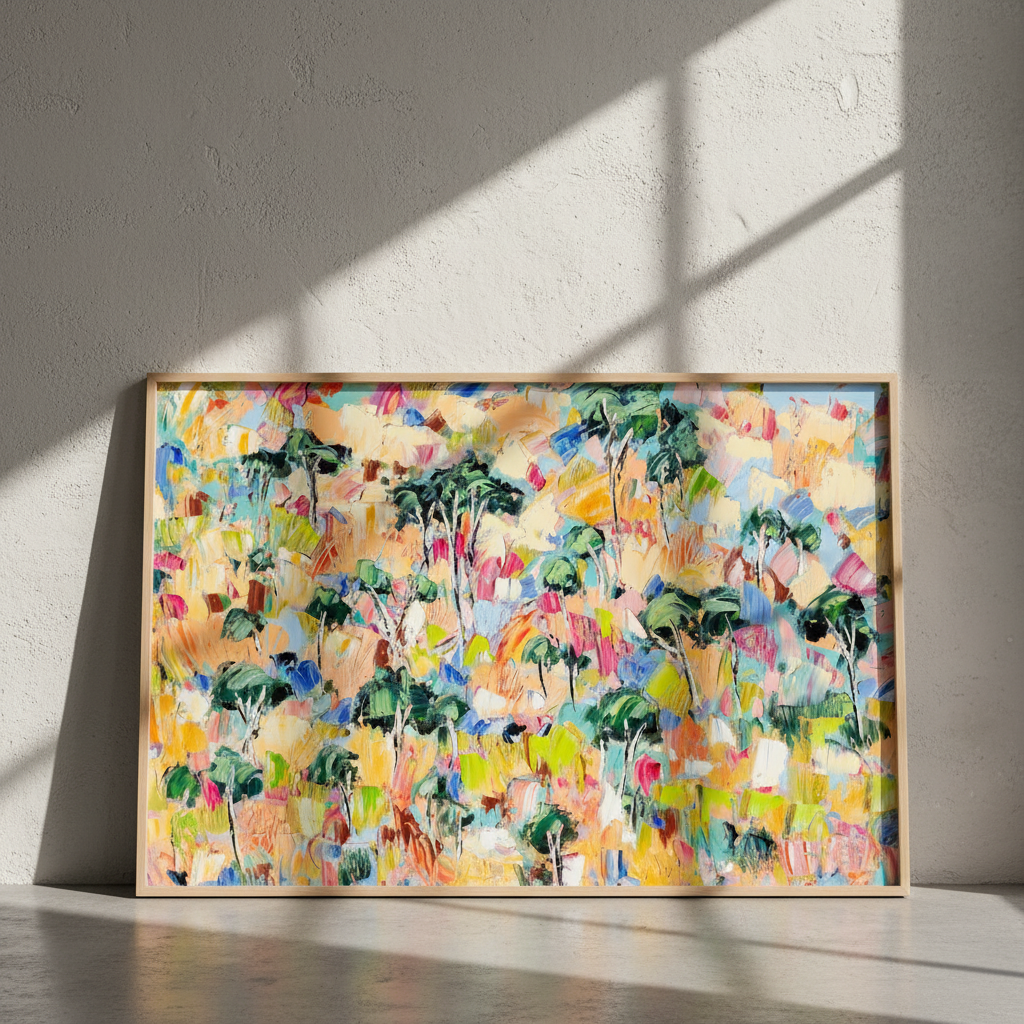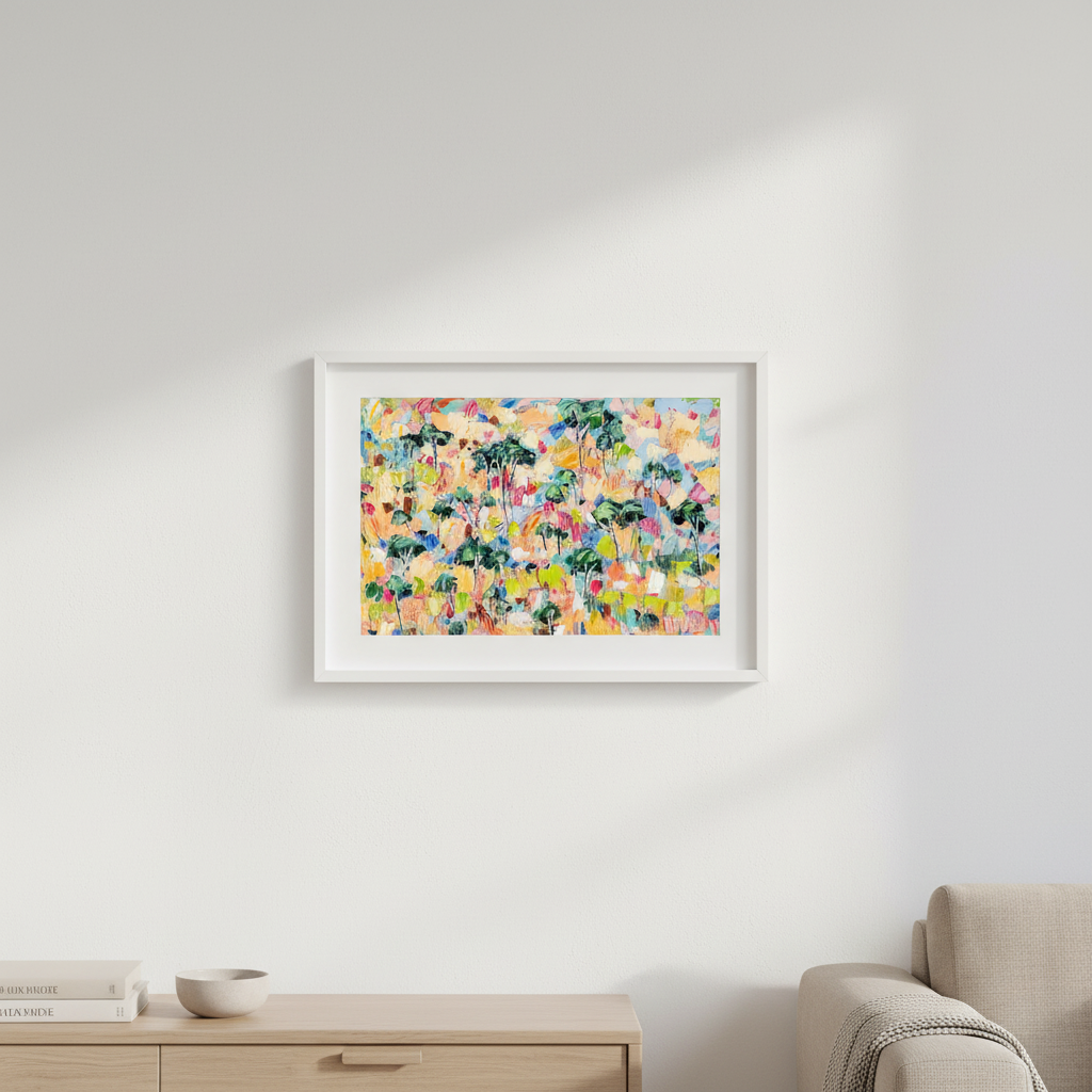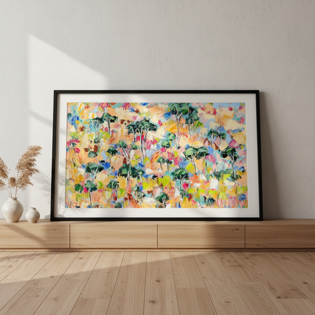 Canopy Dreams captures the essence of woodland landscapes through vibrant, expressive abstraction. Angela Hawkey's masterful use of colour transforms natural forms into a dynamic composition that celebrates the interplay of light and shadow beneath a forest canopy. This contemporary piece brings movement and energy to any space, inviting viewers to discover their own interpretation within the layered brushwork. Perfect for collectors seeking art that bridges the gap between representation and abstraction, offering both visual intrigue and emotional resonance.