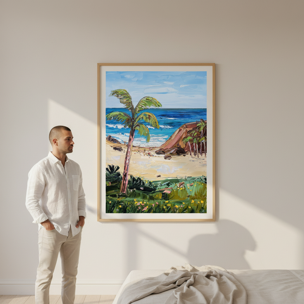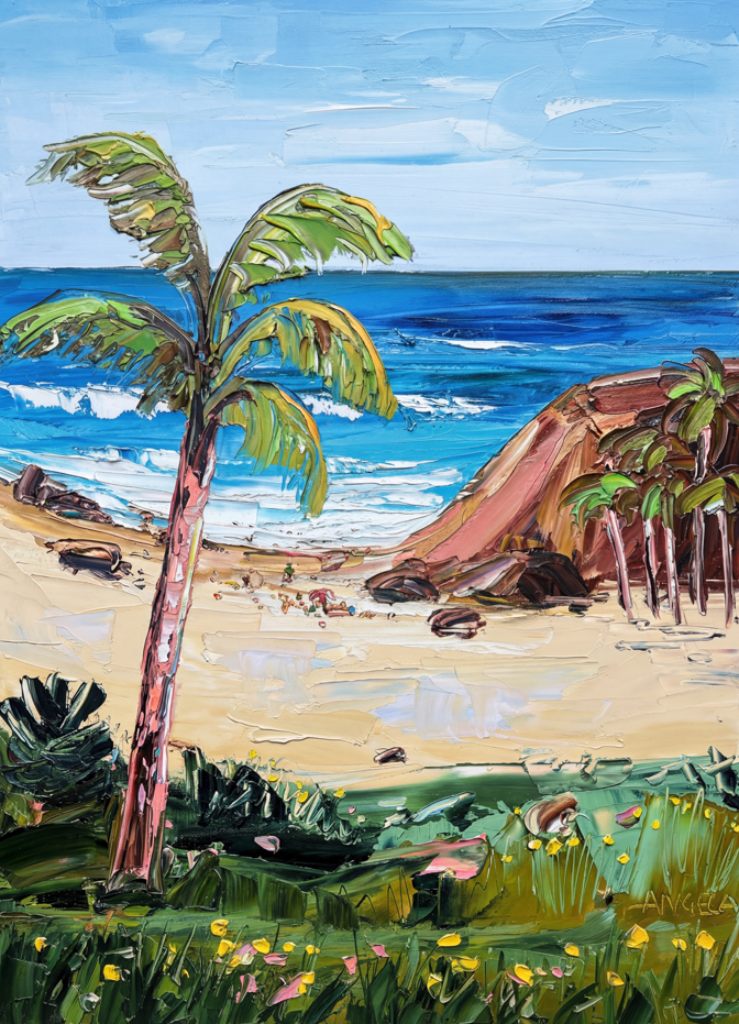Island Waves by Angela Hawkey transports you to a serene tropical paradise. This evocative painting captures the essence of coastal living with lush palm trees swaying against a vibrant ocean backdrop. The artist's masterful brushwork brings movement to the waves while maintaining a sense of peaceful tranquility. Perfect for creating a vacation-inspired atmosphere in any room, this piece combines natural beauty with sophisticated artistry. An ideal choice for those seeking to infuse their space with tropical warmth and seaside charm.