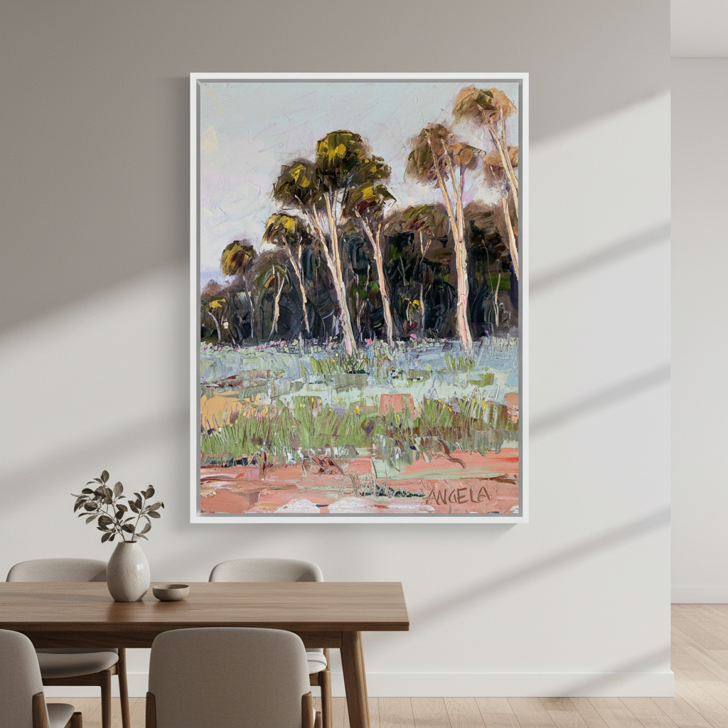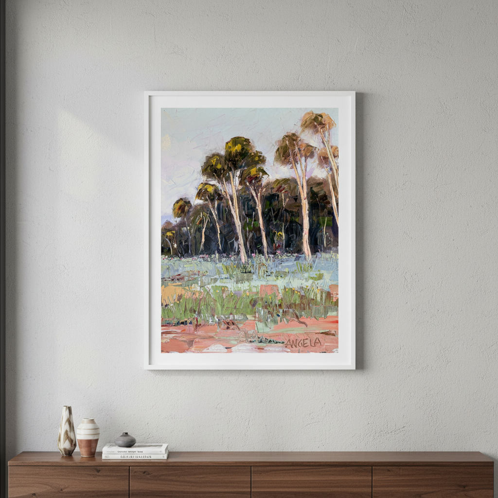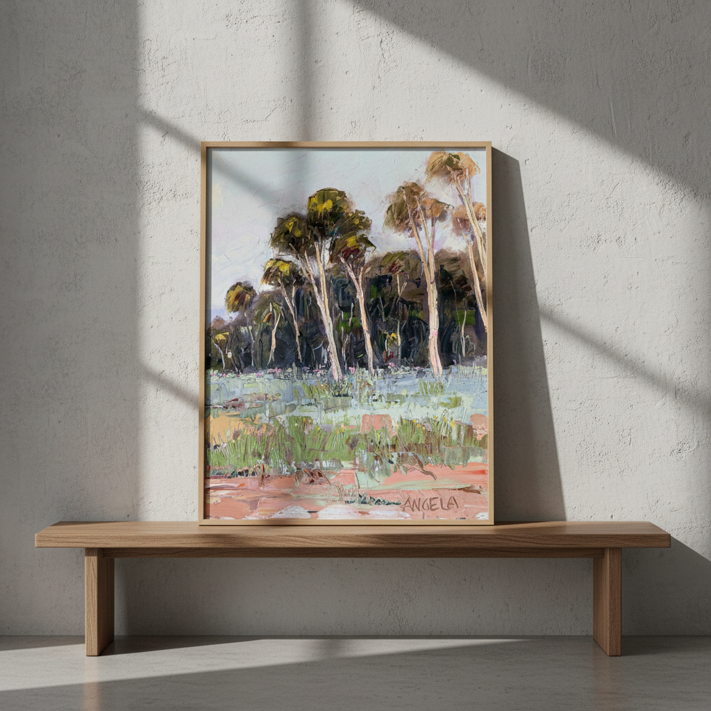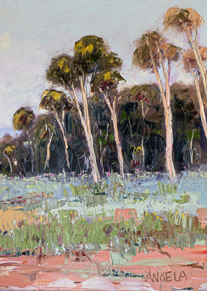 Soft Light by Angela Hawkey captures the serene beauty of a natural landscape through masterful brushwork and subtle colour transitions. This signed original painting depicts a tranquil scene of trees and grass bathed in gentle illumination, showcasing the artist's sophisticated understanding of light and atmosphere. The composition invites contemplation, with carefully rendered foliage and verdant ground creating depth and movement across the canvas. A distinguished addition to any art collection, this work demonstrates Angela's refined technique and emotional sensitivity to the natural world.