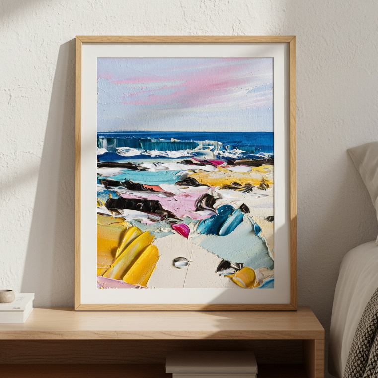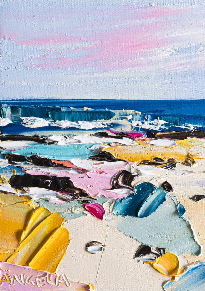 Tide Delight captures the essence of coastal beauty through expressive, vibrant brushwork. This original artwork by Angela Hawkey showcases a dynamic beach landscape rendered in bold, layered colour that evokes the movement of waves and the warmth of seaside light. The composition balances naturalistic elements with artistic interpretation, creating a piece that brings energy and visual interest to any space. Perfect for those seeking authentic contemporary art with genuine emotional resonance.