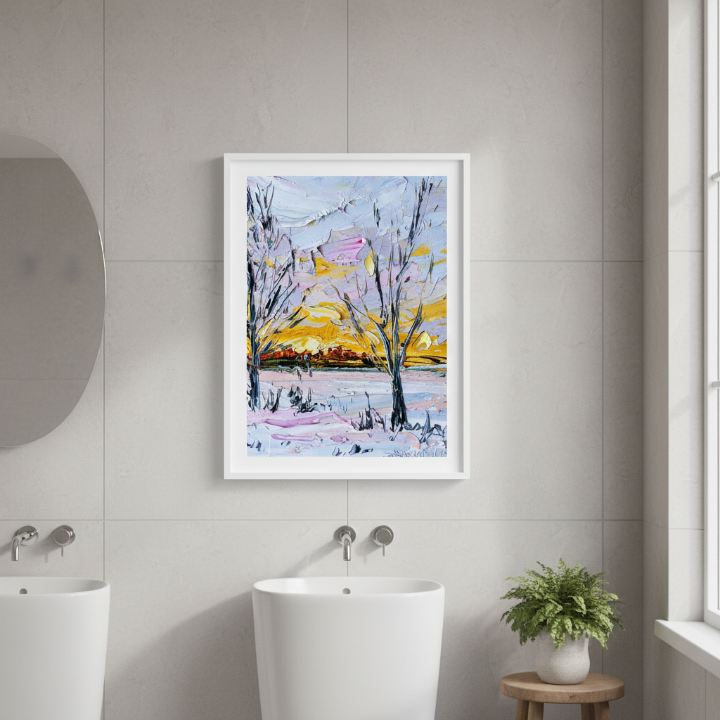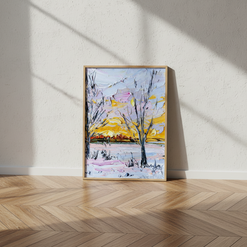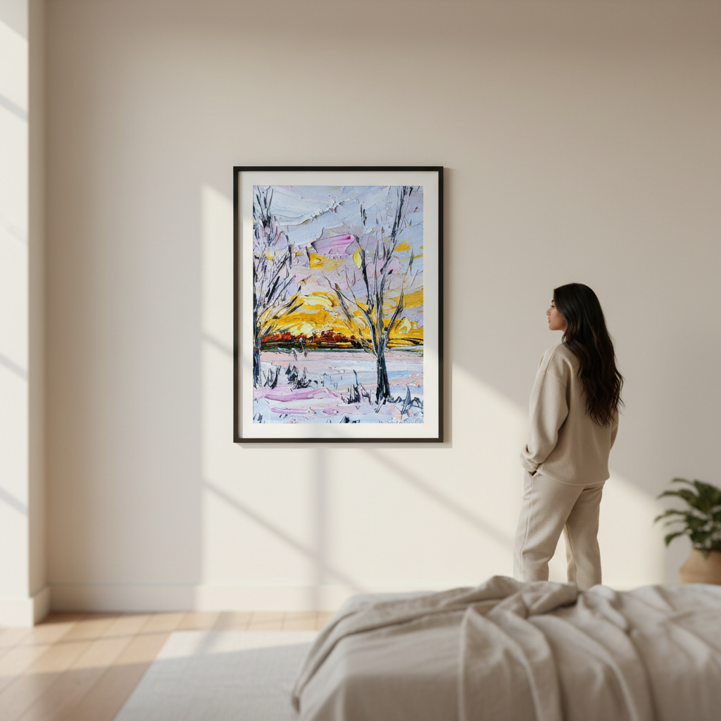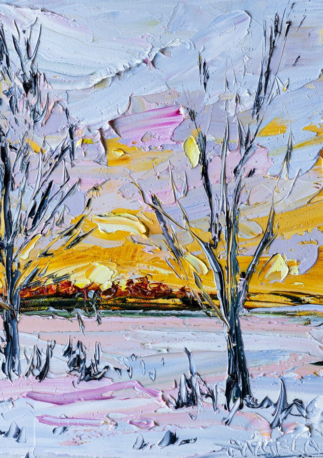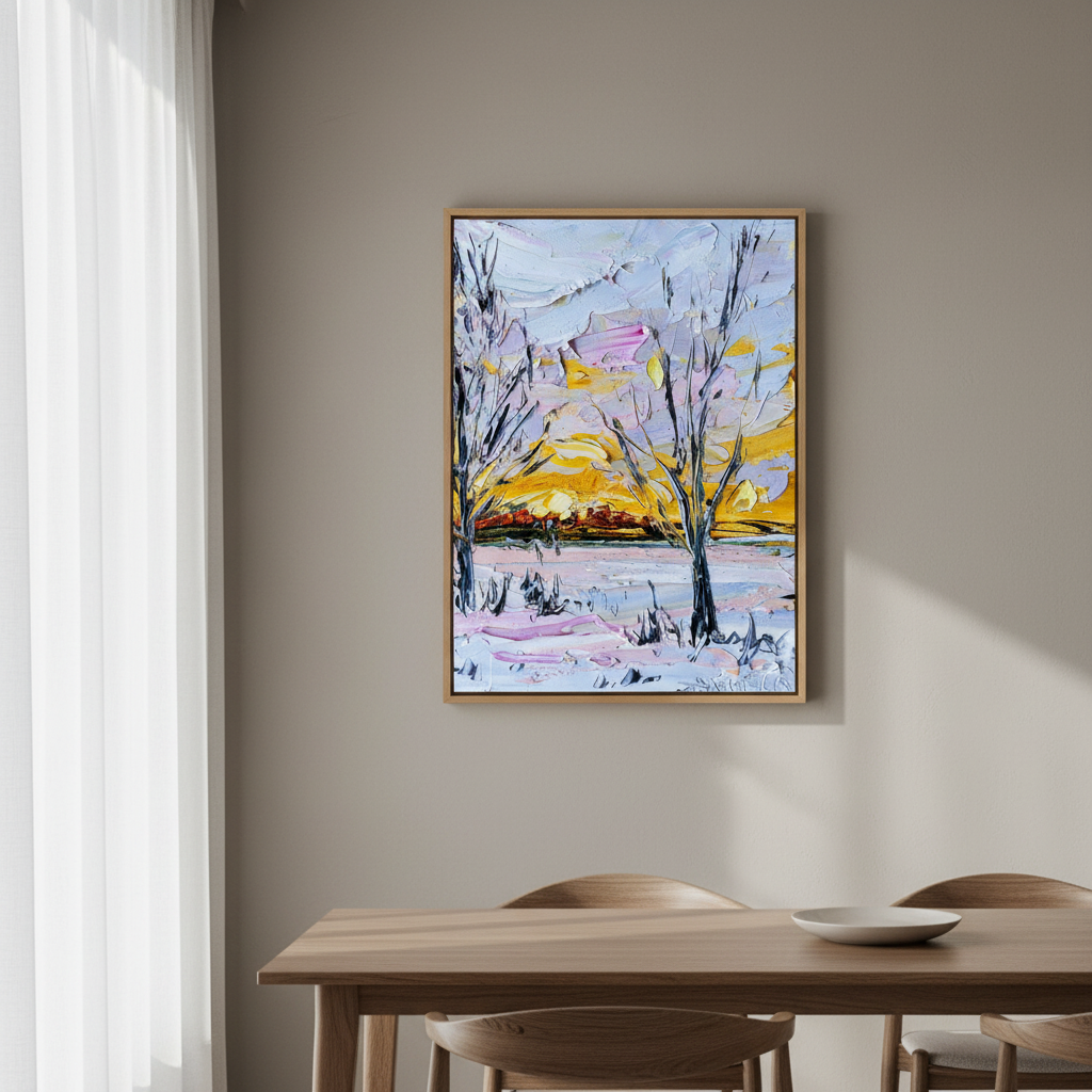Winter's Edge by Angela Hawkey captures the serene intersection of nature and atmosphere through its masterful abstract landscape composition. Featuring stylised trees rendered in bold, expressive strokes against a luminous, multi-hued sky, this piece demonstrates sophisticated colour theory and dynamic brushwork. The interplay between earthy tones and vibrant sky creates visual depth and emotional resonance, drawing the viewer into a contemplative natural scene. Ideal for contemporary interiors seeking artistic sophistication and visual interest.