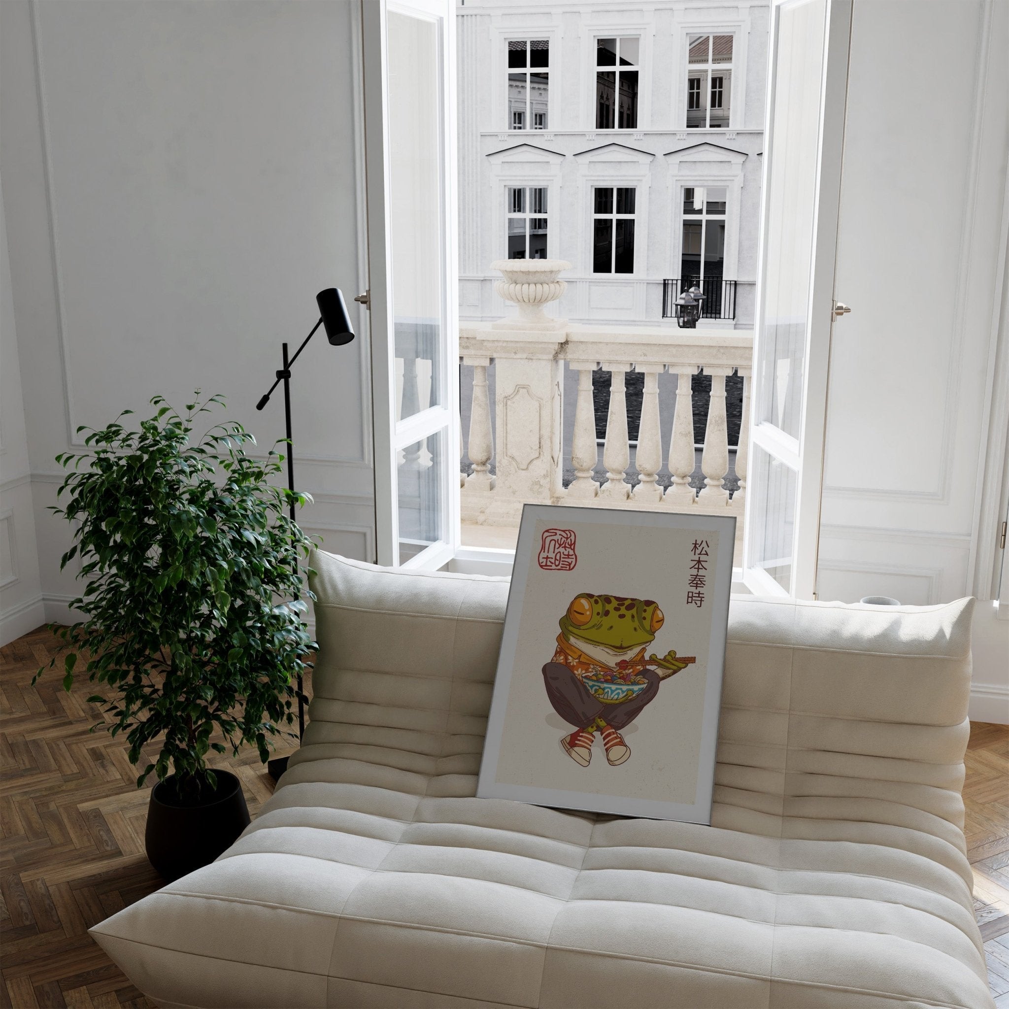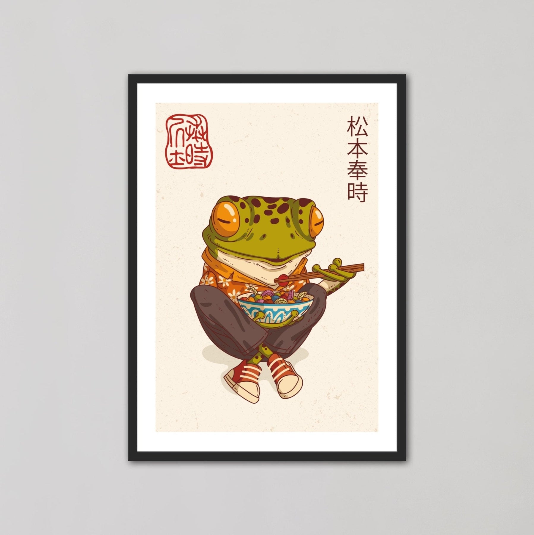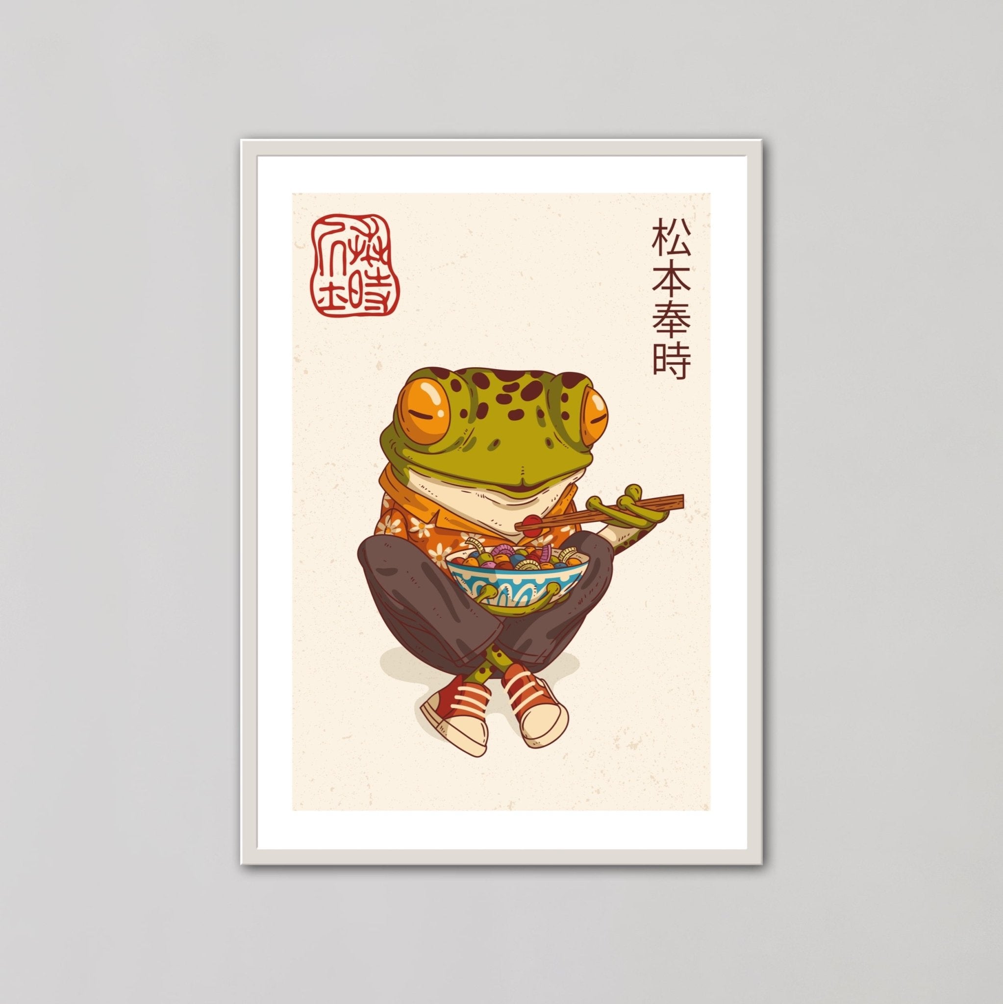 Introducing the captivating 'Japanese Samurai Frog' wall art! This unique piece showcases a delightful scene of a frog using chopsticks to enjoy a bowl of food, adding a touch of whimsy and charm to any space. Crafted with meticulous attention to detail, this artwork effortlessly combines Japanese culture and nature, making it a perfect addition to your home or office decor. Immerse yourself in the playful world of this adorable frog as it brings a sense of joy and tranquility to your surroundings.
