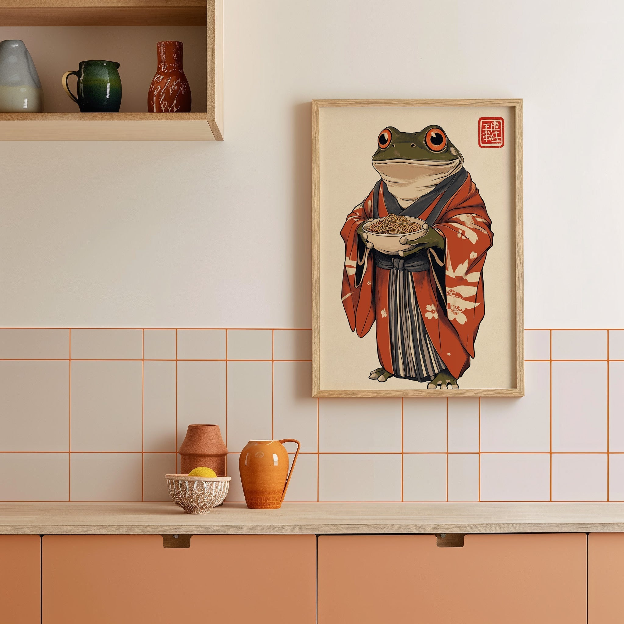Introduce a unique and playful touch to your living room, kitchen, or bedroom with the Japanese Samurai Ramen Bowl Frog Noodle poster. This fun and eye-catching piece will definitely add character to your space. Made with high-quality materials, it is sure to be a conversation starter and a great addition to any decor.