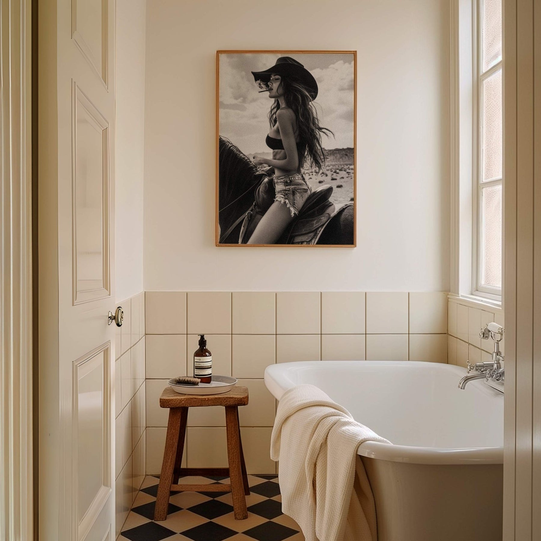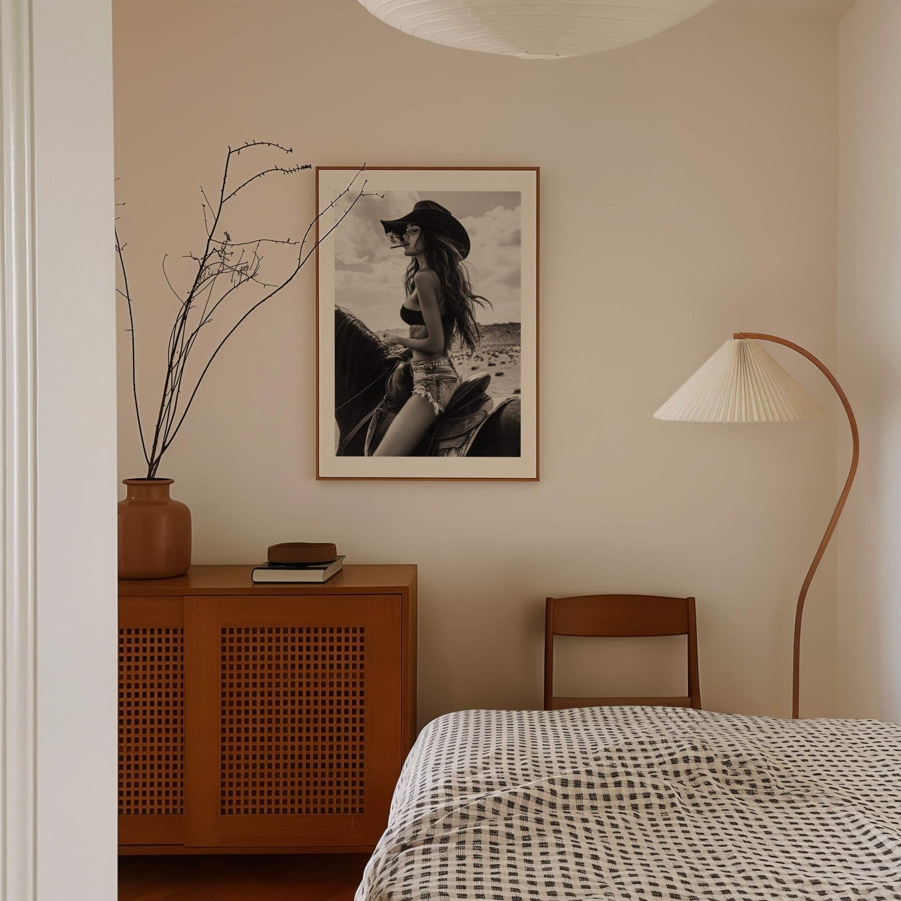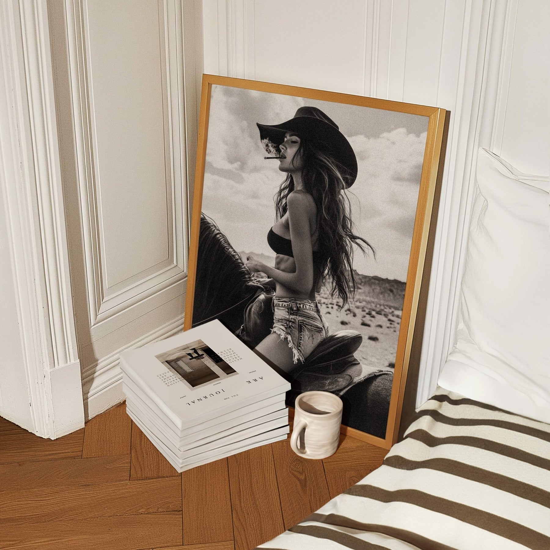 Capture the spirit of the wild with the "Saddle & Smoke" photograph by Julian Van Bausch. This striking image features a daring cowgirl in a desert setting, exuding confidence and allure as she rides her horse while smoking. Perfect for adding a bold, modern edge to your space, this fashion-forward artwork blends rugged outlaw vibes with contemporary style. Elevate your decor with a piece that tells a story of freedom and fearless attitude.