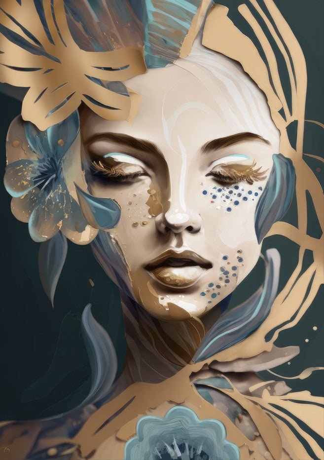 Azura by Bella Eve captures an artistic depiction of a face adorned with floral and geometric patterns in striking gold and blue tones. This contemporary piece blends organic and structured design elements, creating a captivating focal point for any space.