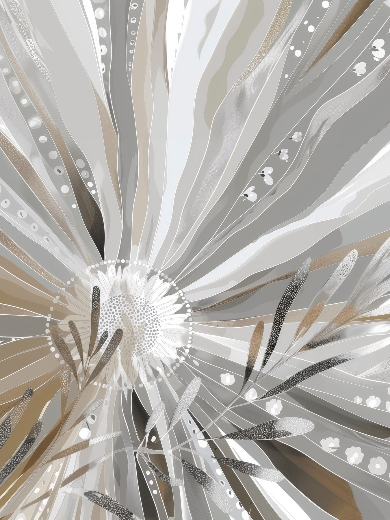 This close-up botanical illustration captures a protea flower radiating outward in sweeping layers of grey, white, and warm beige. Delicate dot patterns and flowing petal forms give the piece a sense of quiet movement and natural complexity. It suits a calm, neutral interior such as a bedroom, living room, or spa-style bathroom. The muted palette works beautifully alongside linen textures, timber furniture, and soft natural materials.