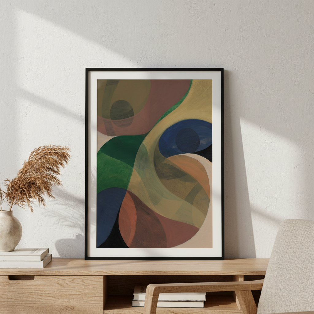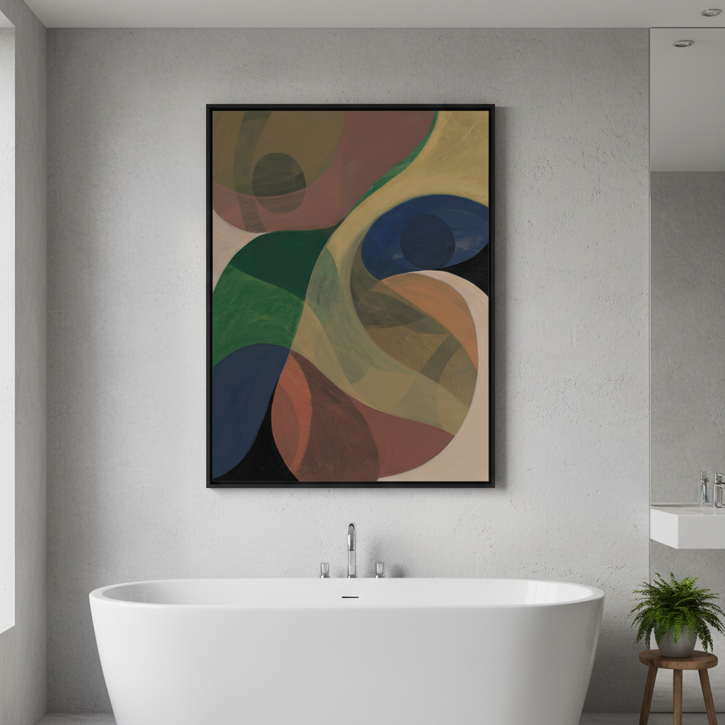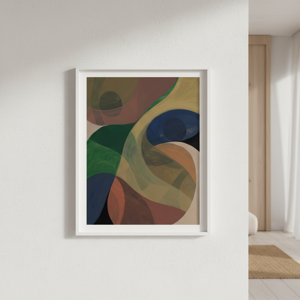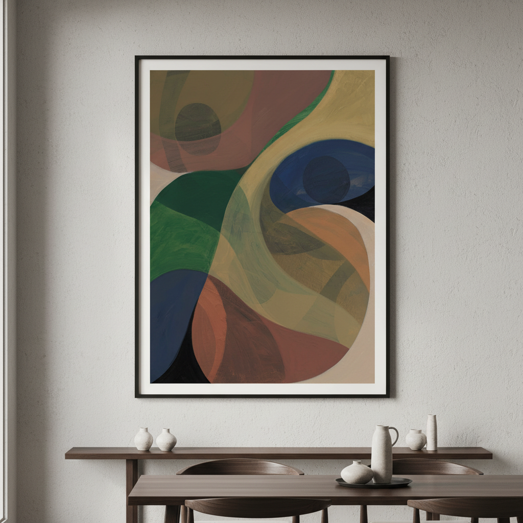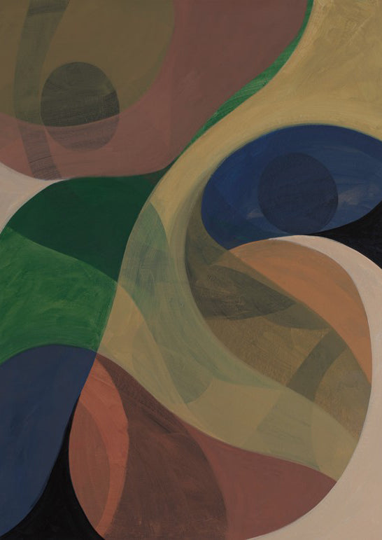 Return by Berit Mongensen Lopez presents a striking composition of vibrant circular forms set against a deep, contrasting background. This abstract piece draws the viewer's eye through dynamic colour interplay, where bold hues create visual rhythm and movement. The geometric circles suggest both celestial bodies and organic forms, inviting personal interpretation. Ideal for contemporary interiors seeking a sophisticated focal point that balances energy with refined aesthetics.