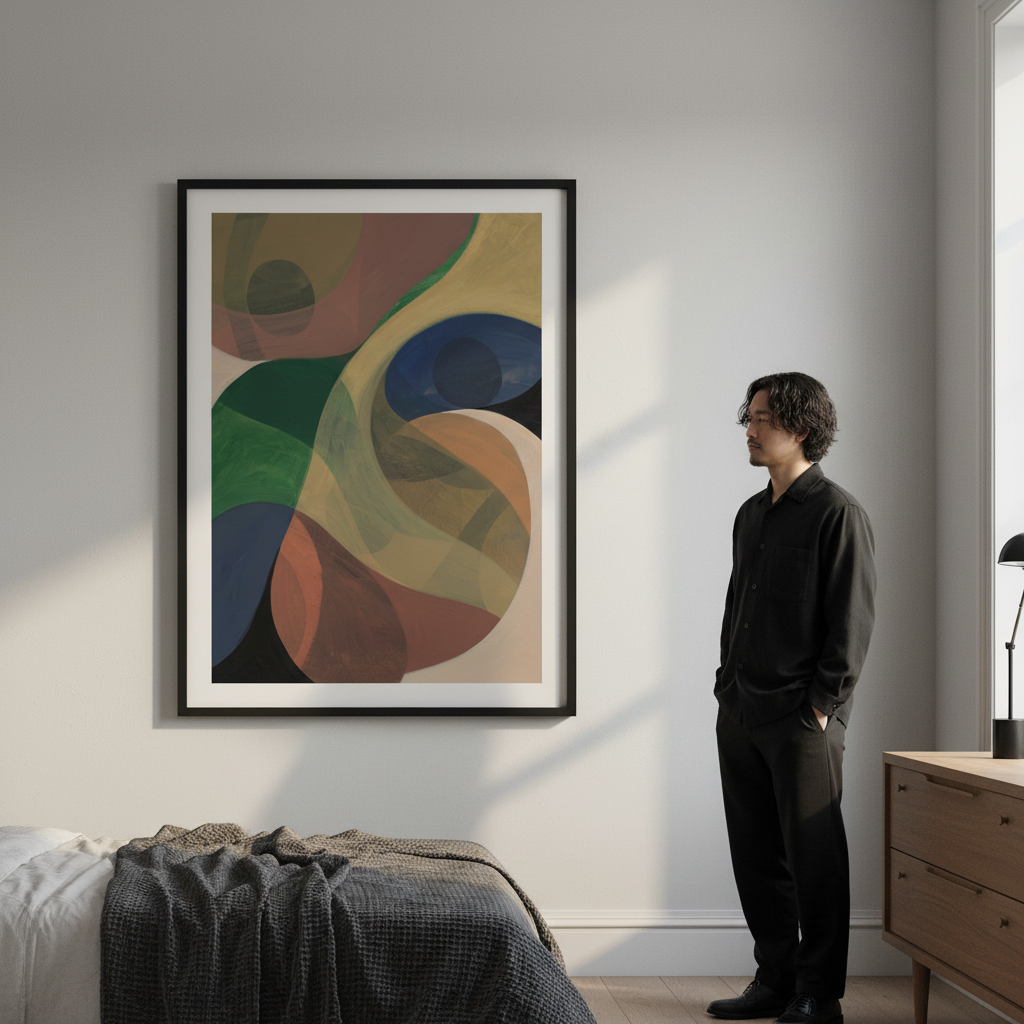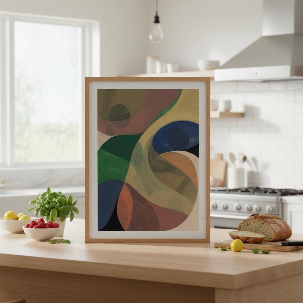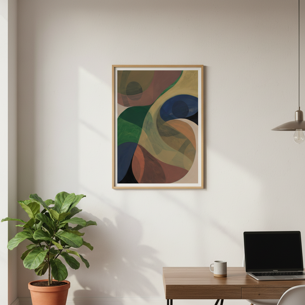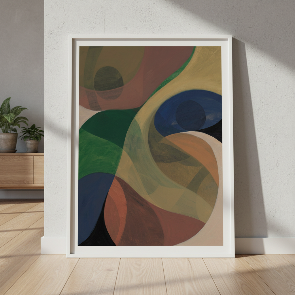 Return by Berit Mongensen Lopez presents a striking composition of vibrant circular forms set against a deep, contrasting background. This abstract piece draws the viewer's eye through dynamic colour interplay, where bold hues create visual rhythm and movement. The geometric circles suggest both celestial bodies and organic forms, inviting personal interpretation. Ideal for contemporary interiors seeking a sophisticated focal point that balances energy with refined aesthetics.