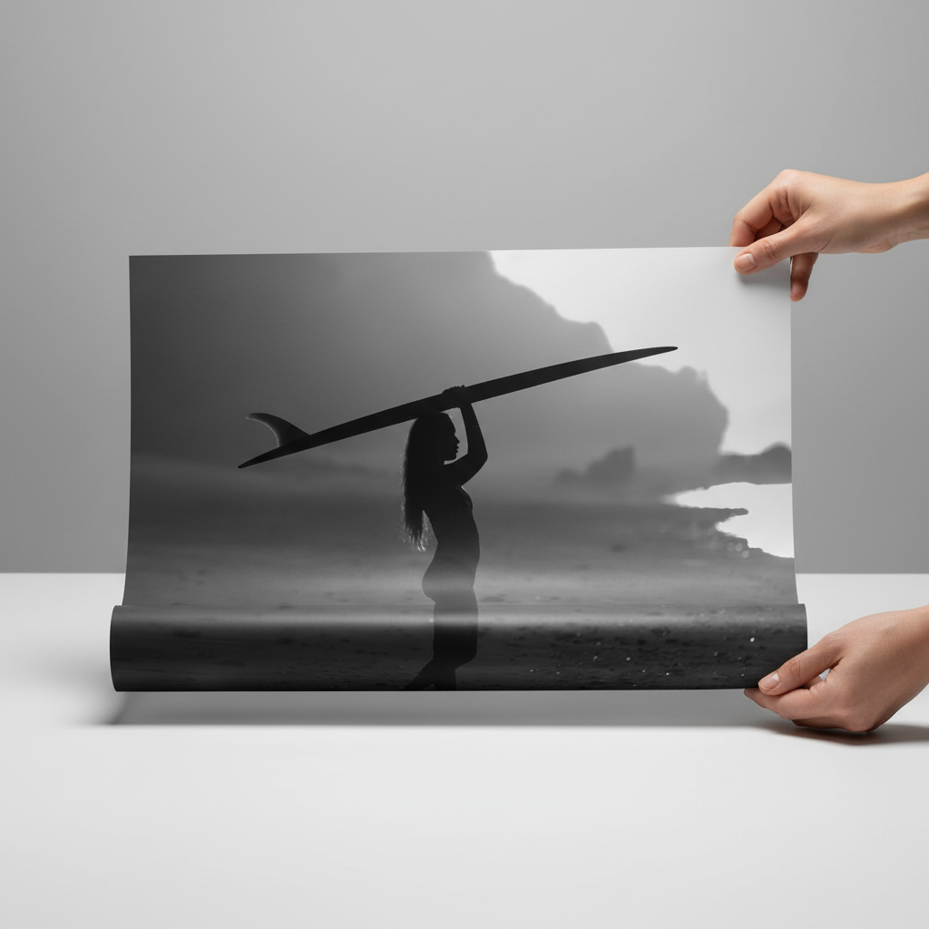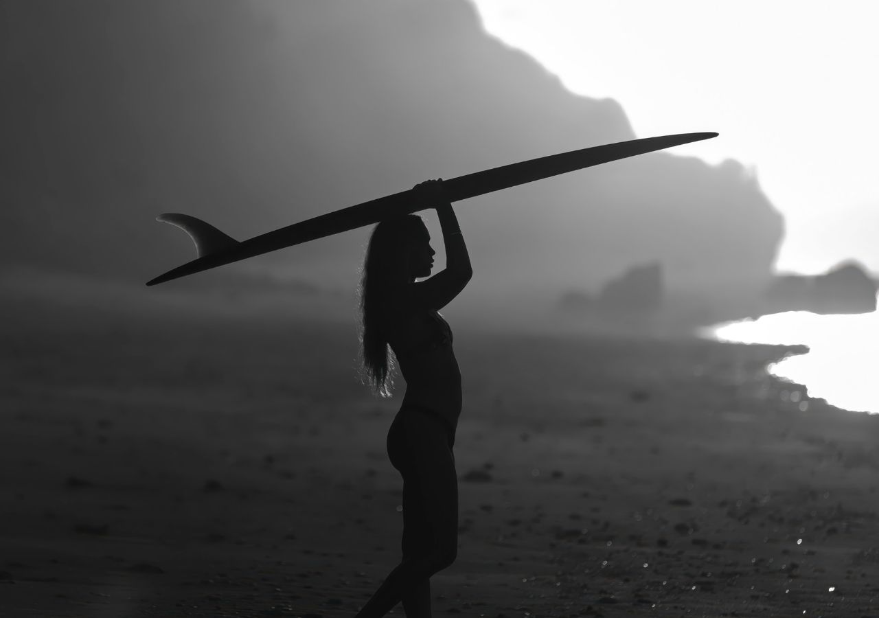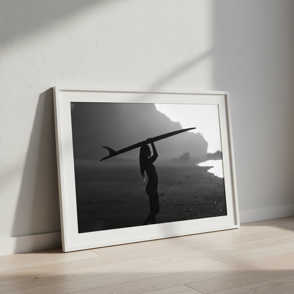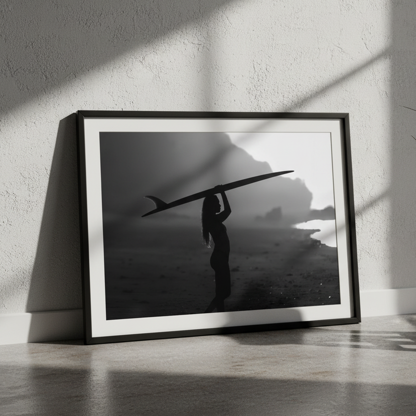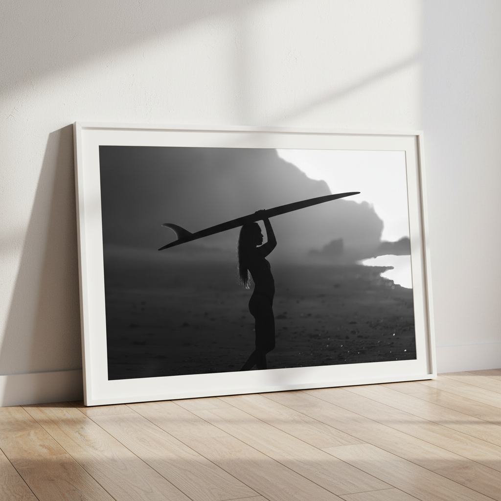 Rising Coast explores strength, balance, and quiet determination. Captured in silhouette, the figure moves across the shoreline with the surfboard held overhead, framed against soft light and shadowed landscape.