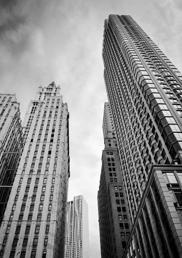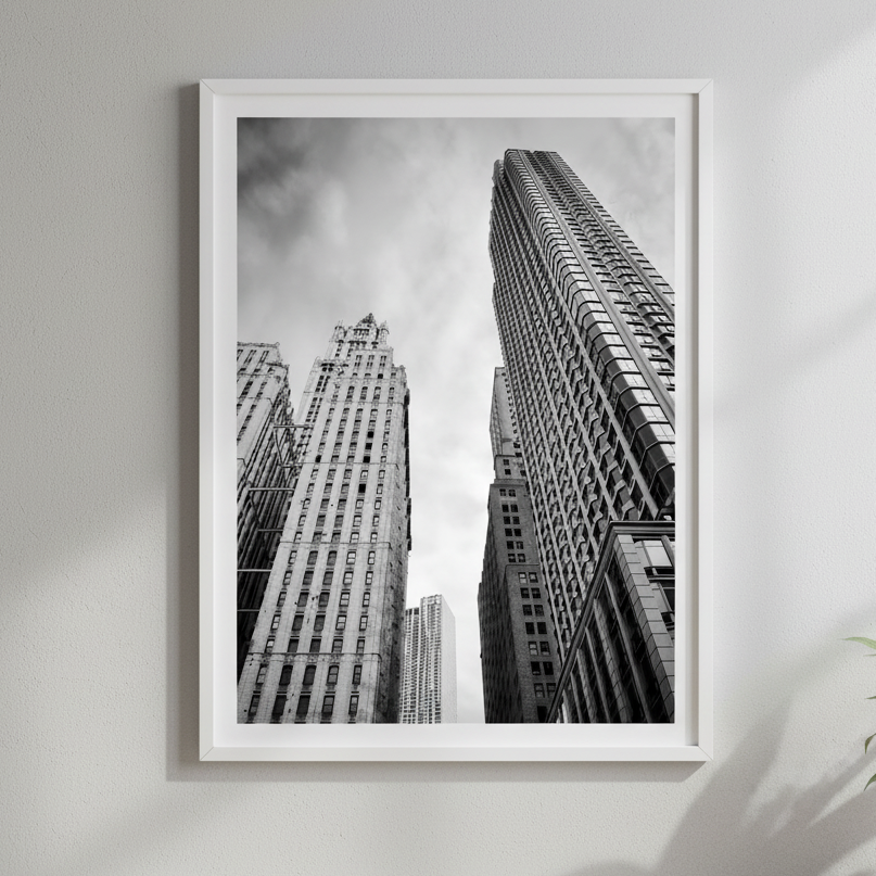 Barclay Street captures the architectural drama of urban verticality through Cordula Schaefer's masterful monochromatic lens. Towering structures pierce a moody, cloud-laden sky, their geometric forms rendered in striking contrast. This black and white composition emphasises the interplay between solid geometry and atmospheric depth, creating a contemplative study of the built environment. The photograph's tonal range and compositional balance make it a sophisticated addition to contemporary interior spaces, particularly those seeking to evoke urban sophistication and artistic refinement.