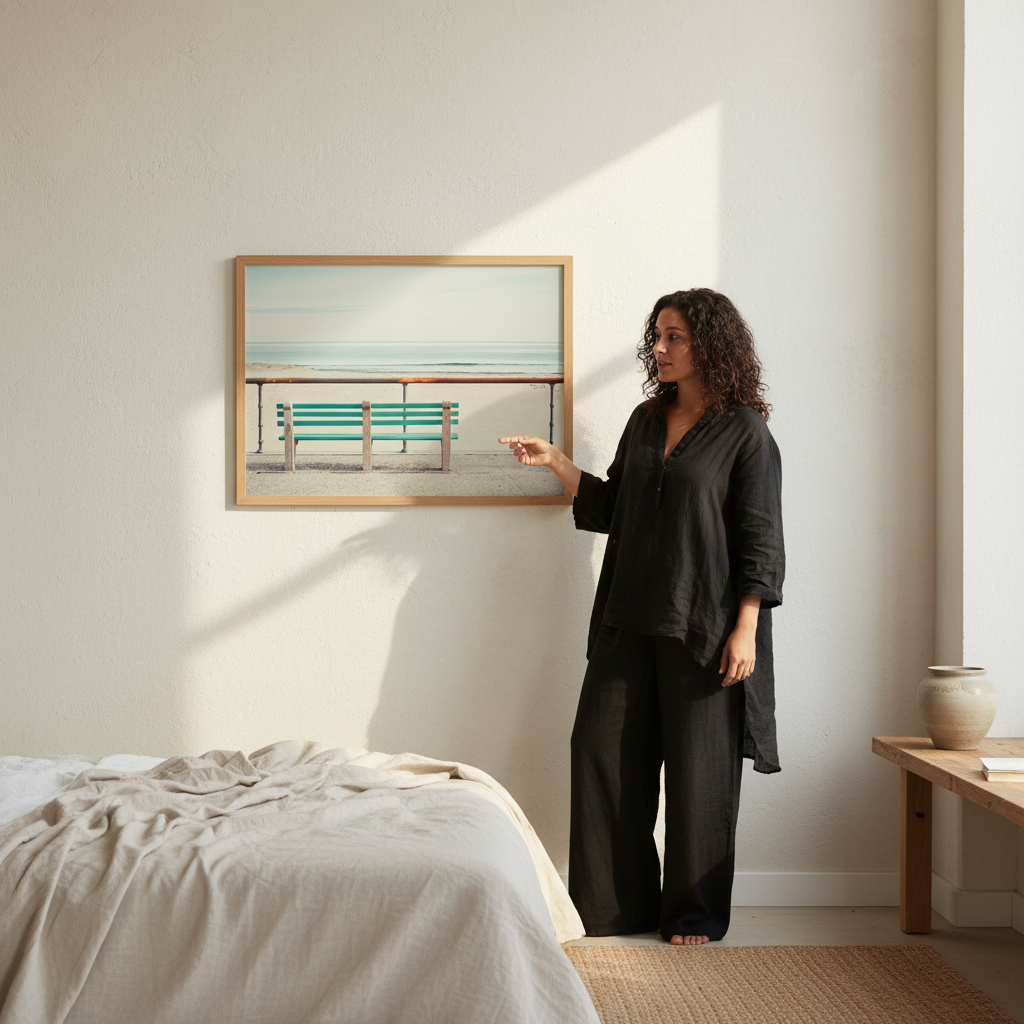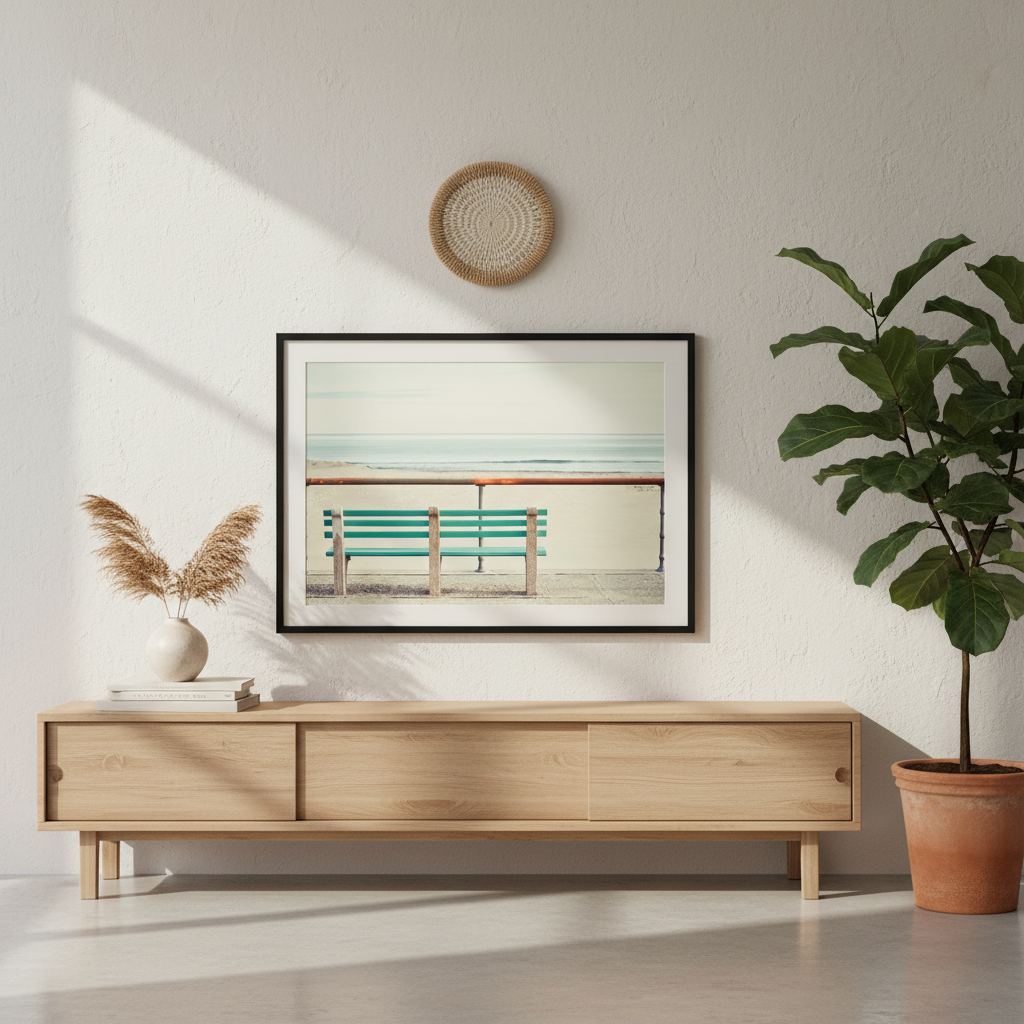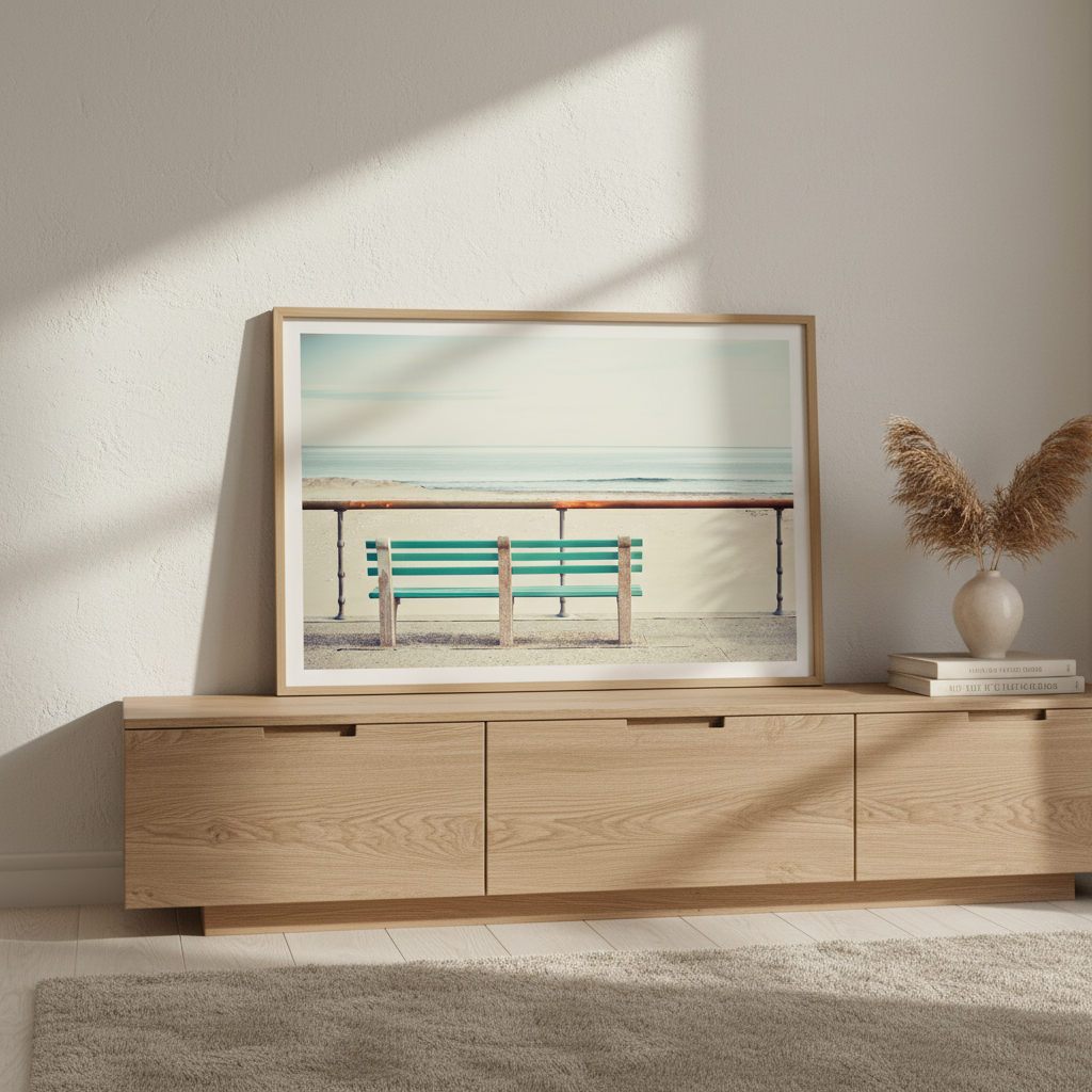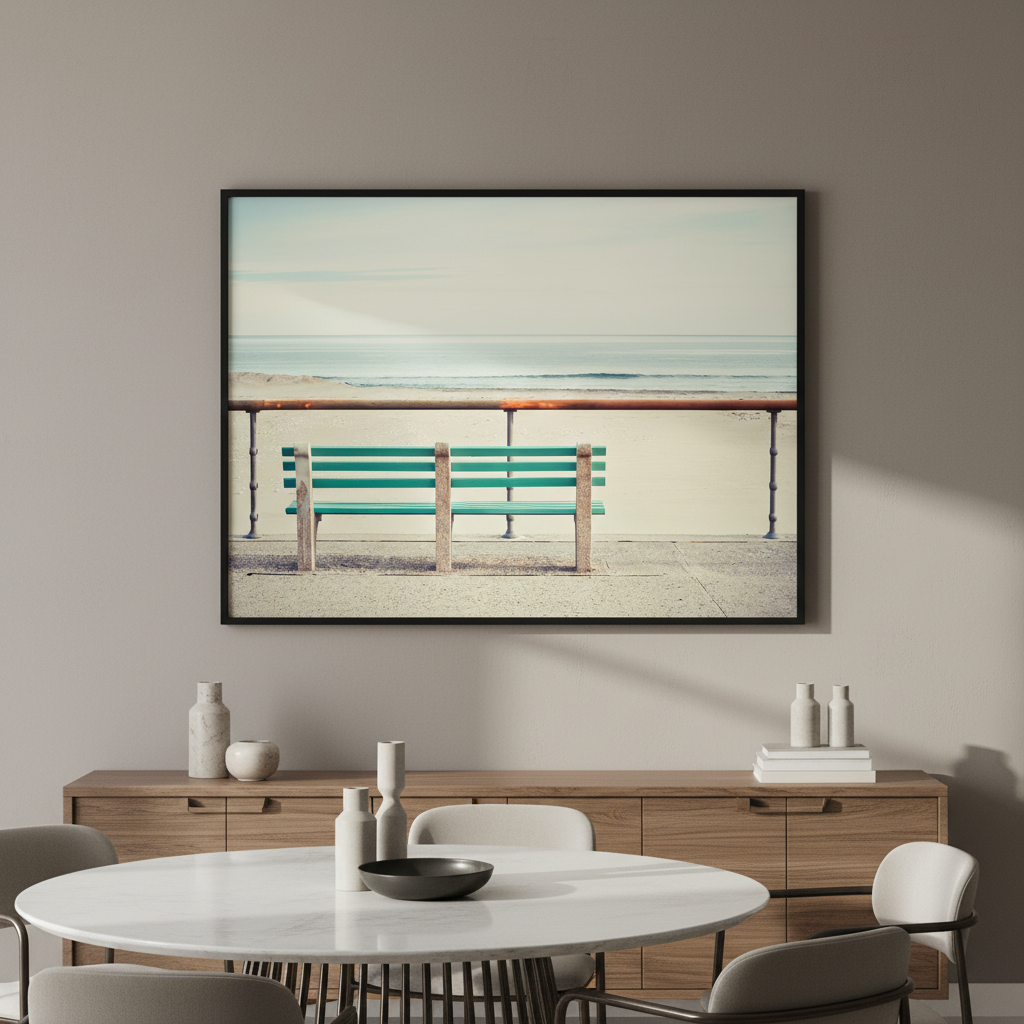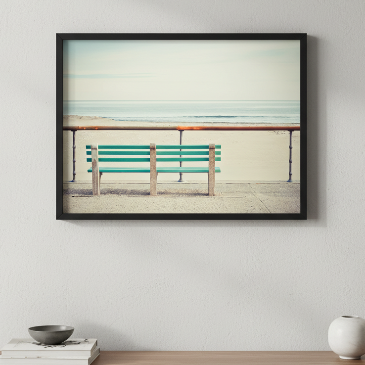 Immerse yourself in coastal serenity with this striking artwork by Cordula Schaefer. The composition captures a solitary green bench positioned on a weathered pier, inviting contemplation and rest. Soft, impressionistic ocean tones blur in the background, creating atmospheric depth and drawing focus to the bench as a symbol of pause and reflection. The interplay of vibrant green against muted water hues produces a calming yet visually compelling piece. Ideal for those seeking to introduce a meditative, nature-inspired element to their interior spaces, this work evokes the peaceful solitude of coastal moments.