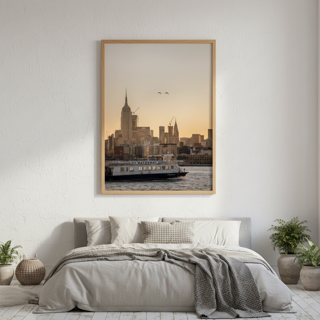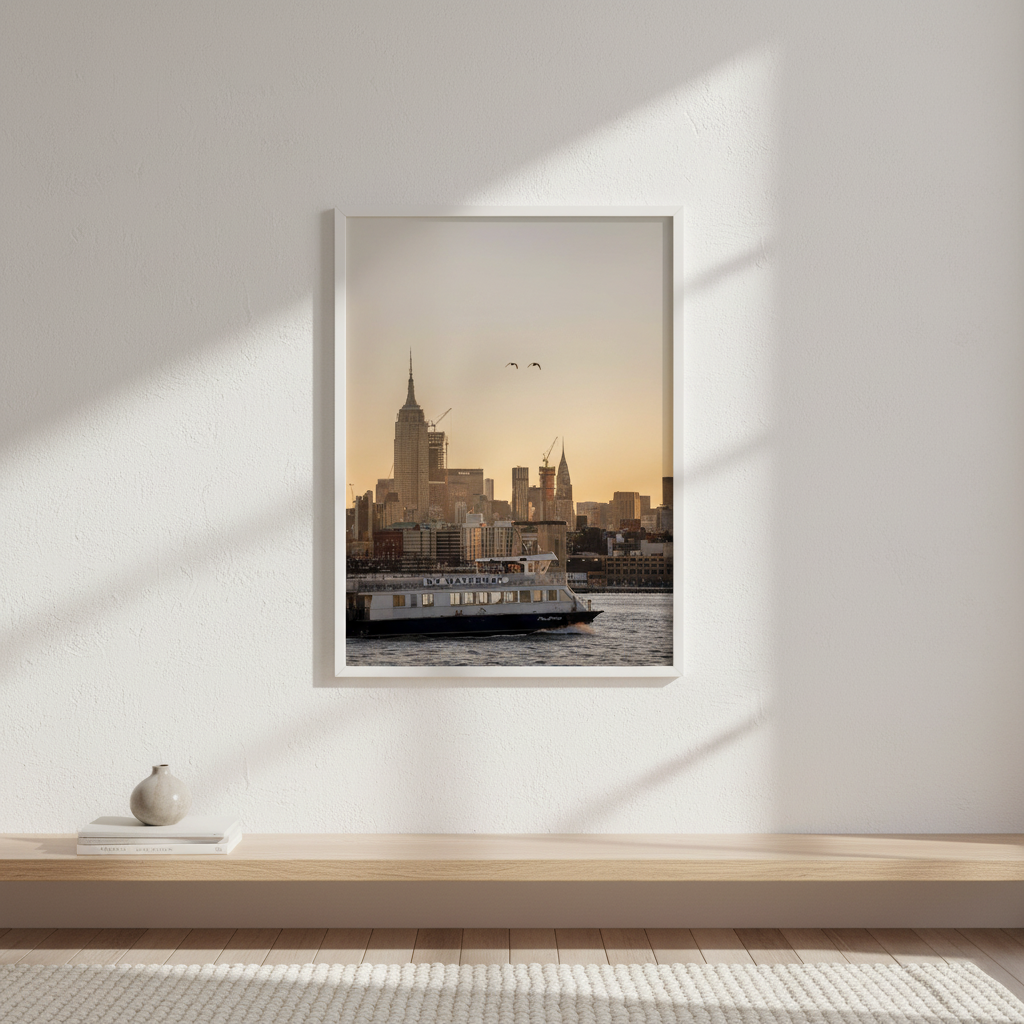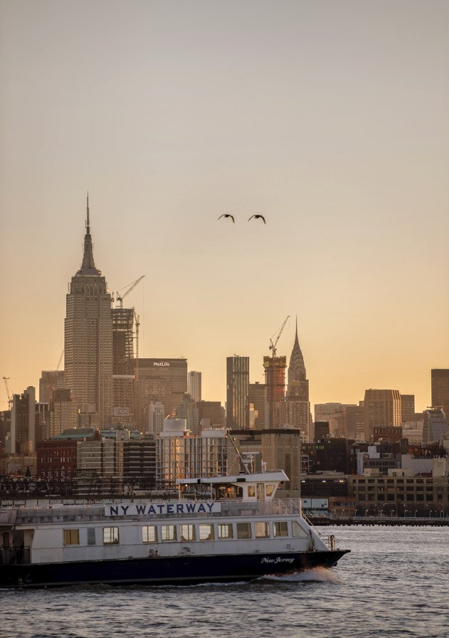 Manhattan Transfer by Cordula Schaefer captures an iconic New York moment with artistic precision. This striking composition depicts the city's legendary skyline silhouetted against a luminous sunset, while a NY Waterway ferry traverses the foreground waters. The interplay of warm golden light and deep urban shadows creates atmospheric depth, celebrating the energy and romance of Manhattan's waterfront. Perfect for those who appreciate urban landscapes and the distinctive character of New York City's maritime heritage. An evocative piece that transforms any space into a window onto one of the world's most dynamic cities.