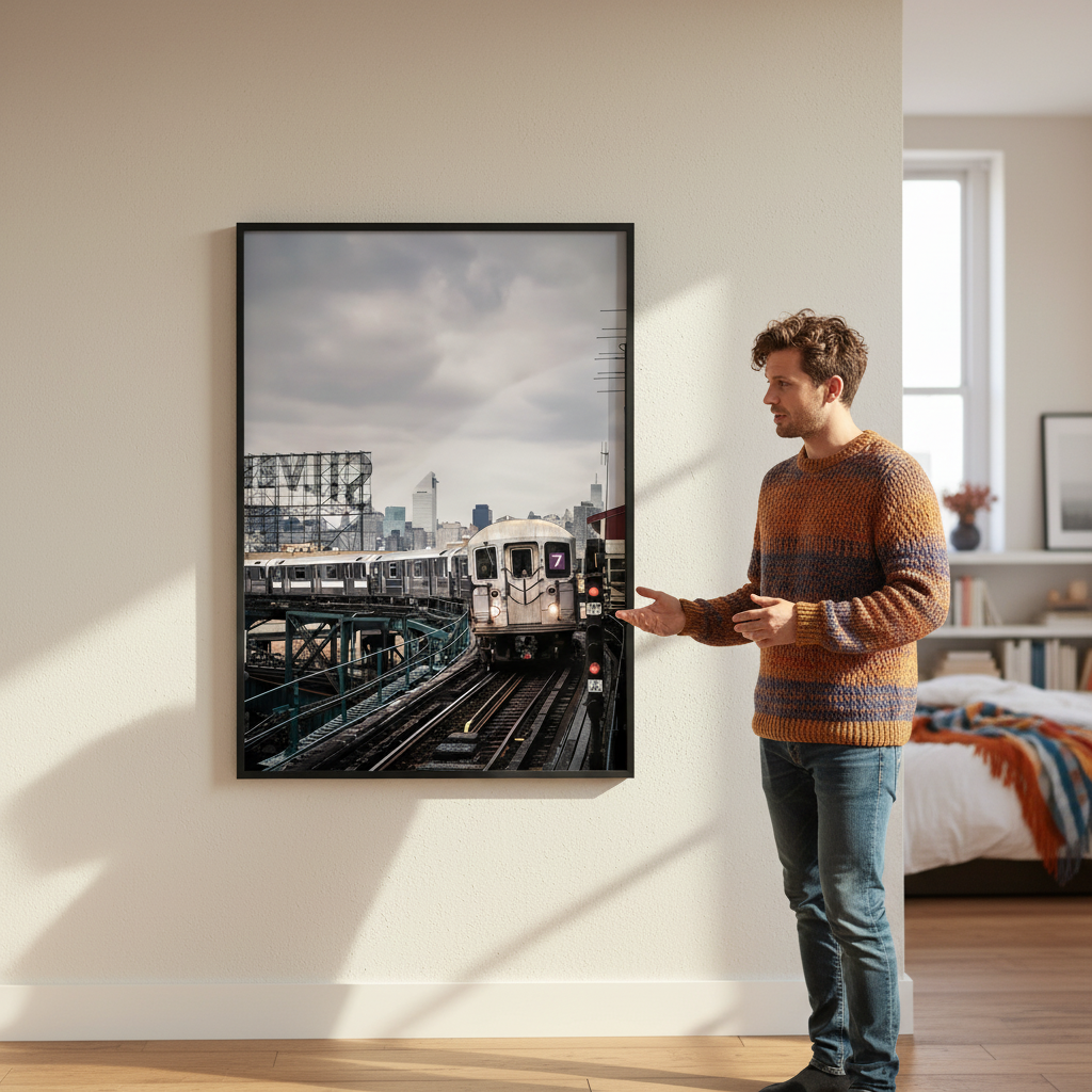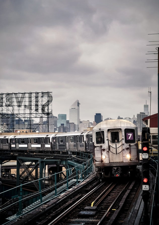 On the 7 by Cordula Schaefer captures an iconic urban moment with striking compositional clarity. This artwork depicts a subway train navigating its tracks while the city skyline rises dramatically in the distance, anchored by a prominent Levi's billboard that grounds the scene in authentic metropolitan culture. The piece exemplifies contemporary urban photography, balancing industrial infrastructure with commercial landscape elements to create a compelling narrative about modern city life. Perfect for collectors seeking thought-provoking imagery that explores the intersection of transit, commerce, and urban architecture.