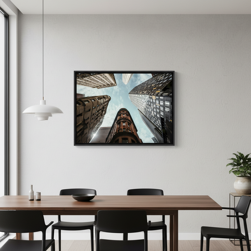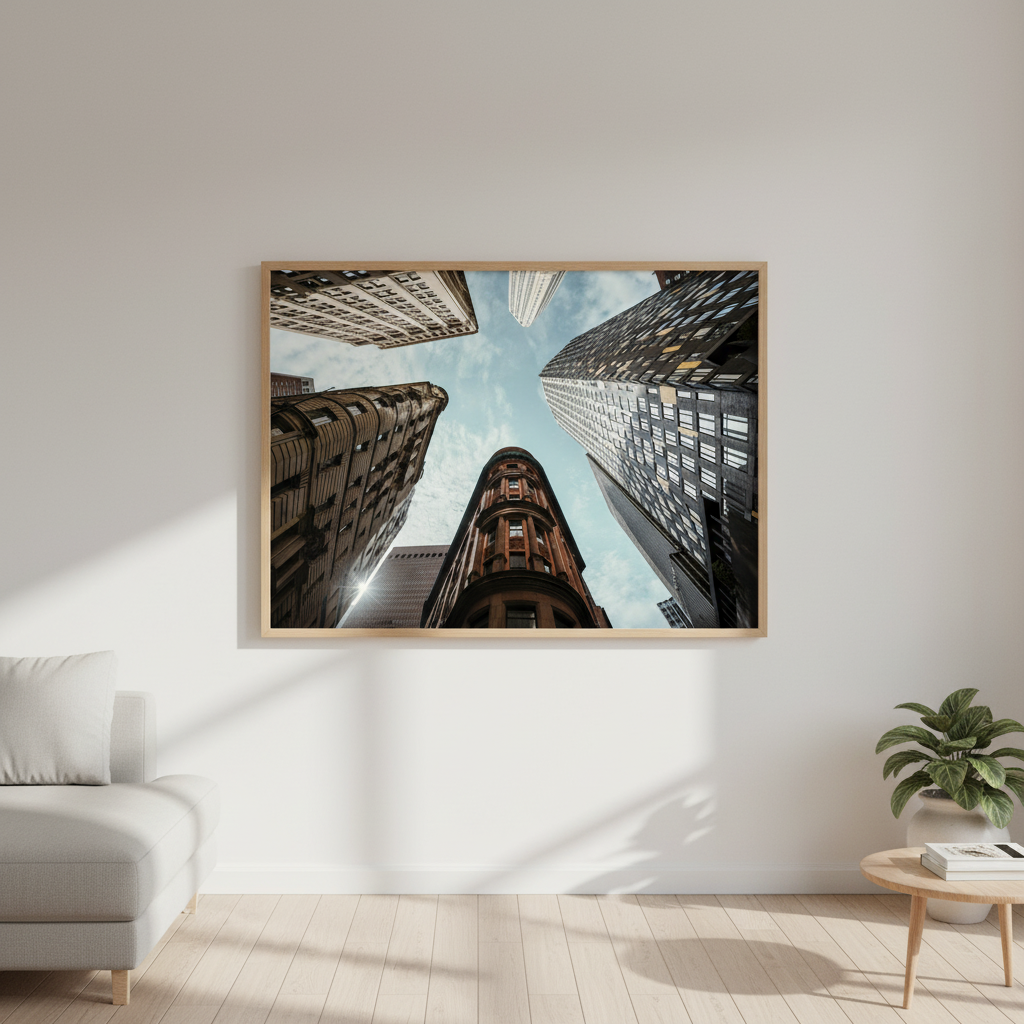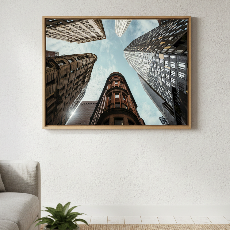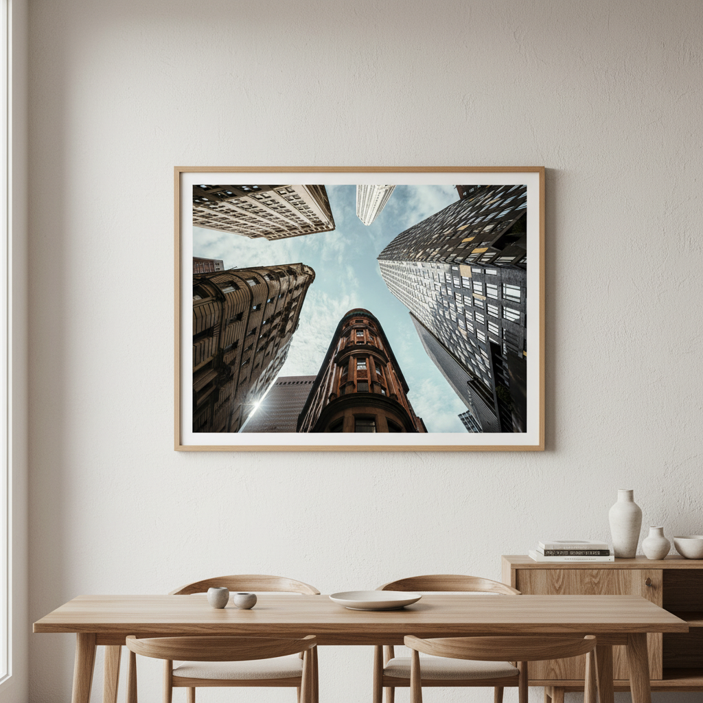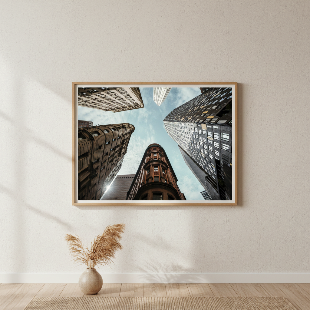The Maze by Cordula Schaefer captures an arresting perspective of urban architecture, presenting towering buildings converging toward a luminous blue sky. This compelling composition leverages a vertiginous upward gaze to transform familiar cityscapes into an abstract study of geometric forms and spatial relationships. The interplay between the imposing structures and expansive sky creates a striking visual tension that commands attention. Ideal for contemporary interiors seeking to inject sophistication and visual intrigue, this piece demonstrates masterful command of perspective and light, elevating any space with its architectural drama and contemplative quality.