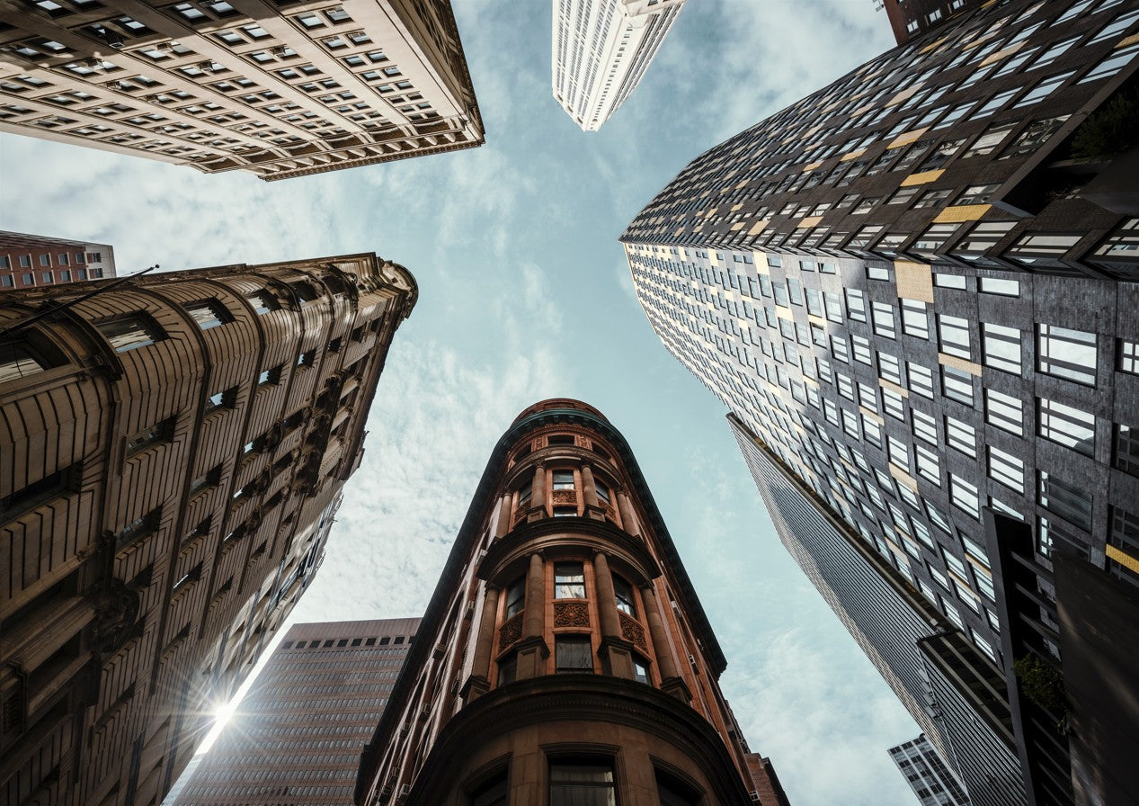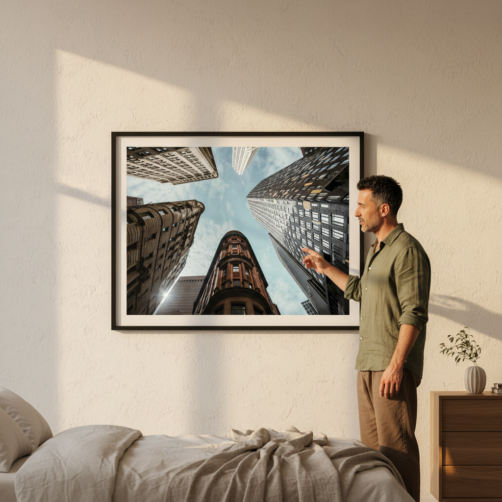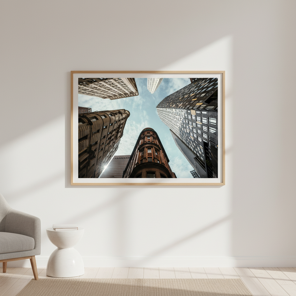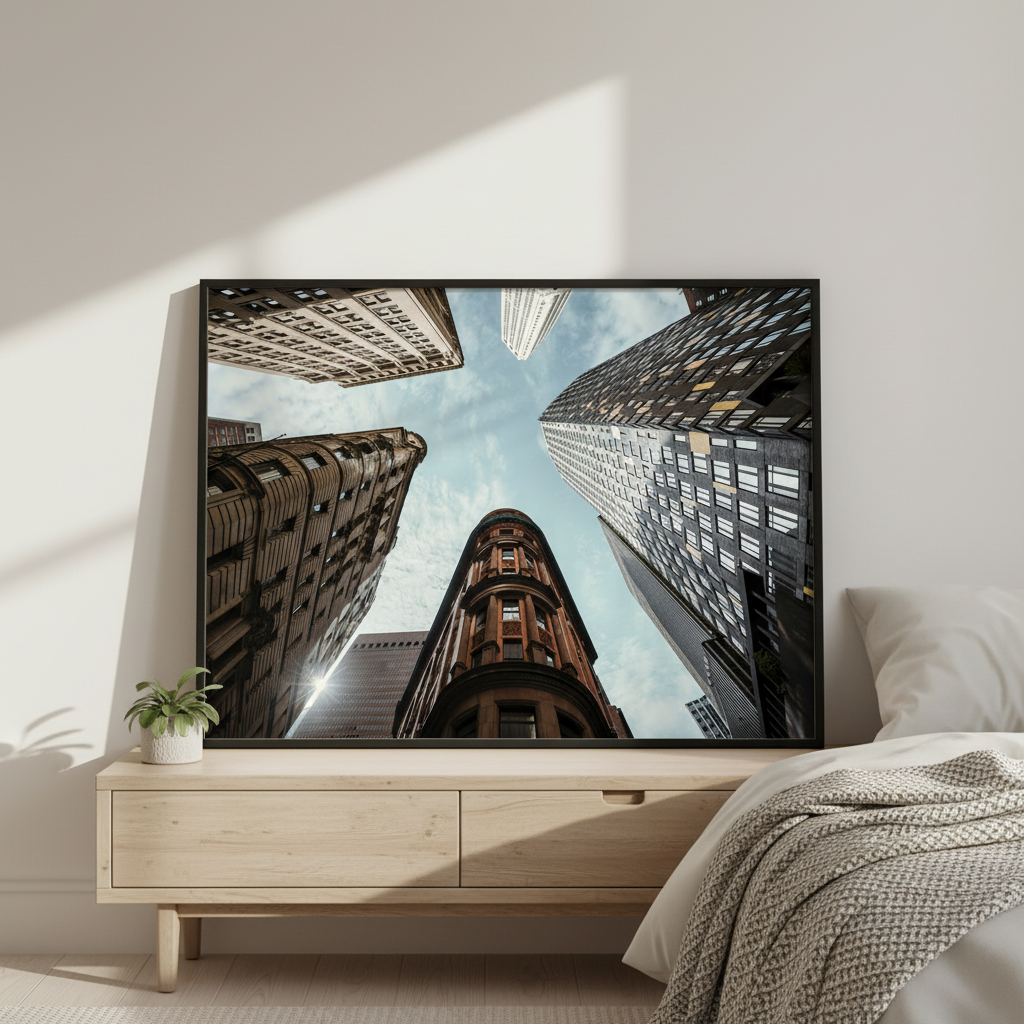 The Maze by Cordula Schaefer captures an arresting perspective of urban architecture, presenting towering buildings converging toward a luminous blue sky. This compelling composition leverages a vertiginous upward gaze to transform familiar cityscapes into an abstract study of geometric forms and spatial relationships. The interplay between the imposing structures and expansive sky creates a striking visual tension that commands attention. Ideal for contemporary interiors seeking to inject sophistication and visual intrigue, this piece demonstrates masterful command of perspective and light, elevating any space with its architectural drama and contemplative quality.