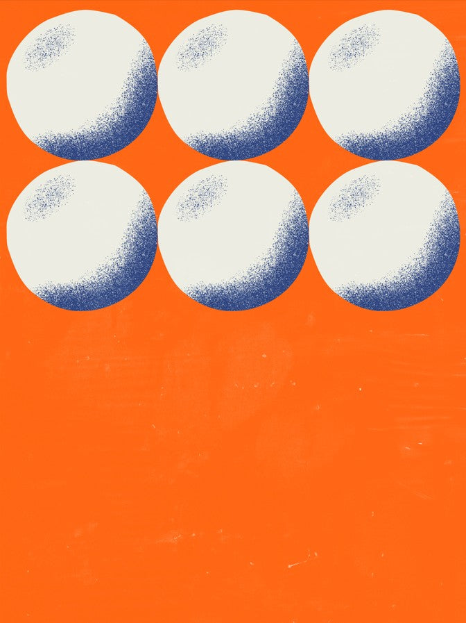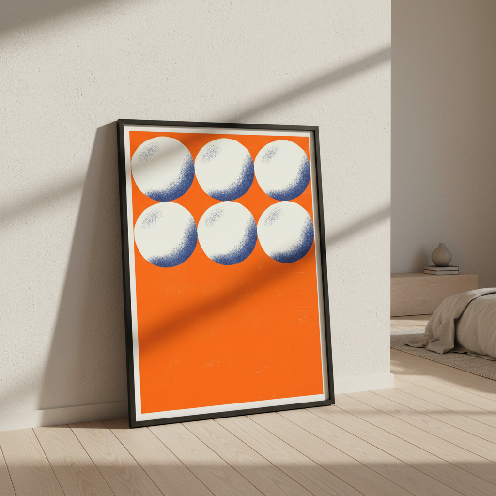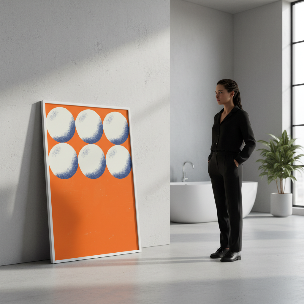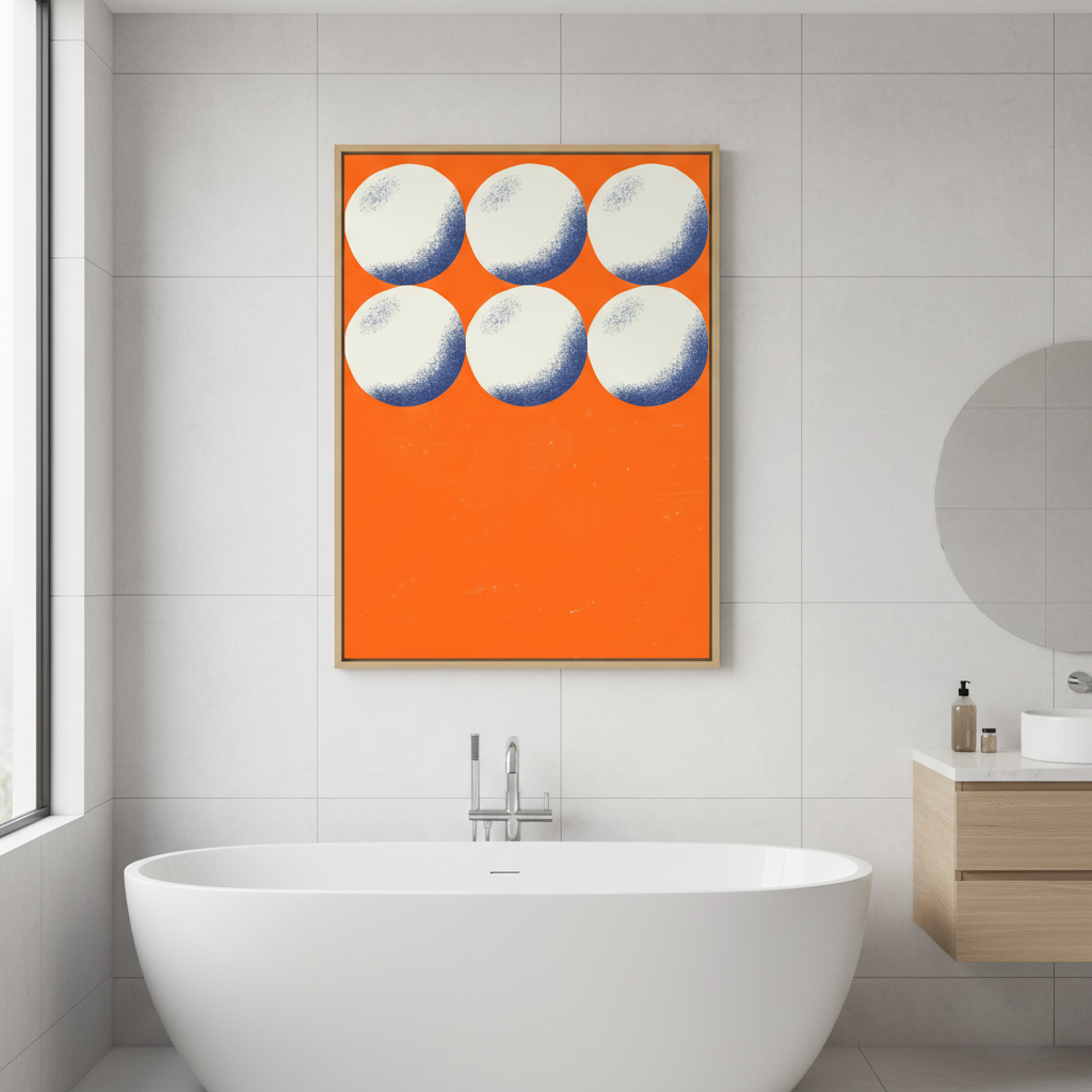 Sphere Sequence by Dusan Lilic presents a striking composition of geometric abstraction, featuring crisp white circles arranged across a warm orange ground. This contemporary artwork exemplifies minimalist design principles through its restrained palette and deliberate spatial arrangement. The interplay between the circular forms and their background creates visual rhythm and movement, inviting contemplation of form and negative space. Ideal for modern interiors seeking sophisticated visual interest without overwhelming complexity.