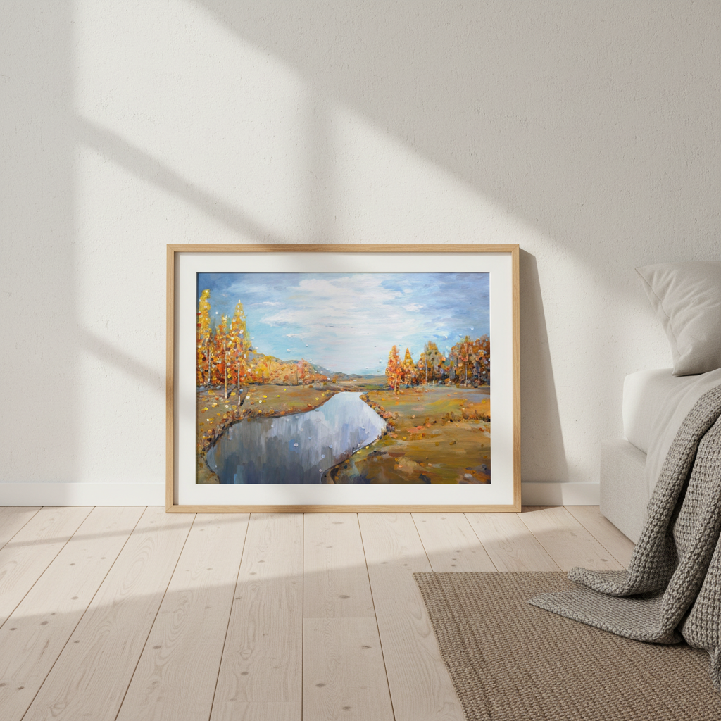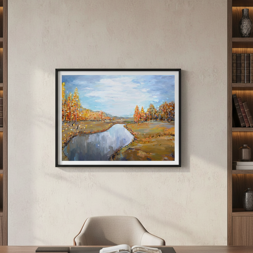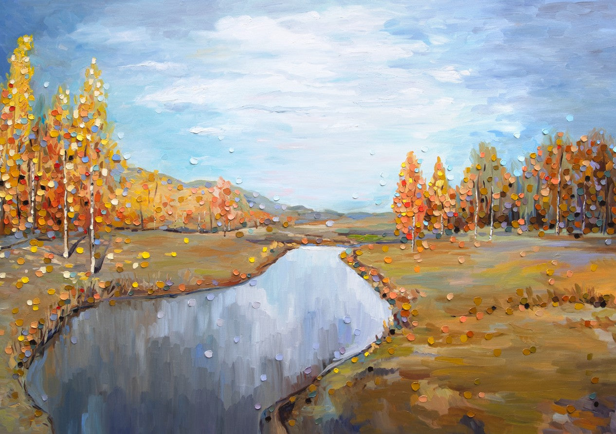 Autumn by Ekaterina Ermilkina captures the serene beauty of a natural landscape through masterful brushwork. This compelling composition features towering trees framing a tranquil river, while a luminous blue sky bathes the scene in atmospheric light. The artist's expert handling of colour and perspective creates depth and movement, drawing the viewer into a moment of peaceful contemplation. An ideal choice for those seeking to introduce landscape artistry and natural elegance into their interior spaces.