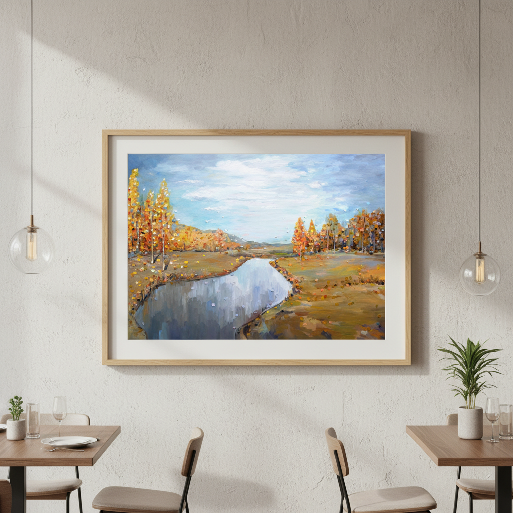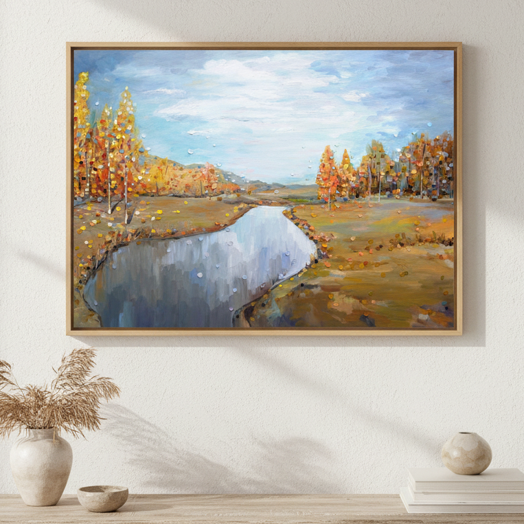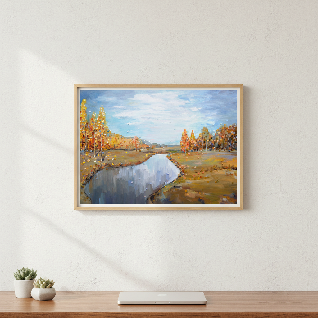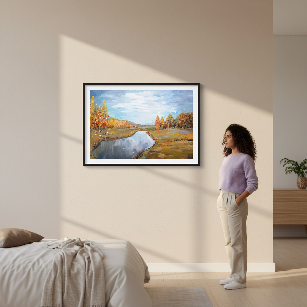 Autumn by Ekaterina Ermilkina captures the serene beauty of a natural landscape through masterful brushwork. This compelling composition features towering trees framing a tranquil river, while a luminous blue sky bathes the scene in atmospheric light. The artist's expert handling of colour and perspective creates depth and movement, drawing the viewer into a moment of peaceful contemplation. An ideal choice for those seeking to introduce landscape artistry and natural elegance into their interior spaces.