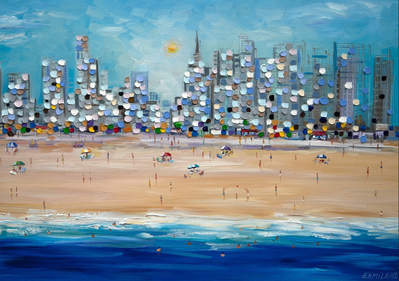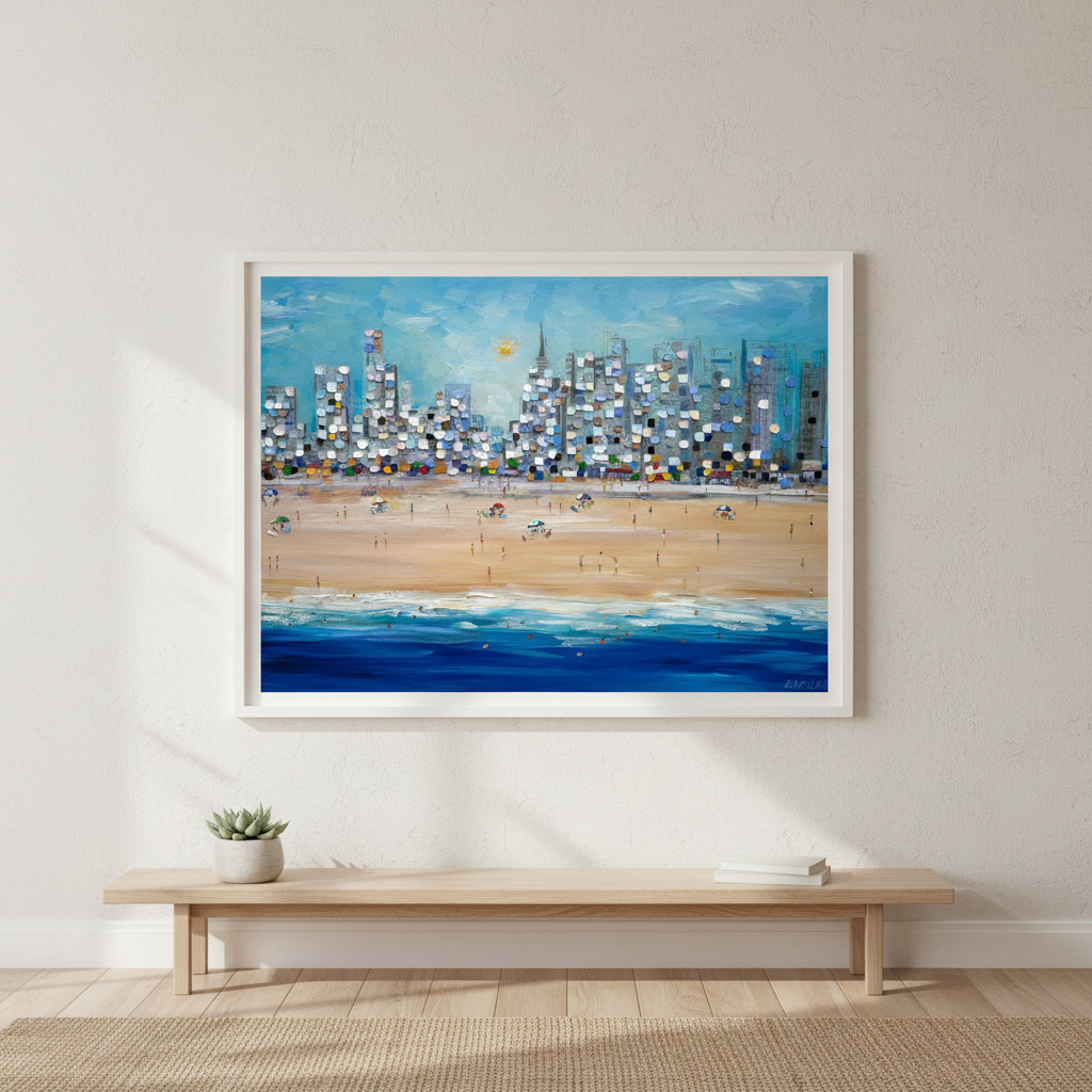 City Beach by Ekaterina Ermilkina captures the dynamic interplay between urban architecture and coastal serenity. This striking composition juxtaposes a vibrant beachfront with a commanding city skyline, creating visual depth and narrative tension. The artist's masterful handling of light and colour draws the viewer's eye across the canvas, from the foreground's sandy shores to the distant metropolitan landscape. Perfect for contemporary interiors seeking a sophisticated balance between nature and civilization, this piece invites contemplation of how these two worlds coexist and complement one another.