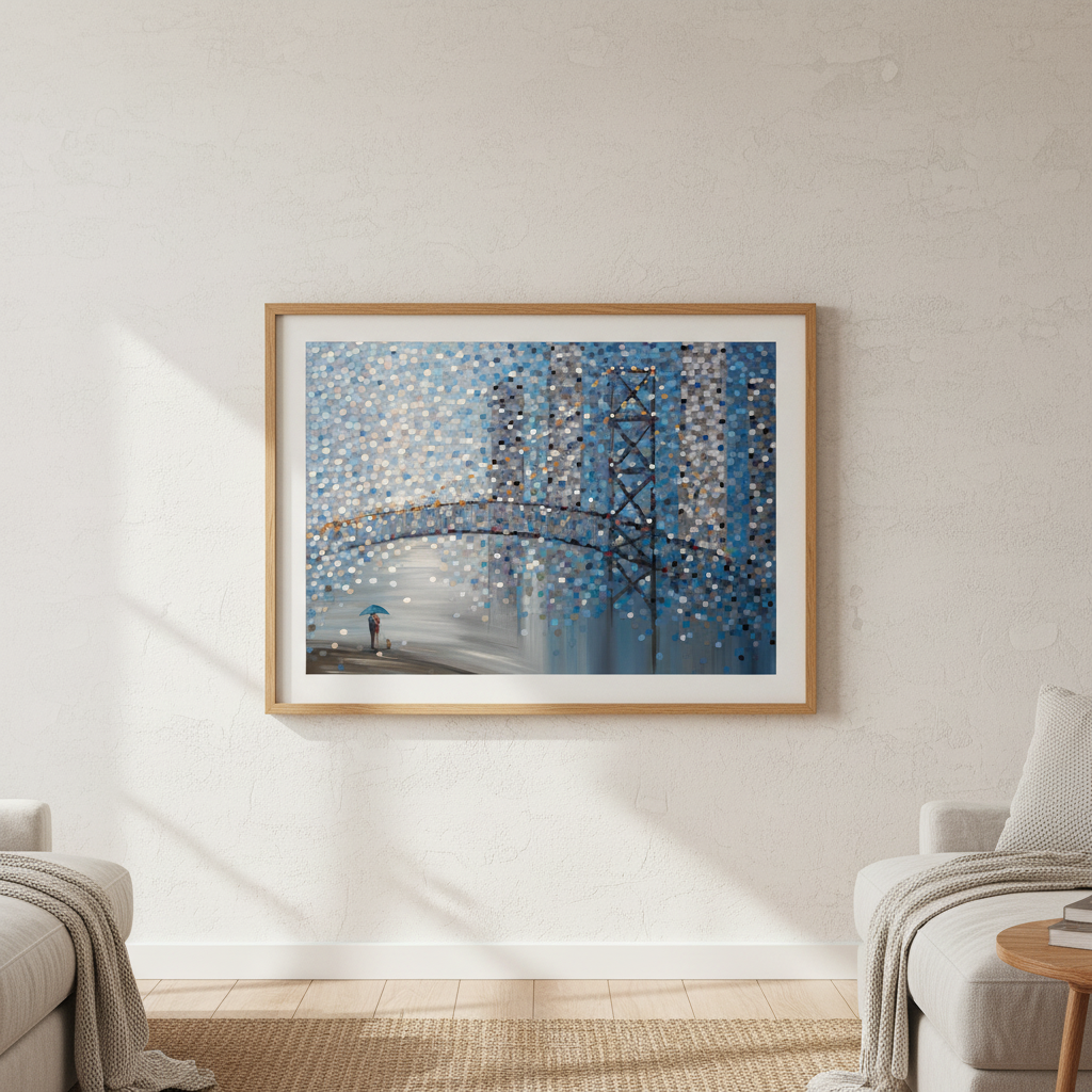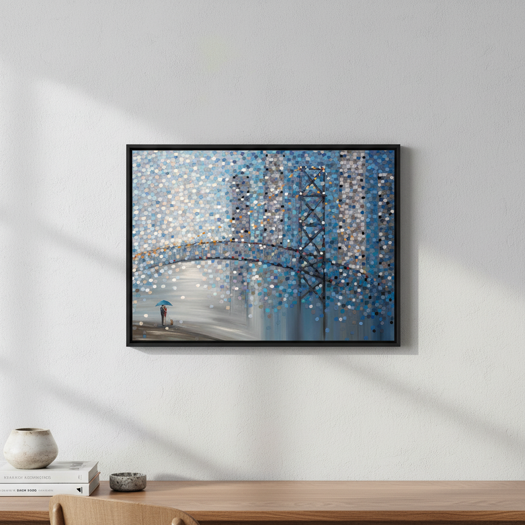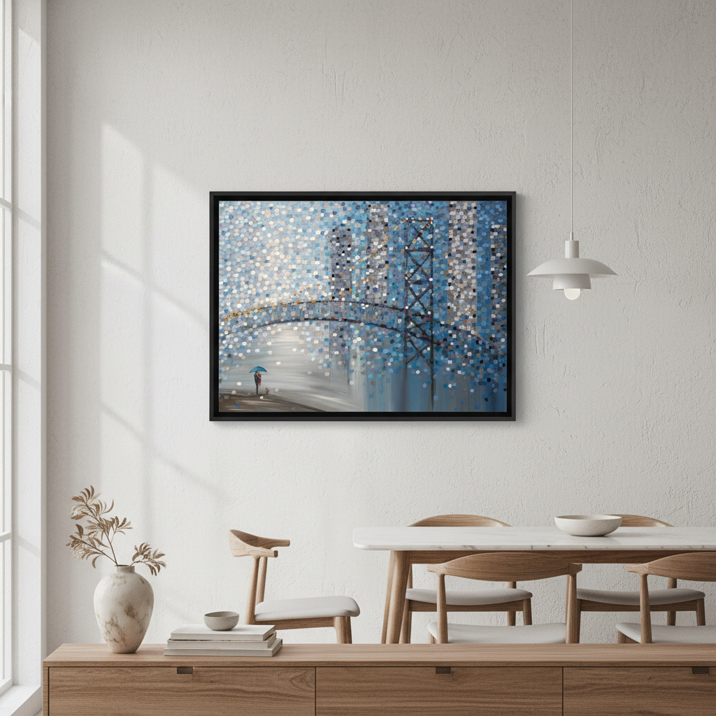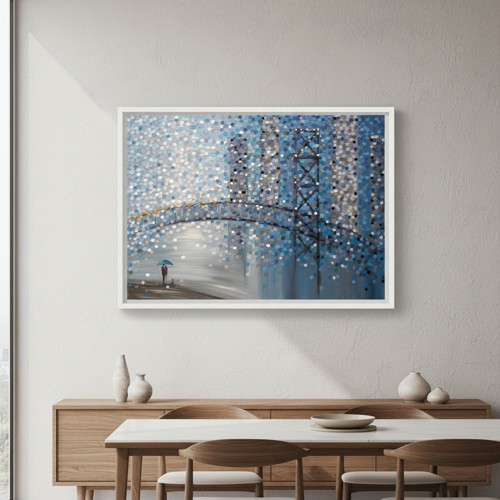 Date by the Bridge by Ekaterina Ermilkina captures a contemplative moment through abstract expressionism. This striking artwork features a bridge scene with figures sheltering beneath an umbrella, rendered through dynamic circular color patterns that create visual rhythm and depth. The composition balances figurative elements with geometric abstraction, inviting viewers to interpret the interplay between human connection and atmospheric mood. Ermilkina's distinctive use of circular motifs generates movement across the canvas, transforming an intimate scene into a sophisticated meditation on companionship and shelter. An exceptional choice for collectors seeking contemporary art with emotional resonance and technical sophistication.