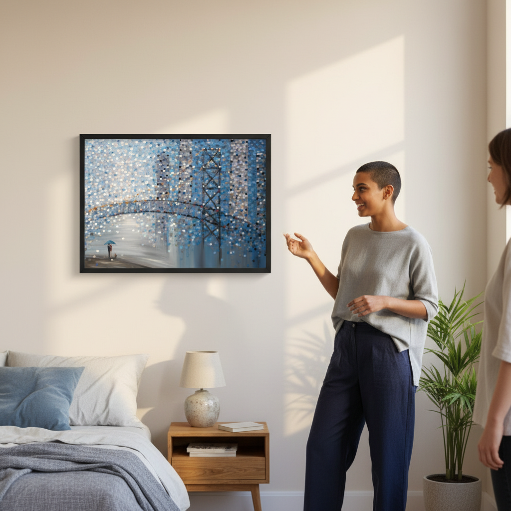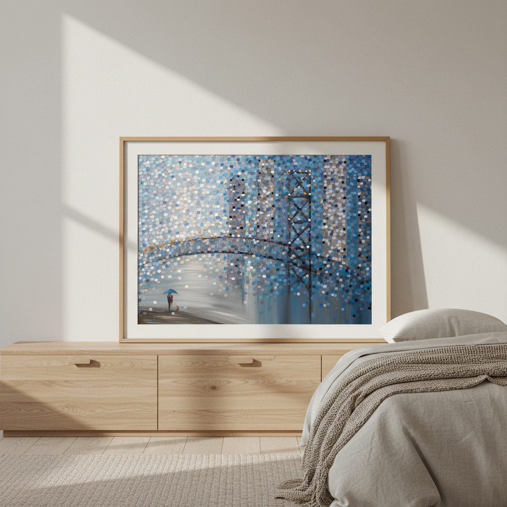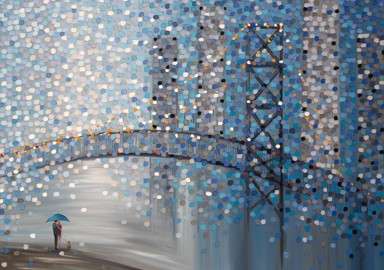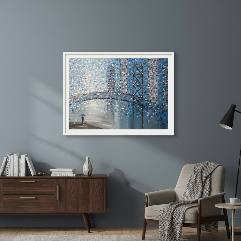 Date by the Bridge by Ekaterina Ermilkina captures a contemplative moment through abstract expressionism. This striking artwork features a bridge scene with figures sheltering beneath an umbrella, rendered through dynamic circular color patterns that create visual rhythm and depth. The composition balances figurative elements with geometric abstraction, inviting viewers to interpret the interplay between human connection and atmospheric mood. Ermilkina's distinctive use of circular motifs generates movement across the canvas, transforming an intimate scene into a sophisticated meditation on companionship and shelter. An exceptional choice for collectors seeking contemporary art with emotional resonance and technical sophistication.