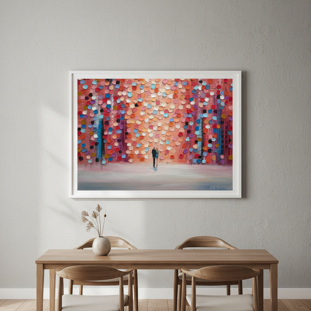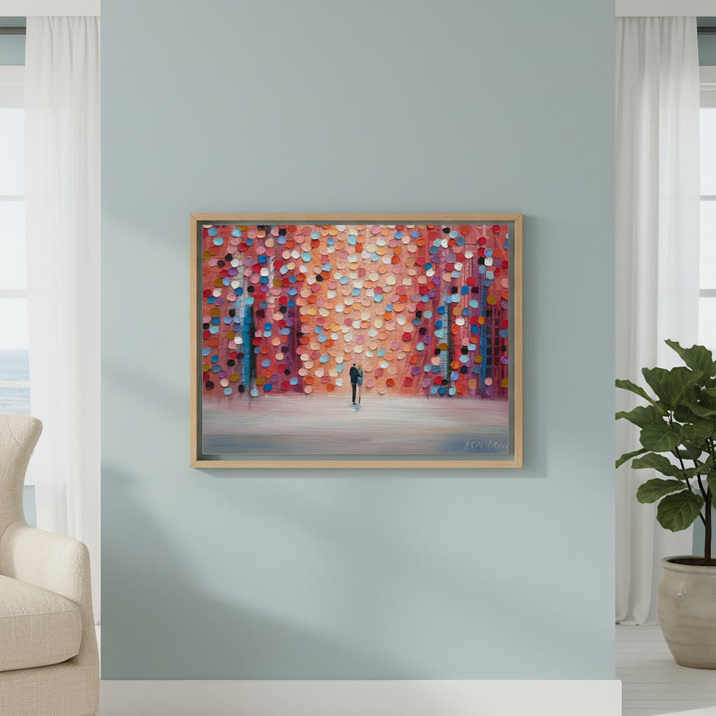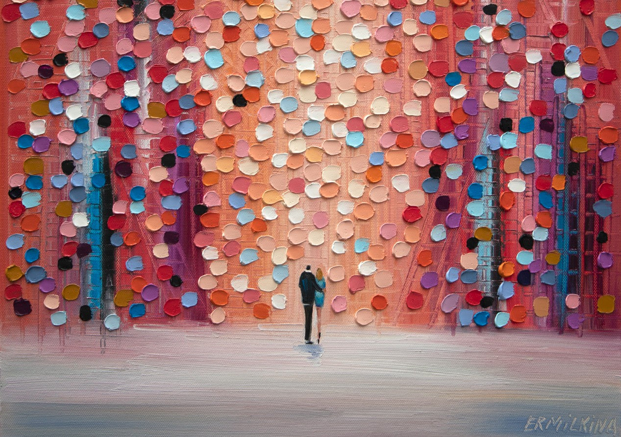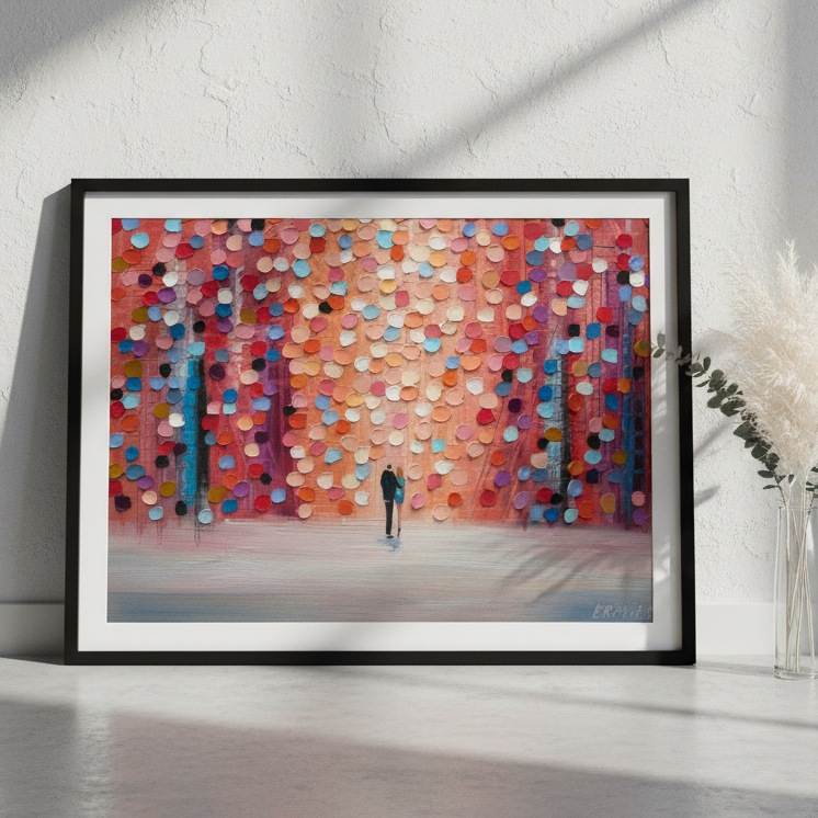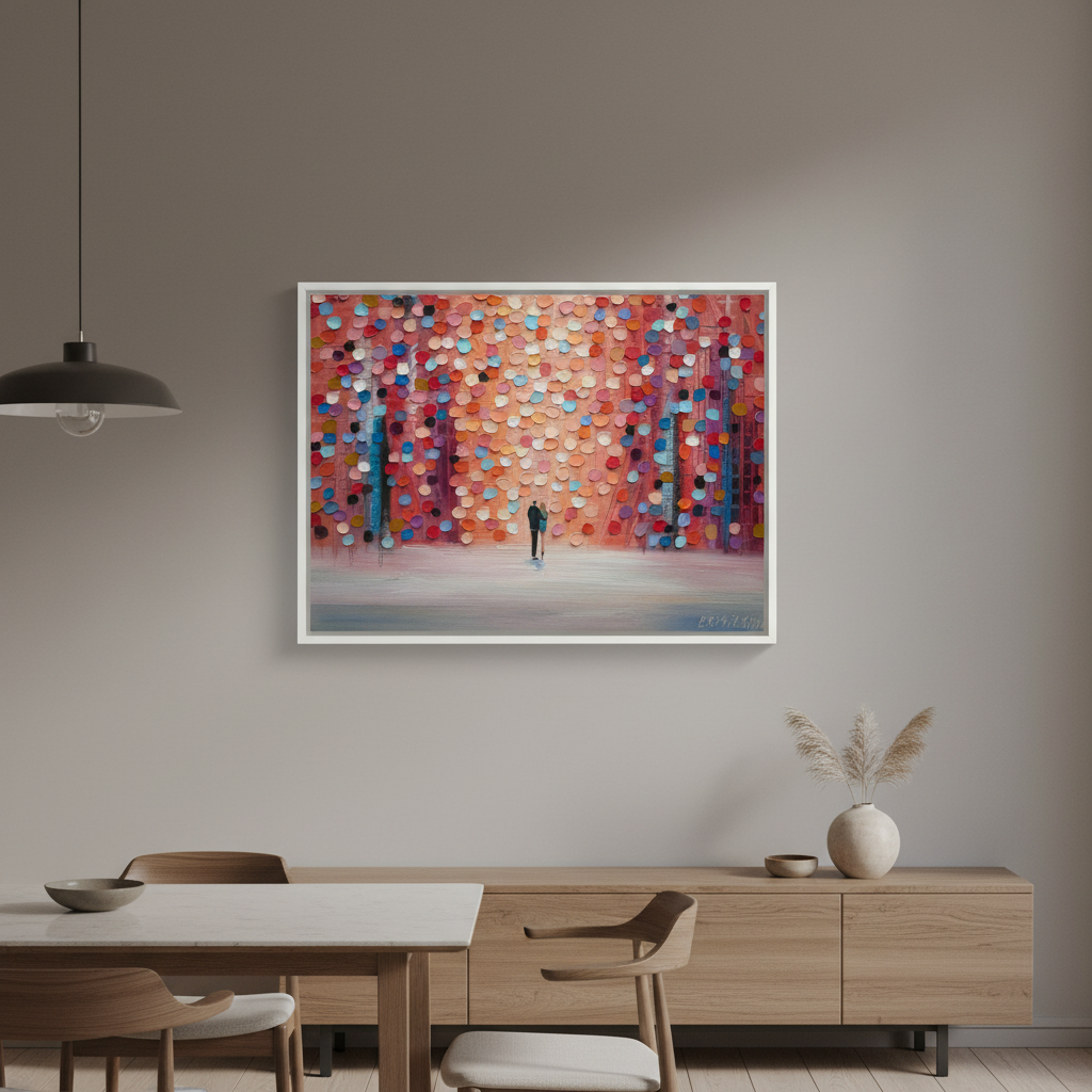 Dream on Under the Pink Rain captures a mesmerizing moment where two contemplative figures stand beneath an ethereal downpour rendered in soft pink hues. The composition features bold, concentric circular patterns in vibrant jewel tones—emerald, sapphire, and gold—that dance across the canvas, creating a dreamlike atmosphere. Ekaterina Ermilkina's masterful use of colour and form transforms an ordinary scene into something transcendent, inviting viewers to pause and reflect. This striking piece brings sophisticated visual intrigue to any space, perfect for collectors seeking contemporary art that balances abstraction with narrative depth.