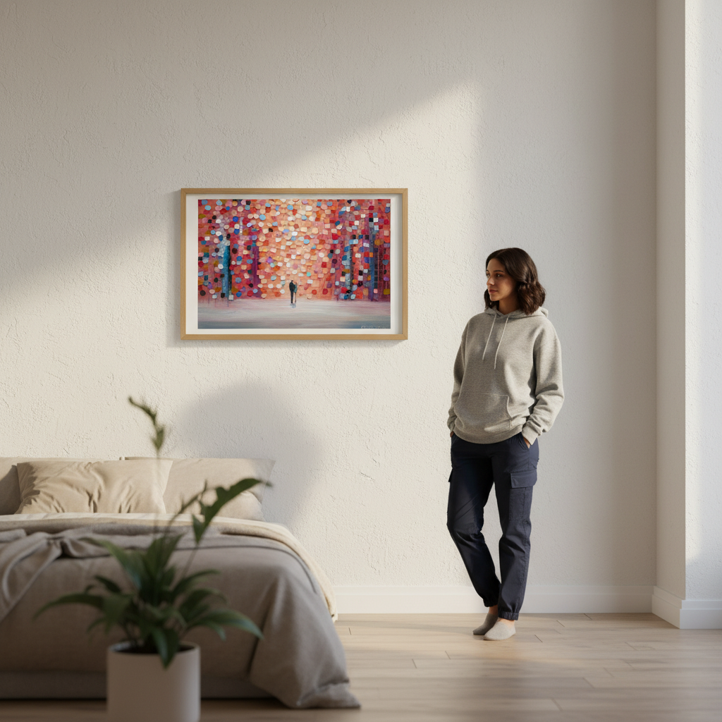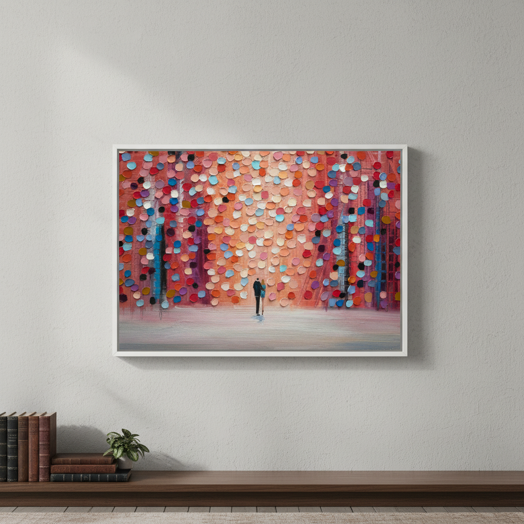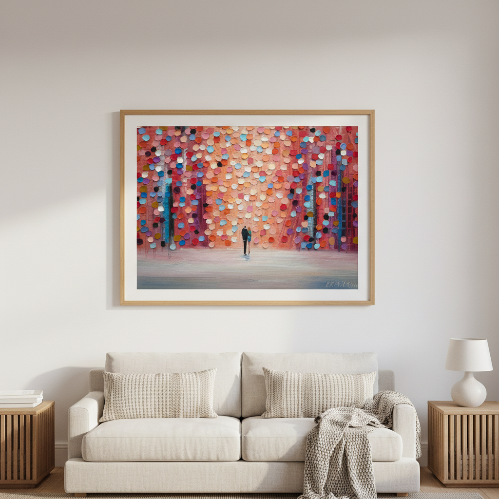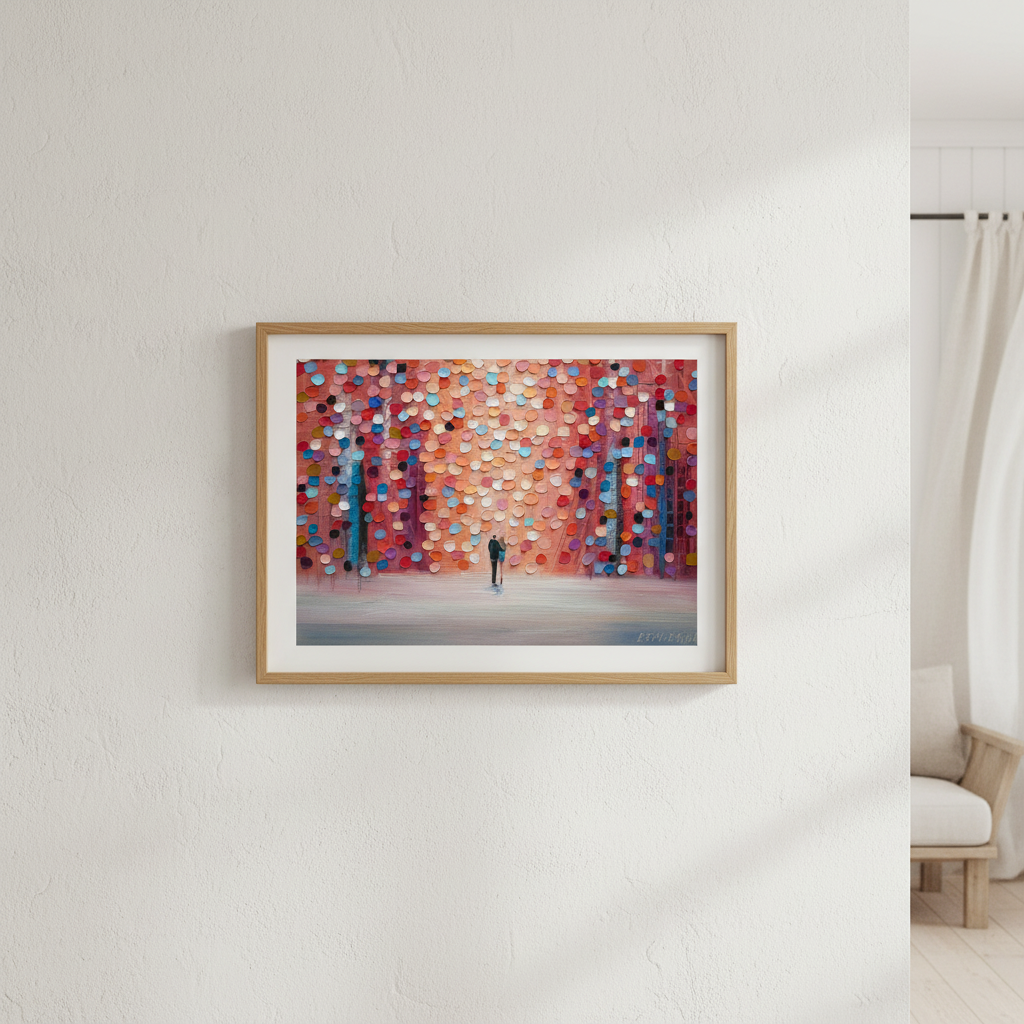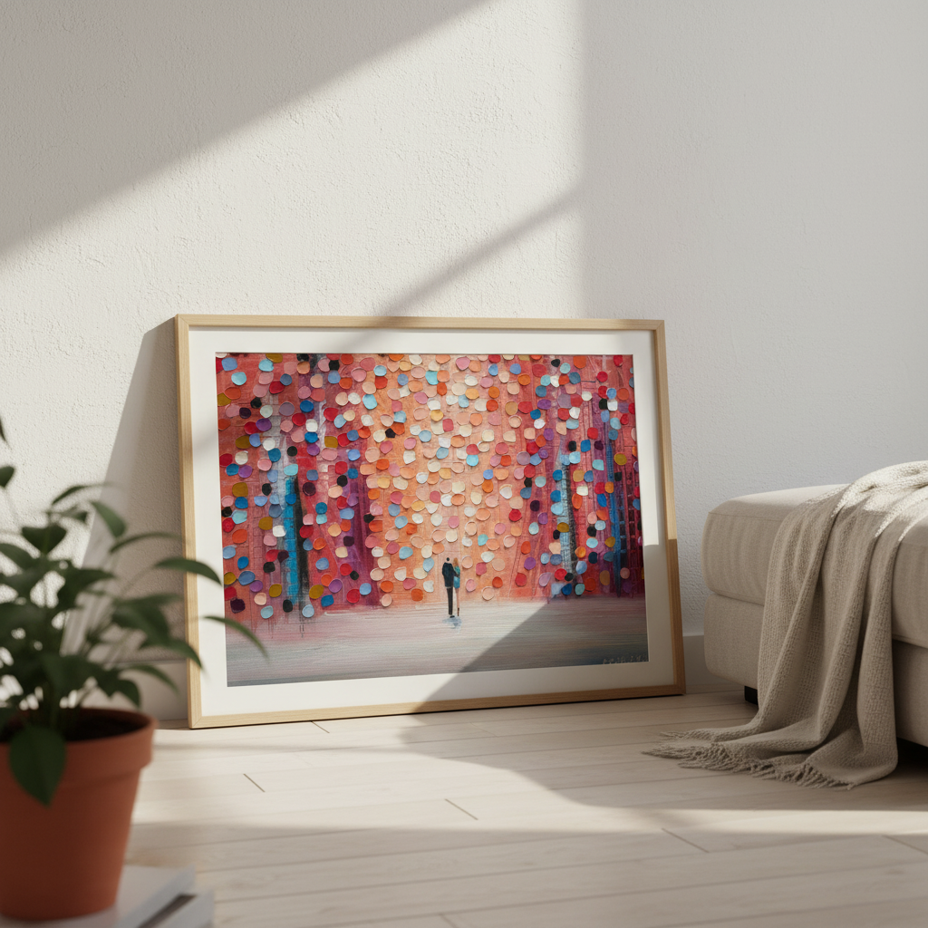 Dream on Under the Pink Rain captures a mesmerizing moment where two contemplative figures stand beneath an ethereal downpour rendered in soft pink hues. The composition features bold, concentric circular patterns in vibrant jewel tones—emerald, sapphire, and gold—that dance across the canvas, creating a dreamlike atmosphere. Ekaterina Ermilkina's masterful use of colour and form transforms an ordinary scene into something transcendent, inviting viewers to pause and reflect. This striking piece brings sophisticated visual intrigue to any space, perfect for collectors seeking contemporary art that balances abstraction with narrative depth.