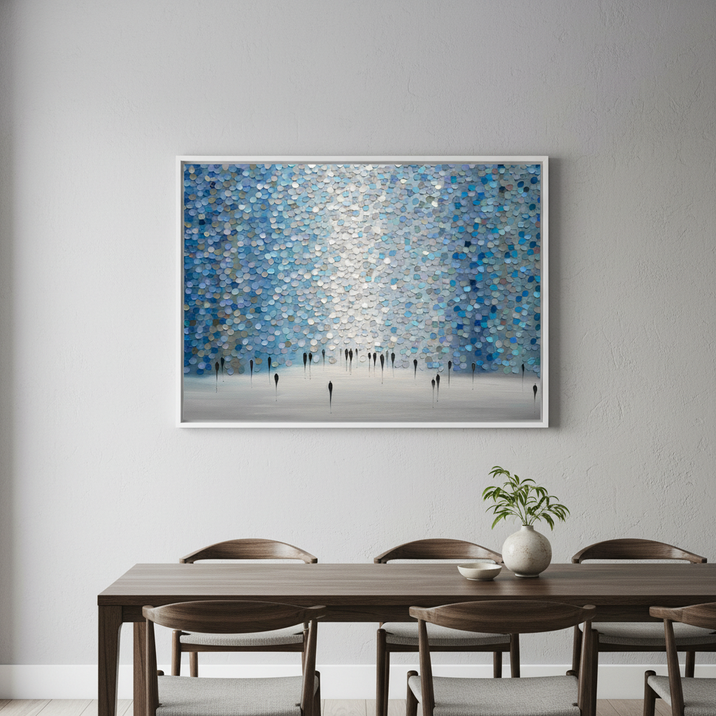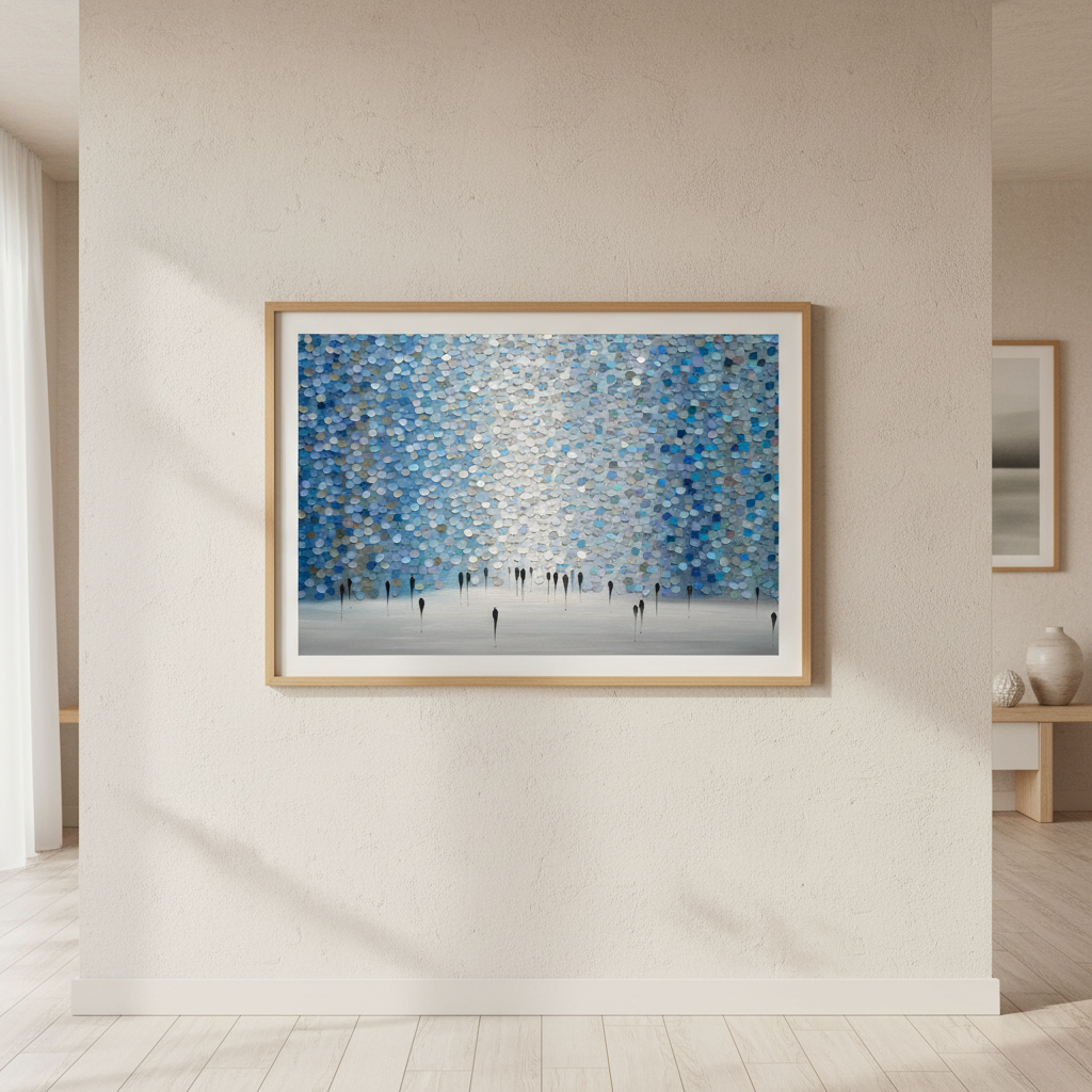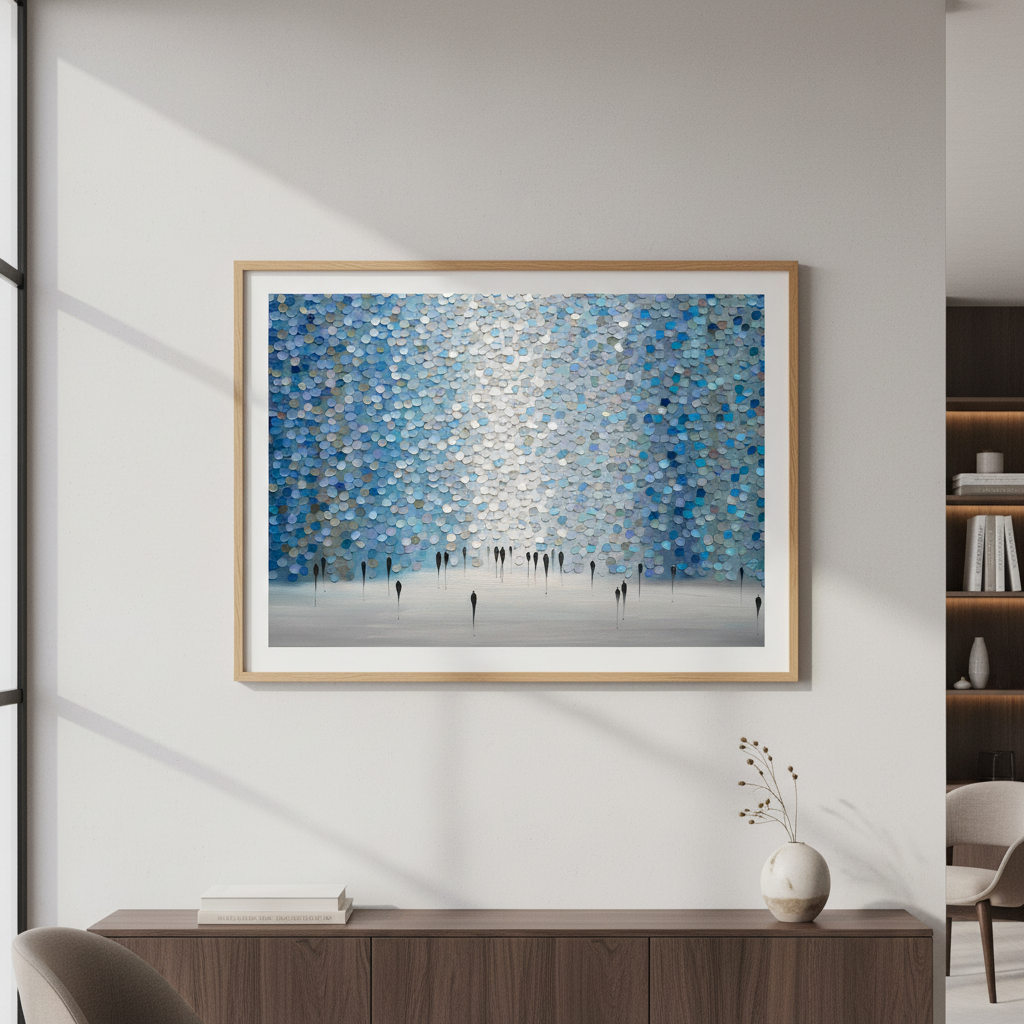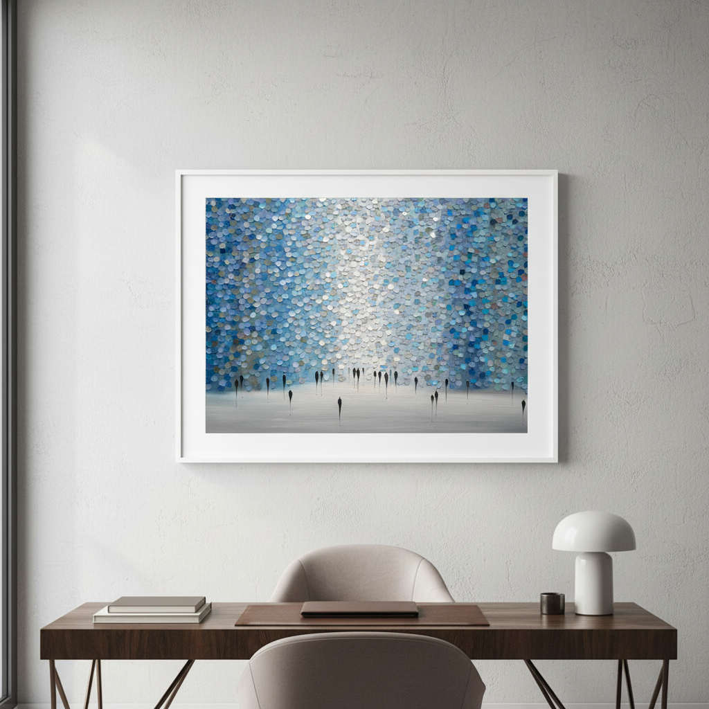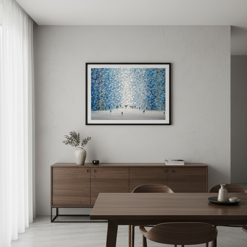 Dreamscape by Ekaterina Ermilkina presents a sophisticated wall composition featuring interlocking blue and gray circular tiles arranged in a rhythmic pattern, punctuated by bold black vertical elements. This contemporary design creates visual depth and movement, transforming any space with its geometric precision. The interplay between cool tones and stark linear accents delivers a modern aesthetic that complements minimalist and transitional interiors. Ideal for feature walls or gallery-style installations, this artwork balances organic circular forms with architectural structure, offering a distinctive focal point for discerning design enthusiasts.
