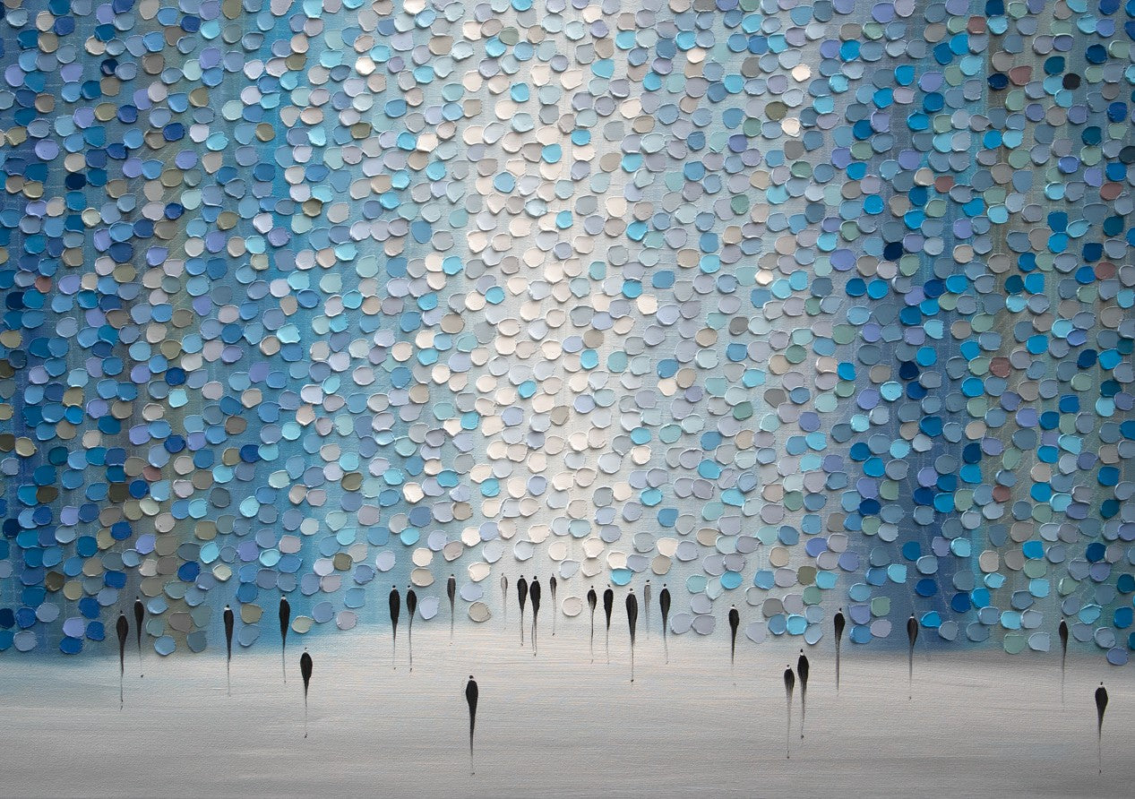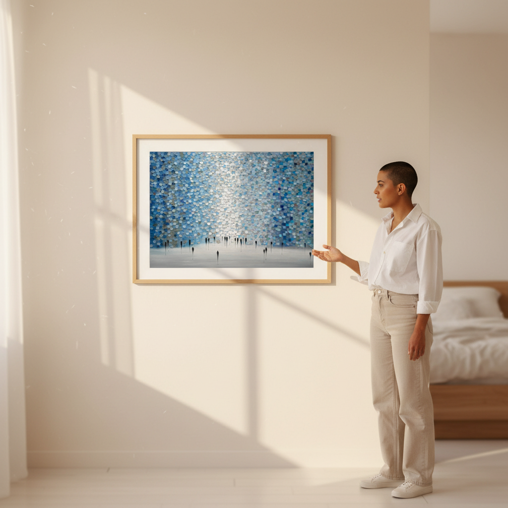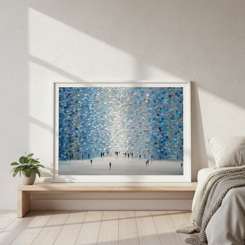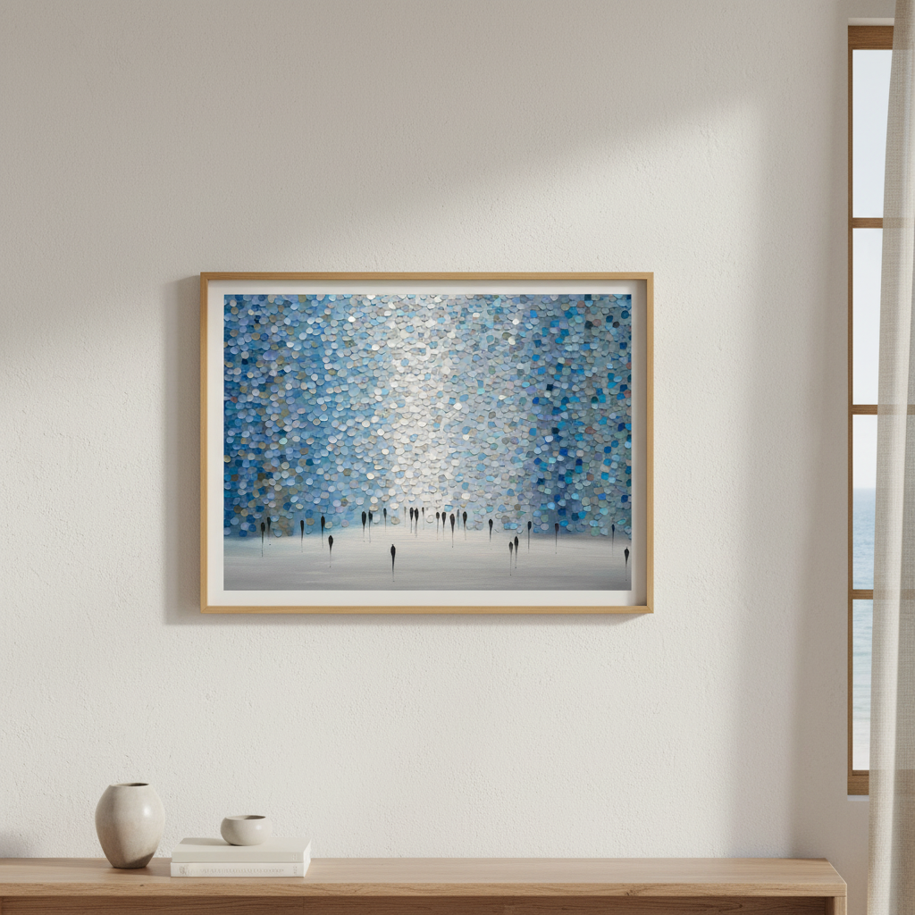 Dreamscape by Ekaterina Ermilkina presents a sophisticated wall composition featuring interlocking blue and gray circular tiles arranged in a rhythmic pattern, punctuated by bold black vertical elements. This contemporary design creates visual depth and movement, transforming any space with its geometric precision. The interplay between cool tones and stark linear accents delivers a modern aesthetic that complements minimalist and transitional interiors. Ideal for feature walls or gallery-style installations, this artwork balances organic circular forms with architectural structure, offering a distinctive focal point for discerning design enthusiasts.