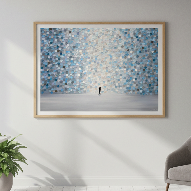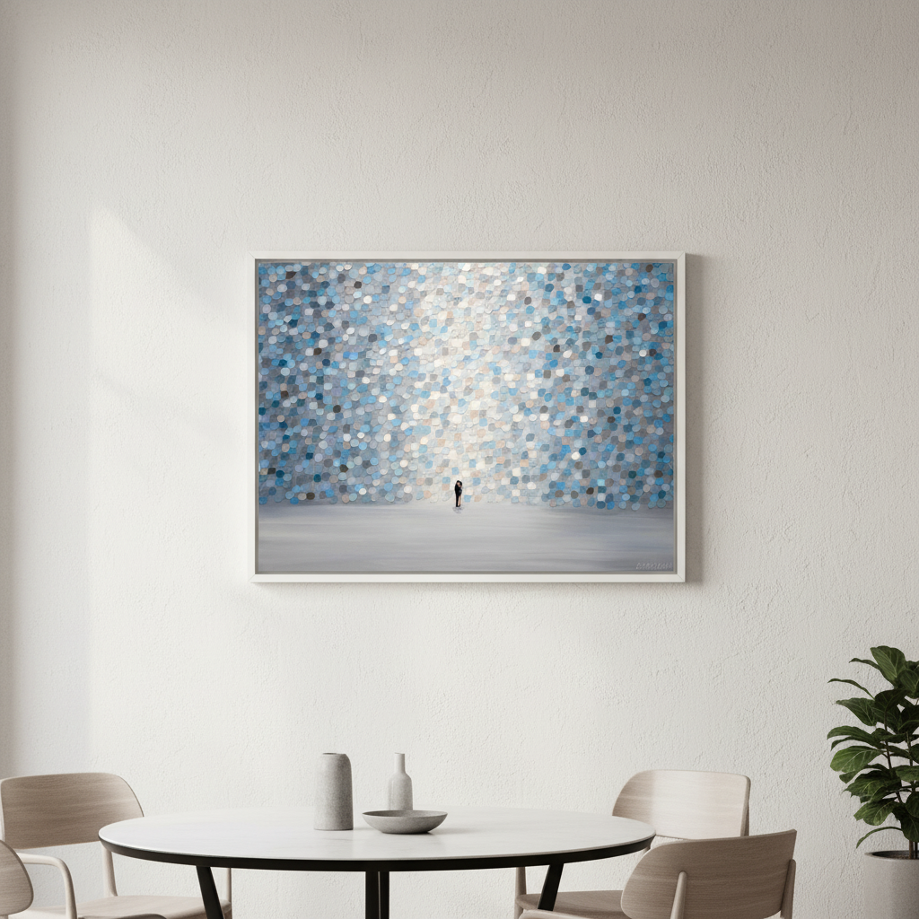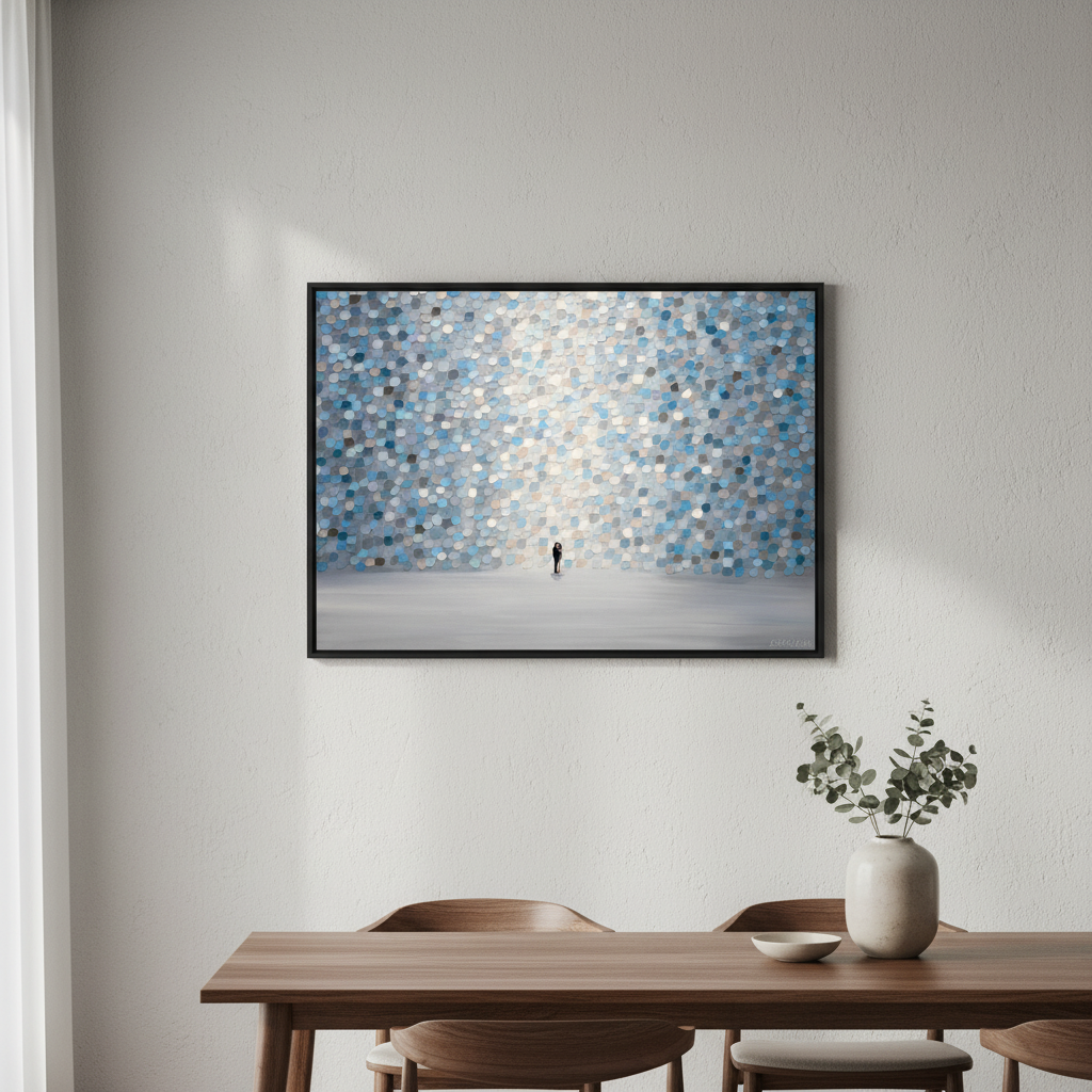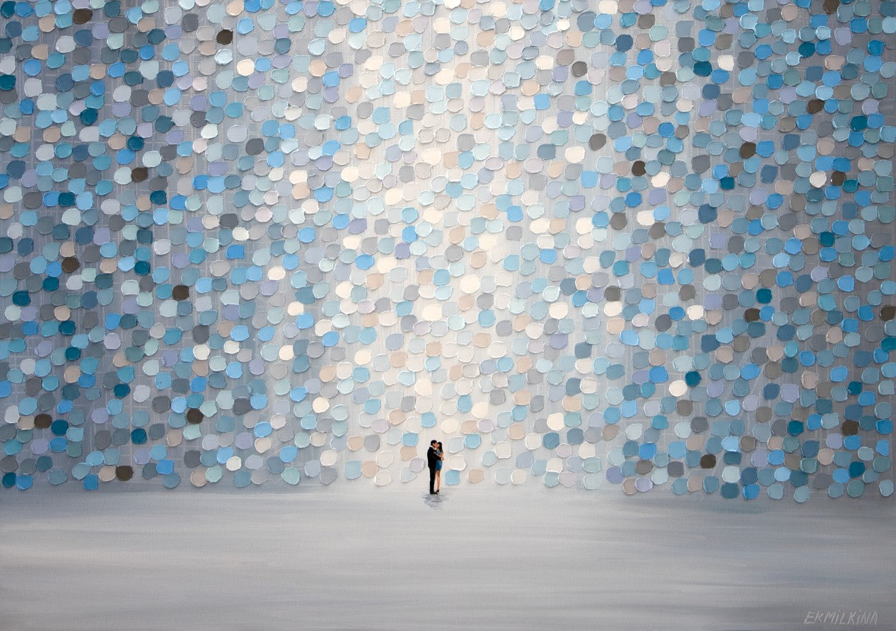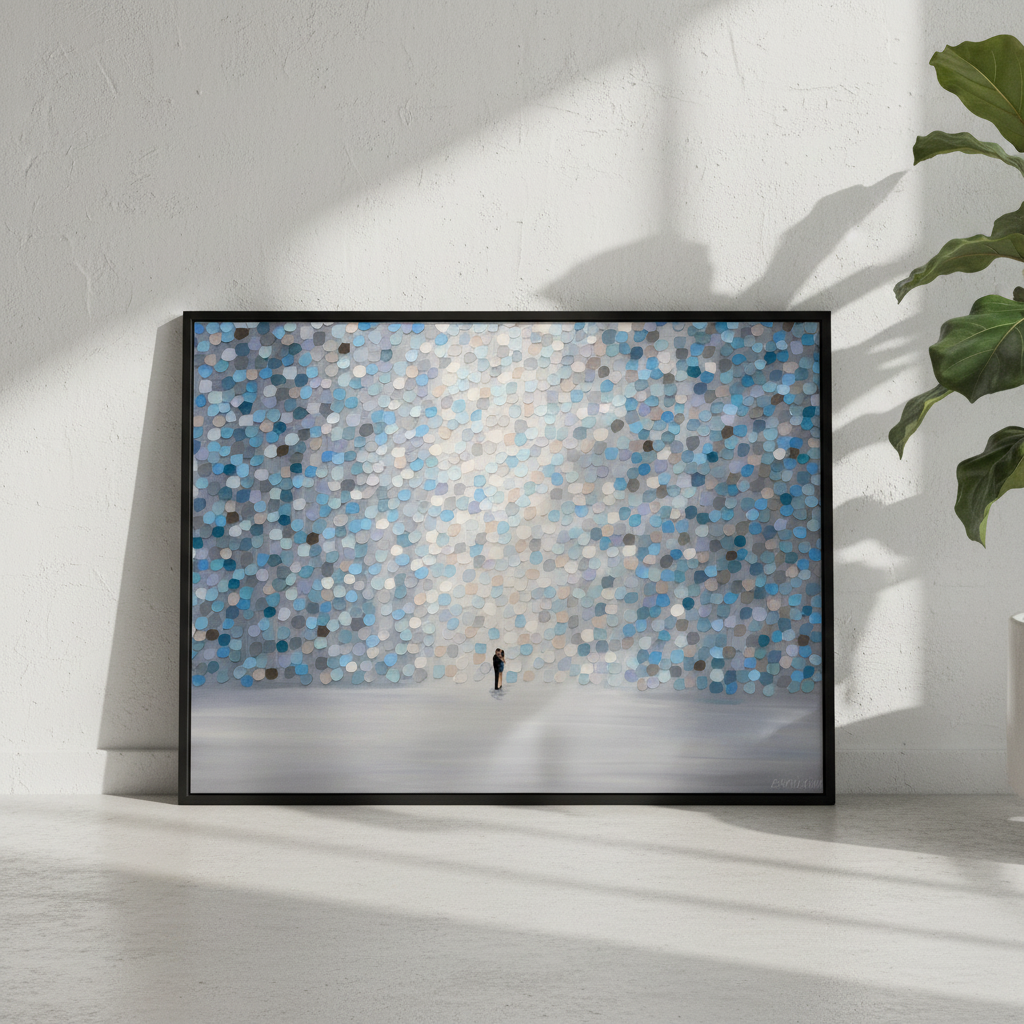 Kiss in the Moonlight by Ekaterina Ermilkina captures an ethereal moment through a sophisticated composition of blue and gray circular forms. This contemporary artwork creates visual rhythm and depth, drawing the viewer into an intimate nocturnal scene. The interplay of cool tones and geometric patterns establishes a modern aesthetic while maintaining emotional resonance. Perfect for creating a focal point in living spaces, bedrooms, or creative studios, this piece elevates interior design with its artistic sophistication and contemplative quality.