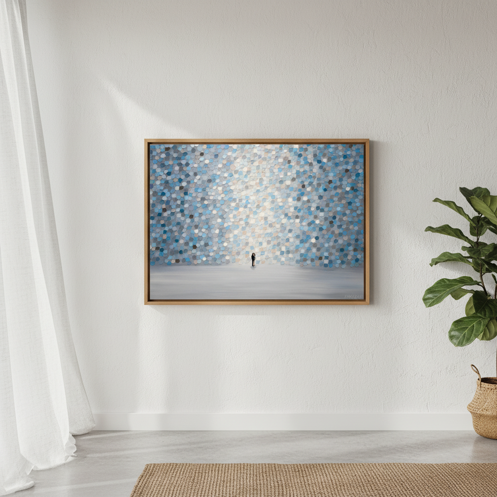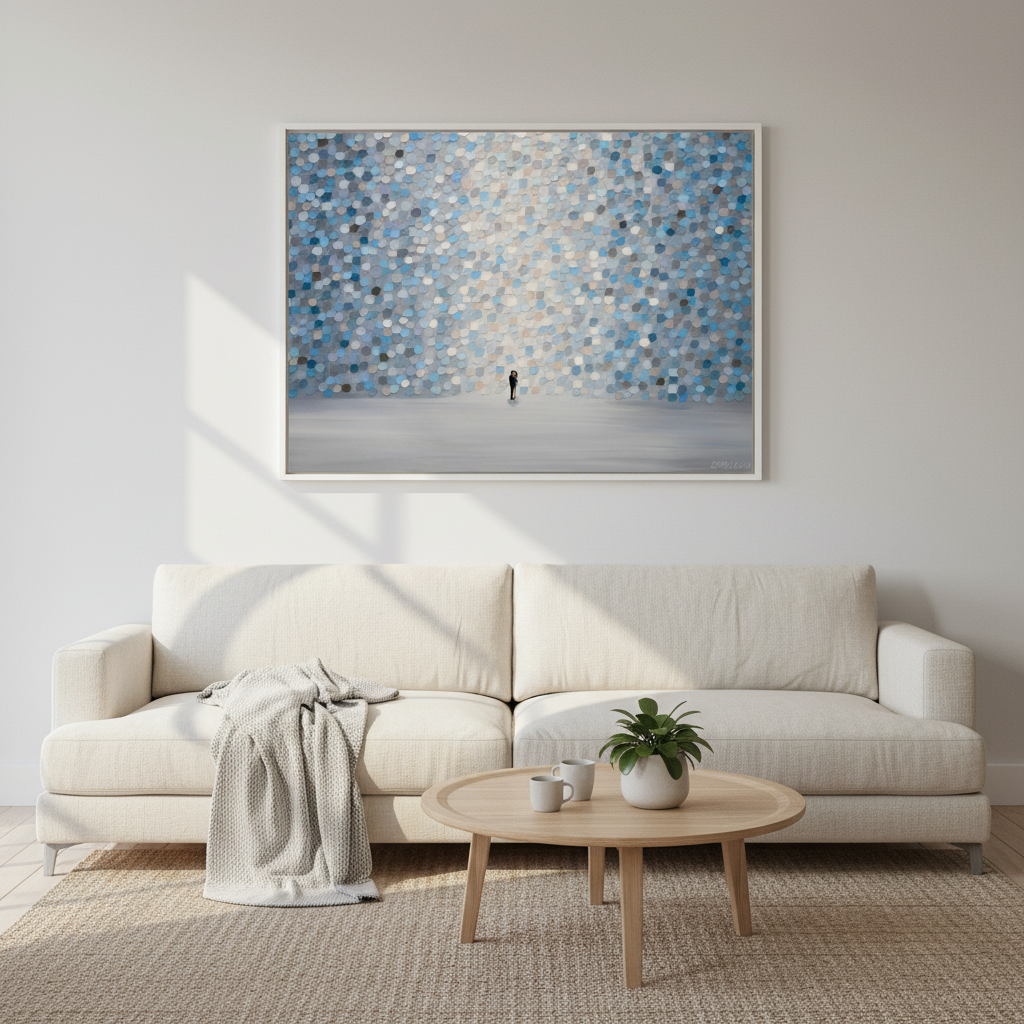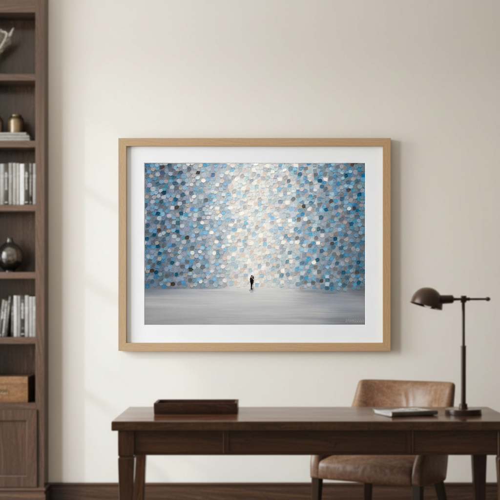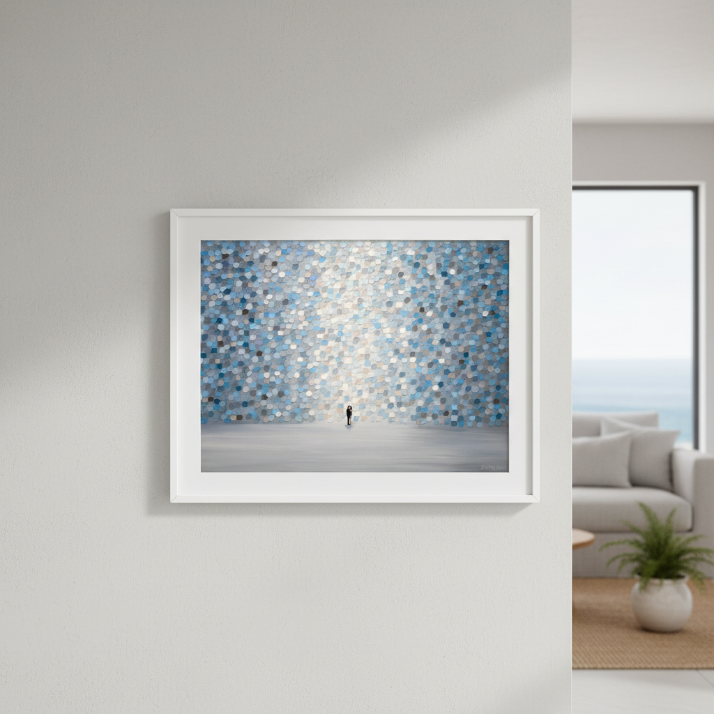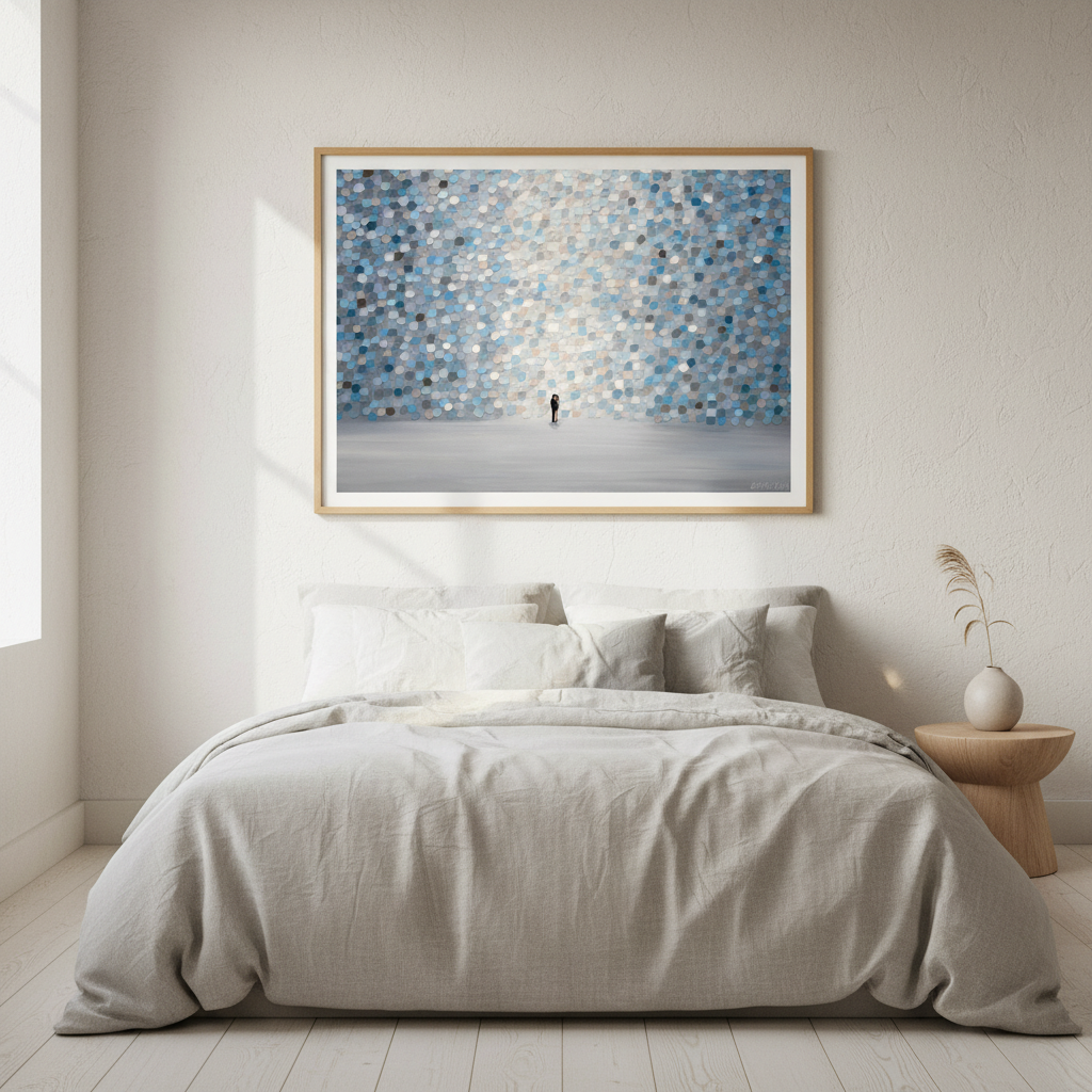 Kiss in the Moonlight by Ekaterina Ermilkina captures an ethereal moment through a sophisticated composition of blue and gray circular forms. This contemporary artwork creates visual rhythm and depth, drawing the viewer into an intimate nocturnal scene. The interplay of cool tones and geometric patterns establishes a modern aesthetic while maintaining emotional resonance. Perfect for creating a focal point in living spaces, bedrooms, or creative studios, this piece elevates interior design with its artistic sophistication and contemplative quality.