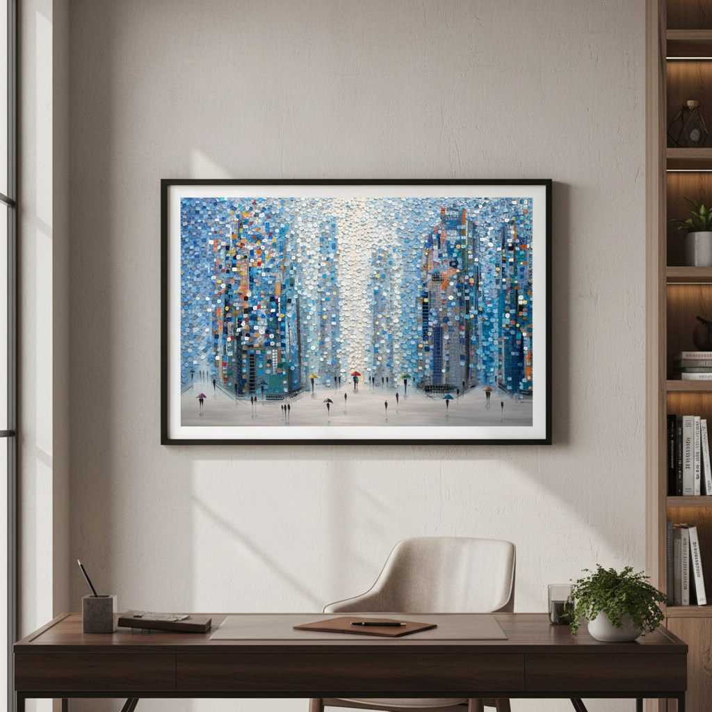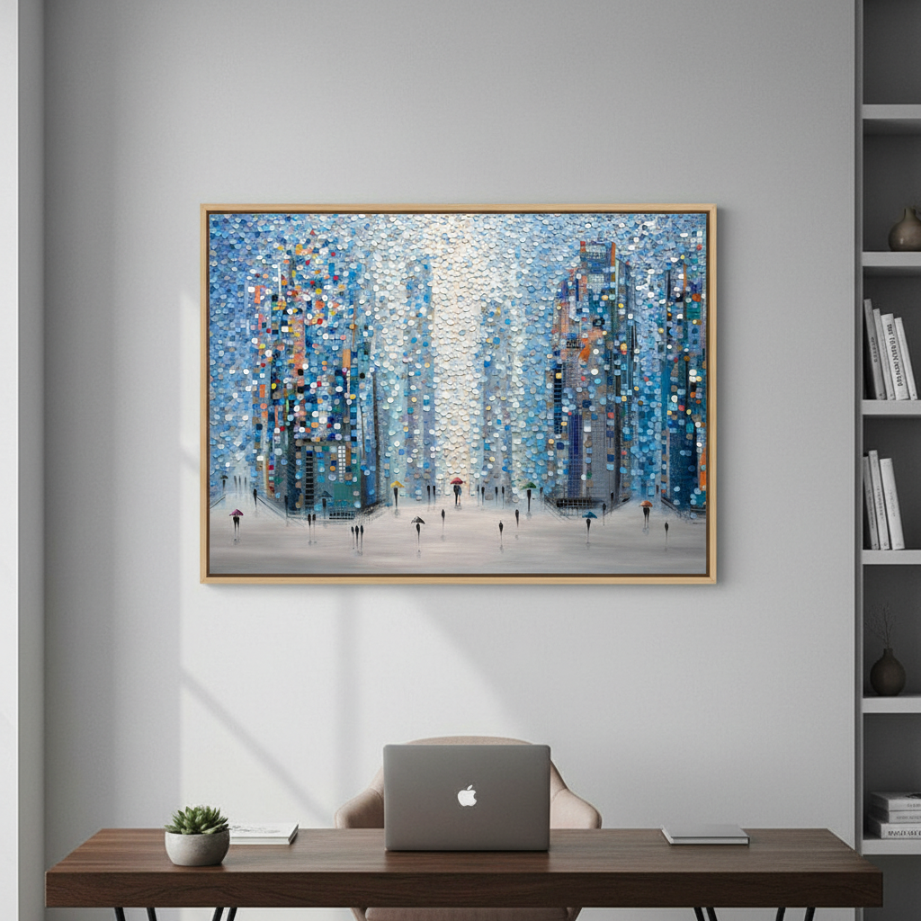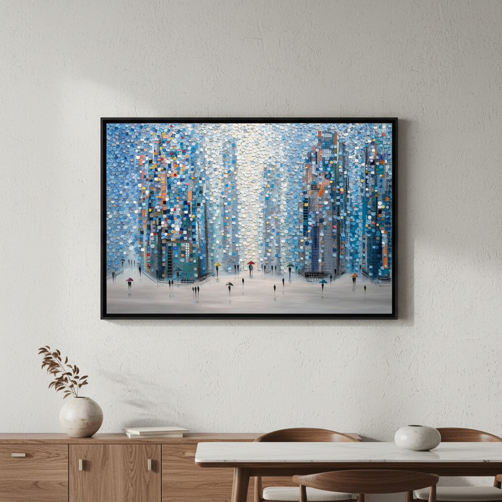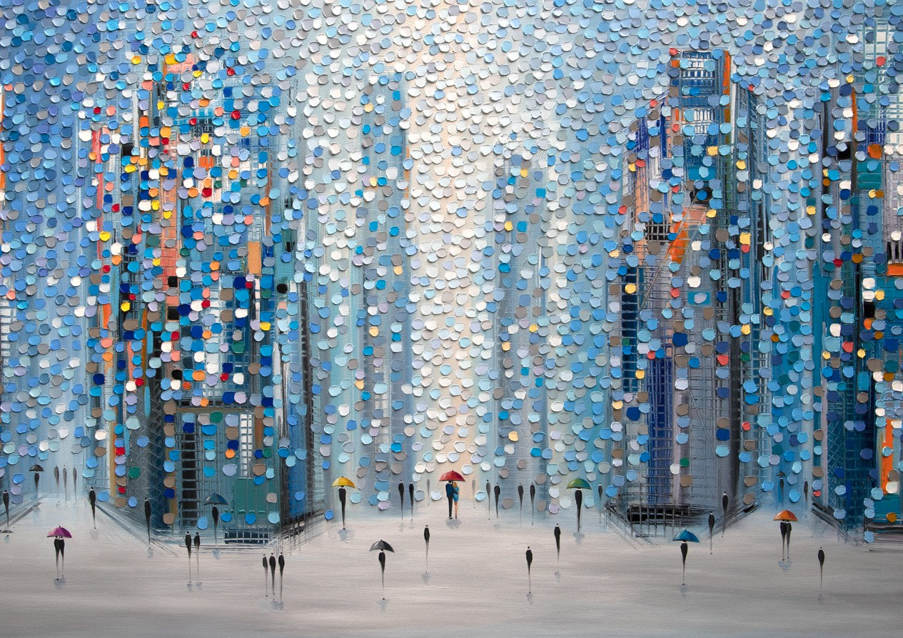 Metropolitan Dreams captures an imaginative urban landscape where architectural forms dissolve into vibrant circular motifs. This striking composition by Ekaterina Ermilkina depicts a bustling city street animated by pedestrians navigating with umbrellas, their figures woven seamlessly into the geometric abstraction of towering buildings. The interplay of bold, saturated colours creates visual rhythm and movement, transforming a familiar metropolitan scene into a contemporary art piece. Ideal for modern interiors seeking statement-making wall art that balances sophistication with playful artistic expression.