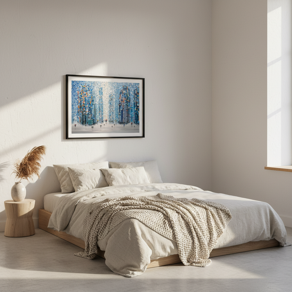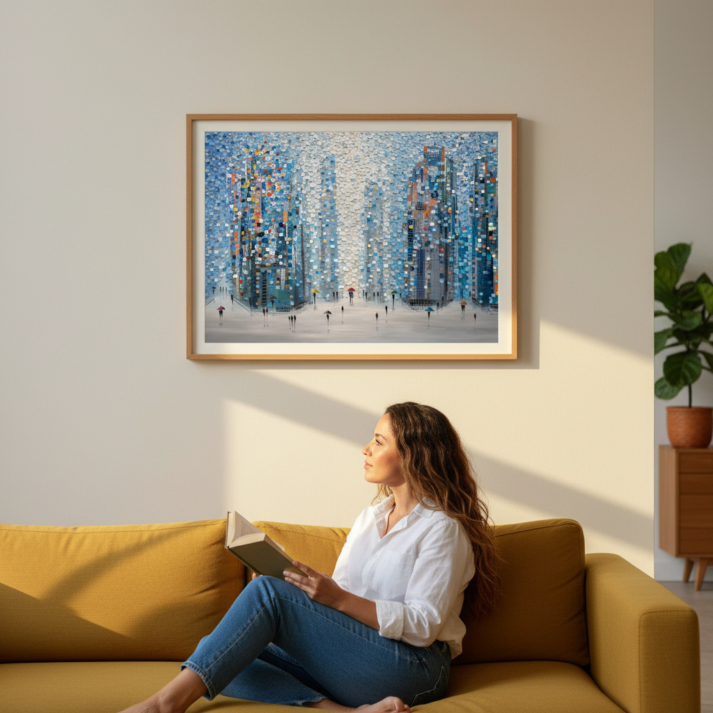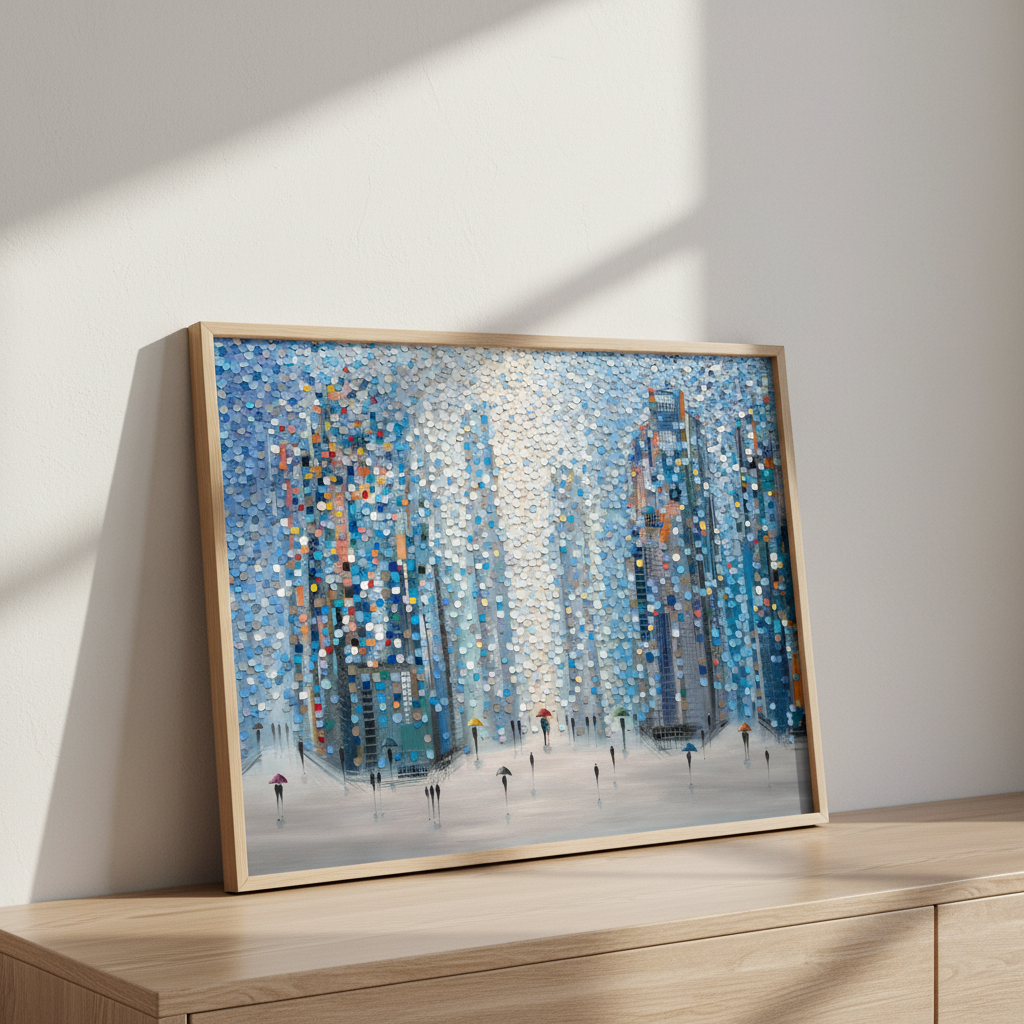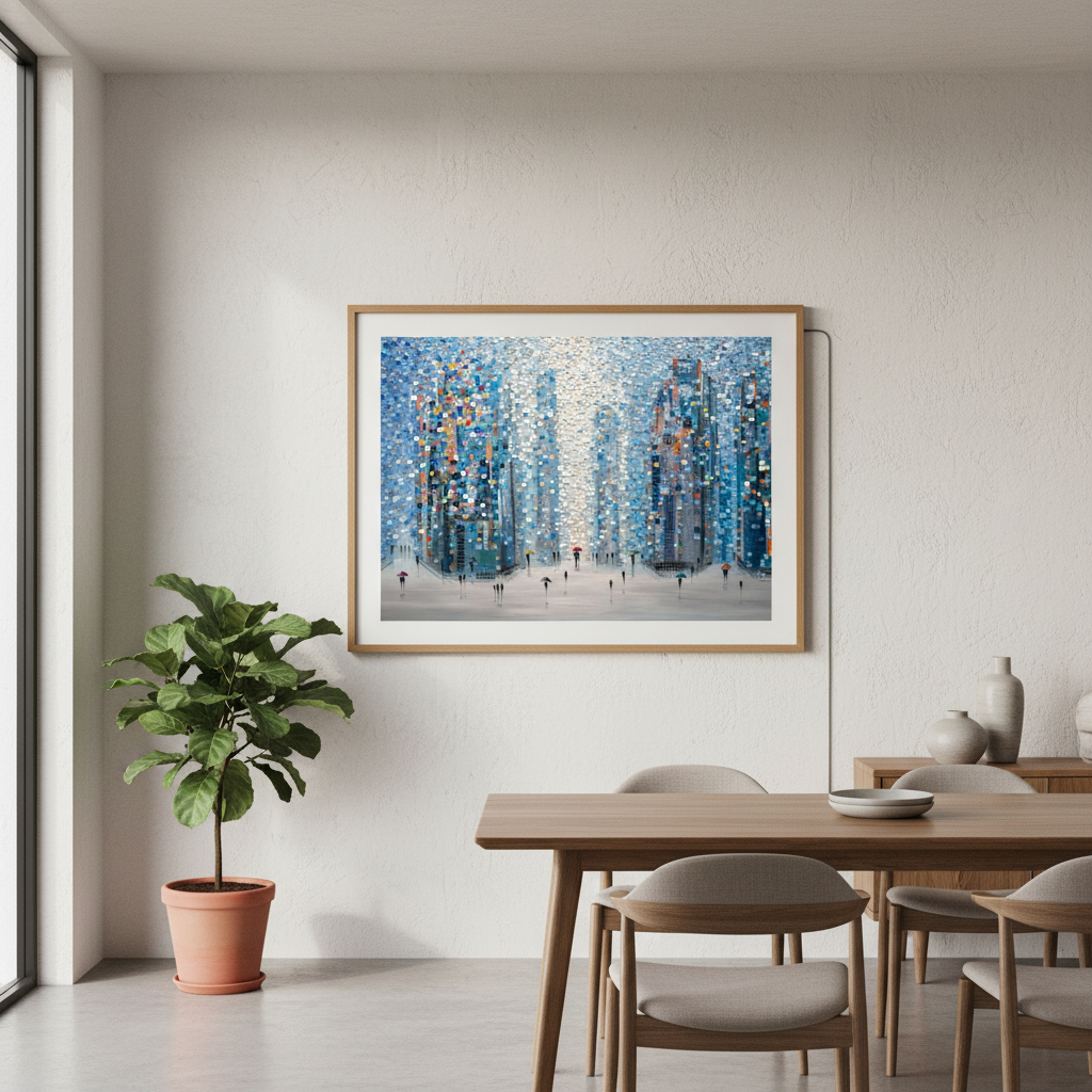 Metropolitan Dreams captures an imaginative urban landscape where architectural forms dissolve into vibrant circular motifs. This striking composition by Ekaterina Ermilkina depicts a bustling city street animated by pedestrians navigating with umbrellas, their figures woven seamlessly into the geometric abstraction of towering buildings. The interplay of bold, saturated colours creates visual rhythm and movement, transforming a familiar metropolitan scene into a contemporary art piece. Ideal for modern interiors seeking statement-making wall art that balances sophistication with playful artistic expression.