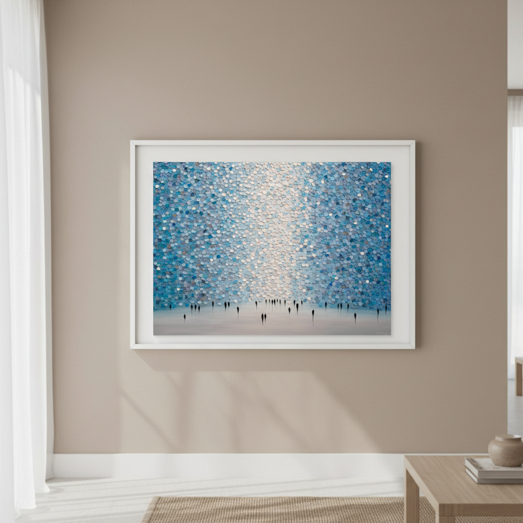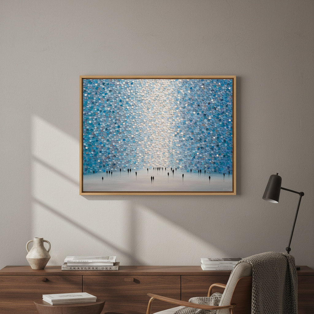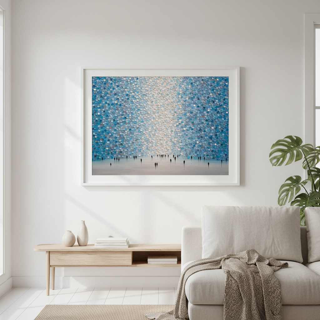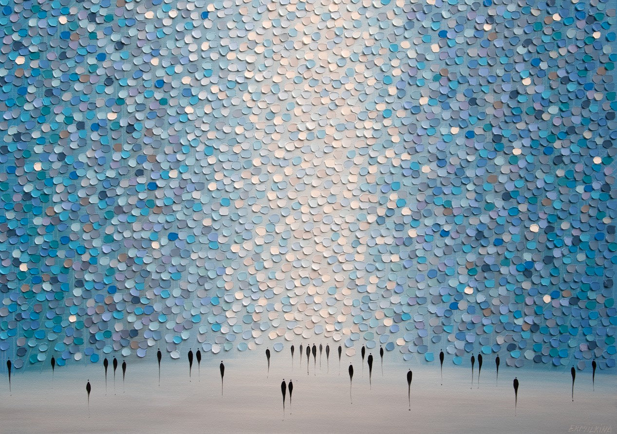 Moonlight by Ekaterina Ermilkina presents a sophisticated composition of blue and gray circular forms set against a warm beige canvas. Delicate black figures punctuate the composition, creating visual intrigue and narrative depth. This abstract work demonstrates masterful use of geometric abstraction balanced with figurative elements, inviting contemplation of the interplay between form and meaning. The restrained colour palette and measured composition make this piece a versatile addition to contemporary interiors, offering both aesthetic refinement and intellectual engagement.