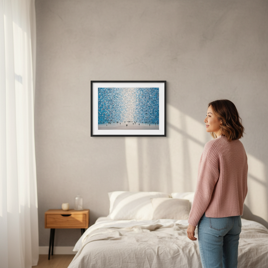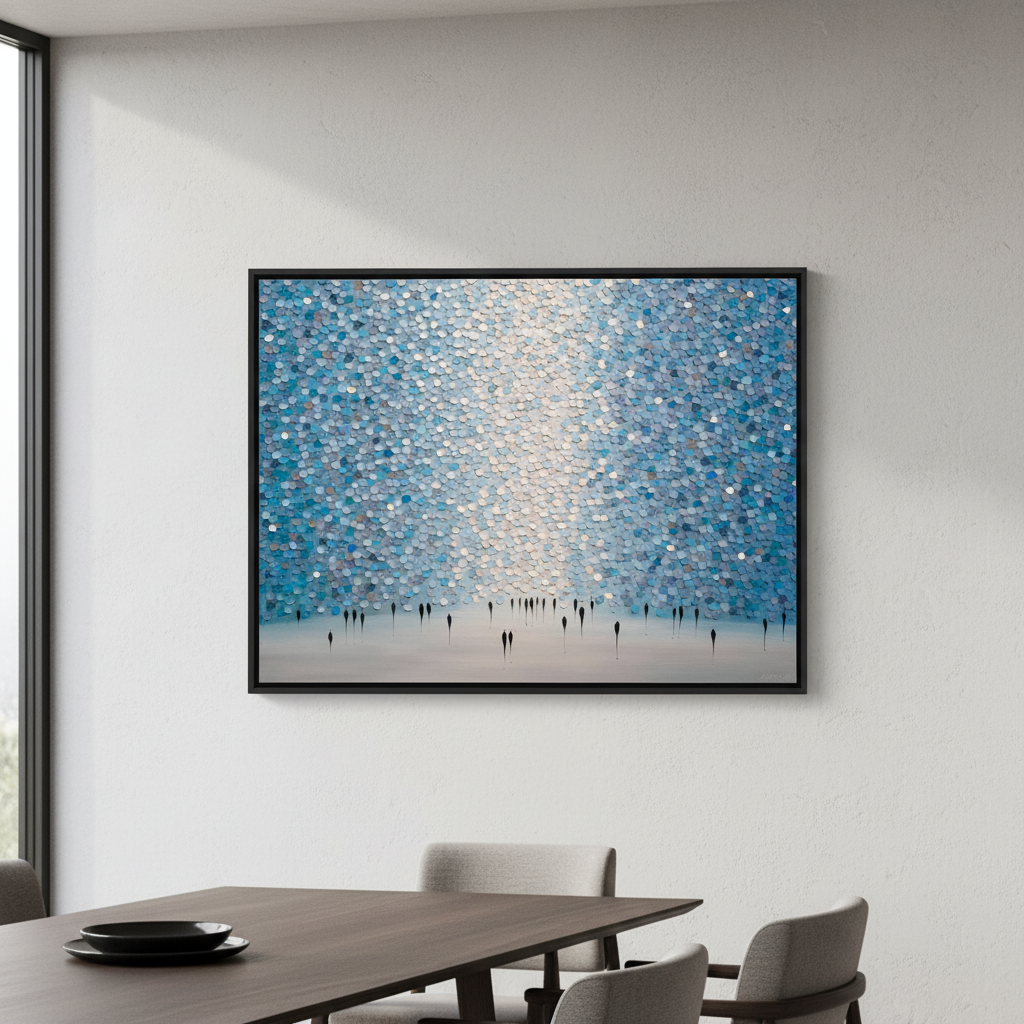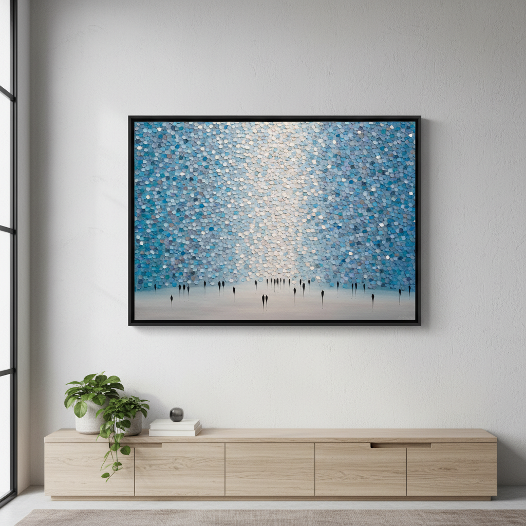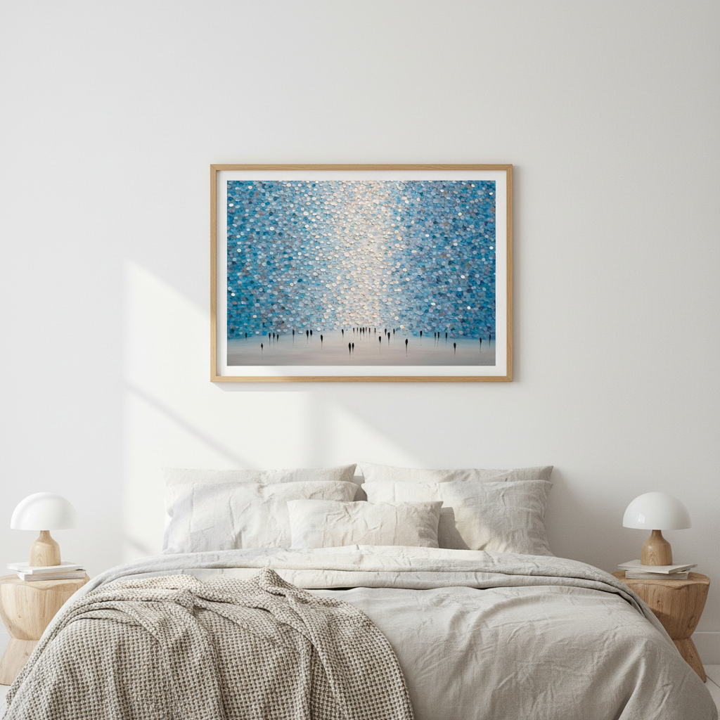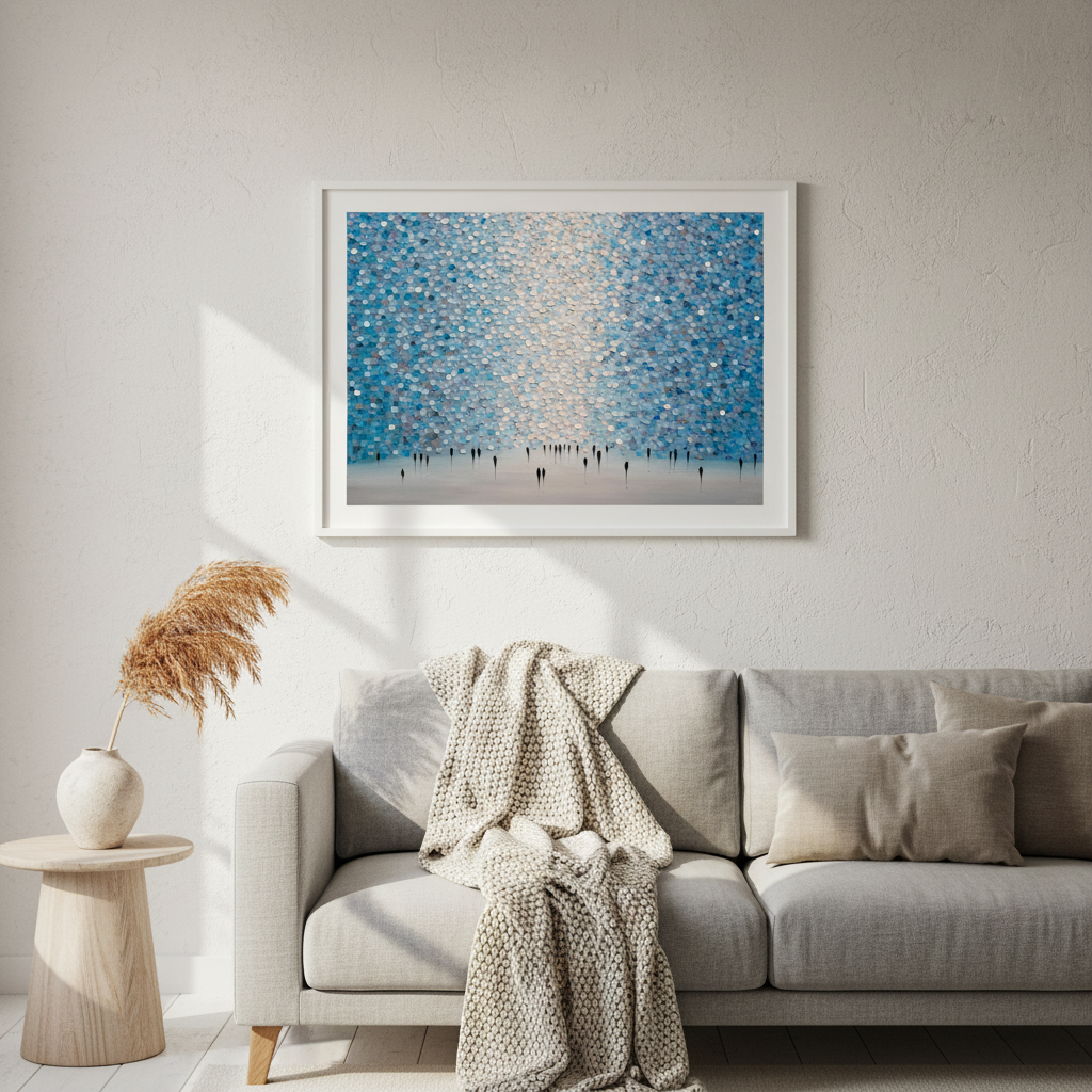 Moonlight by Ekaterina Ermilkina presents a sophisticated composition of blue and gray circular forms set against a warm beige canvas. Delicate black figures punctuate the composition, creating visual intrigue and narrative depth. This abstract work demonstrates masterful use of geometric abstraction balanced with figurative elements, inviting contemplation of the interplay between form and meaning. The restrained colour palette and measured composition make this piece a versatile addition to contemporary interiors, offering both aesthetic refinement and intellectual engagement.
