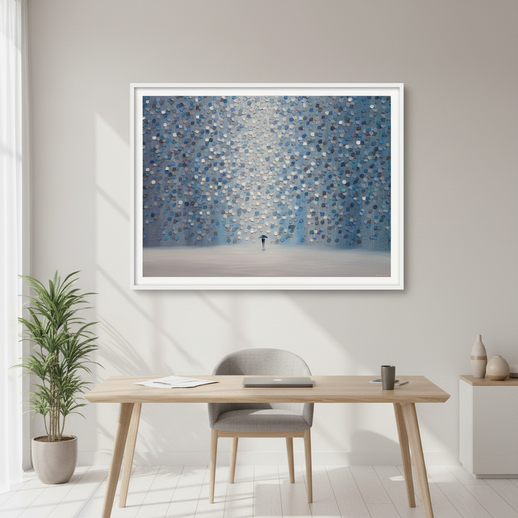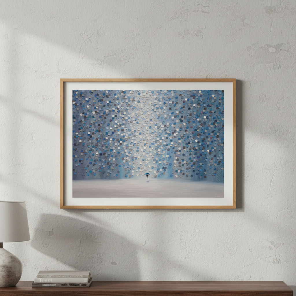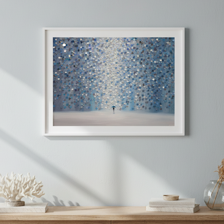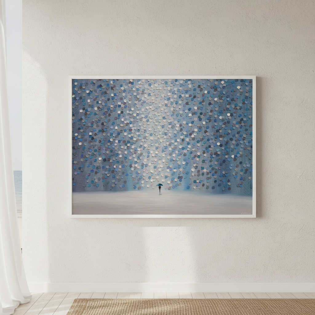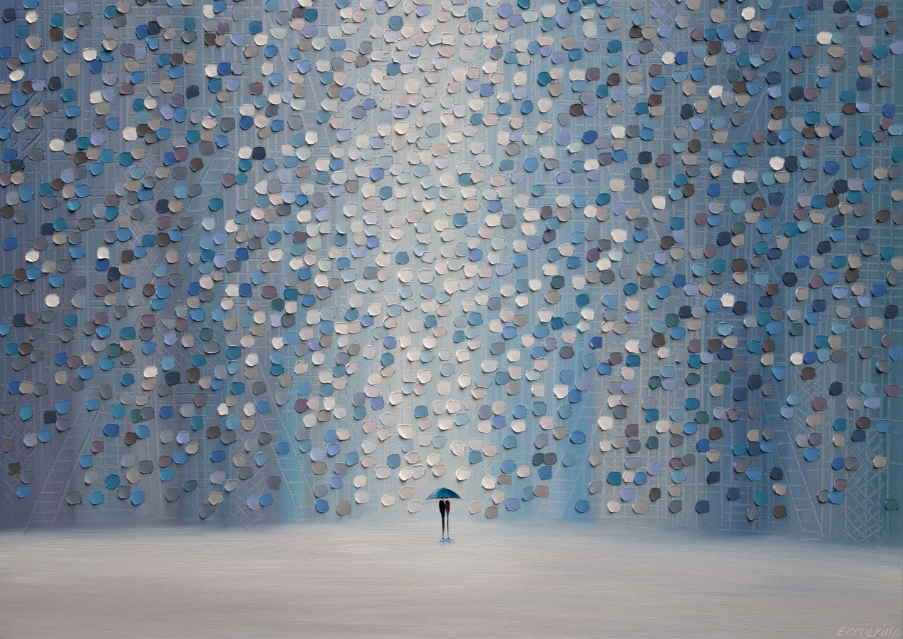 Moonlight Rain captures a contemplative moment through Ekaterina Ermilkina's distinctive artistic vision. The composition features a solitary figure sheltering beneath an umbrella, positioned against a mesmerizing backdrop of interlocking blue and gray circular patterns. These geometric forms create rhythmic visual movement, evoking the sensation of rainfall and atmospheric depth. The interplay between the figure and abstract background suggests themes of solitude, resilience, and the quiet beauty found in everyday moments. This piece combines figurative storytelling with modern geometric abstraction, making it an engaging focal point for contemporary interiors seeking both narrative depth and visual sophistication.